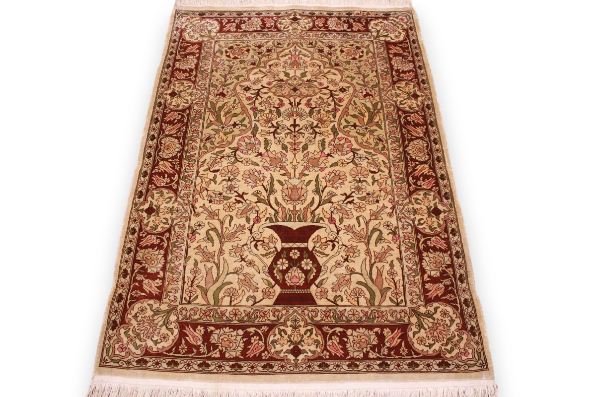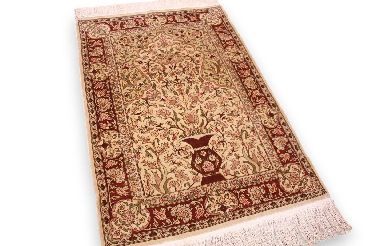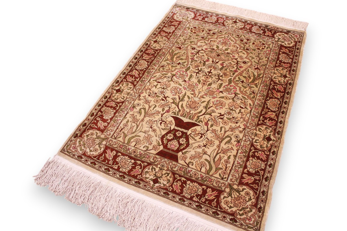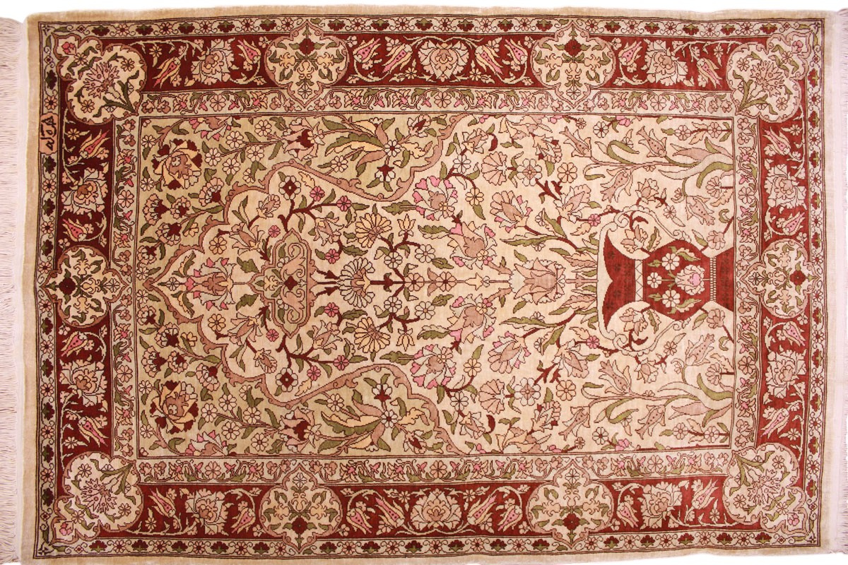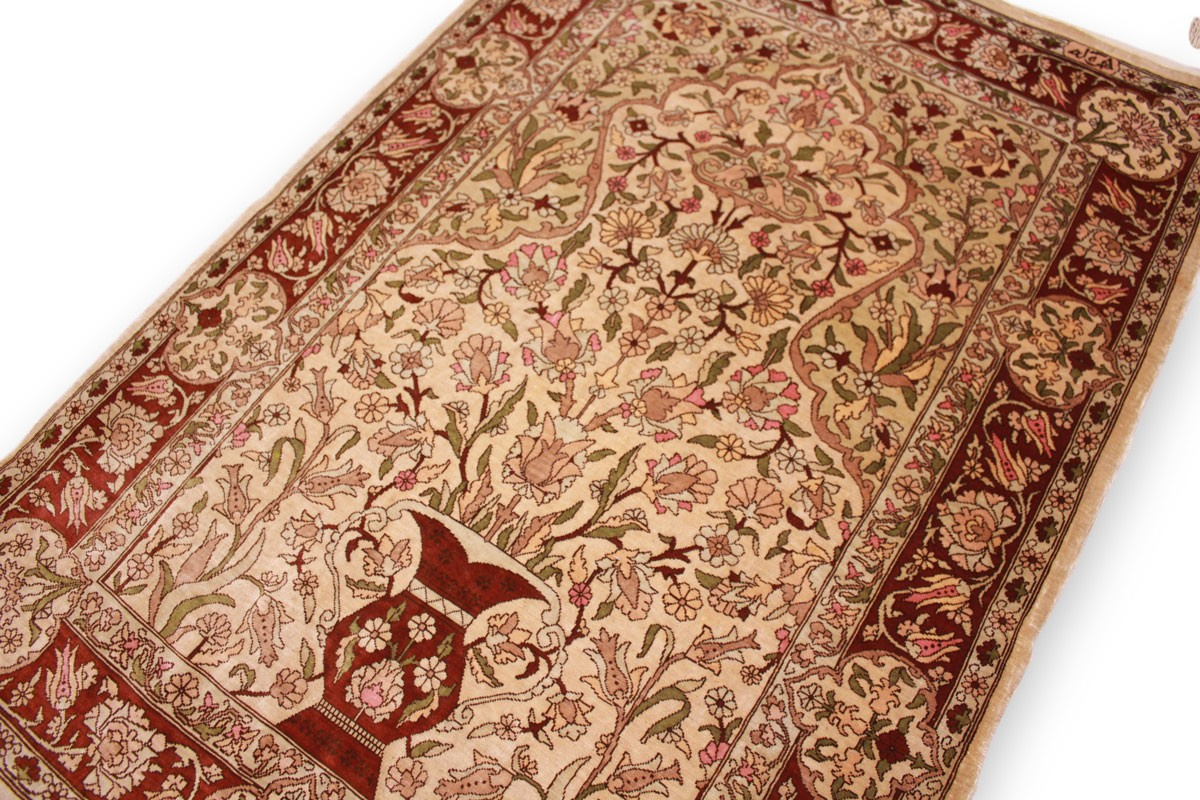 Hereke Teppiche werden sehr sorgfältig in der Türkei von hand geknüpft. Sie bestehen meist aus reiner Seide und können eine Knüpfdichte bis 5 Mio. Knoten/Qm erreichen. Hereke Teppiche sind sehr wertvoll und dekorativ. Sie werden meistens in kleineren Größen geknüpft und als Wandteppich verwendet.