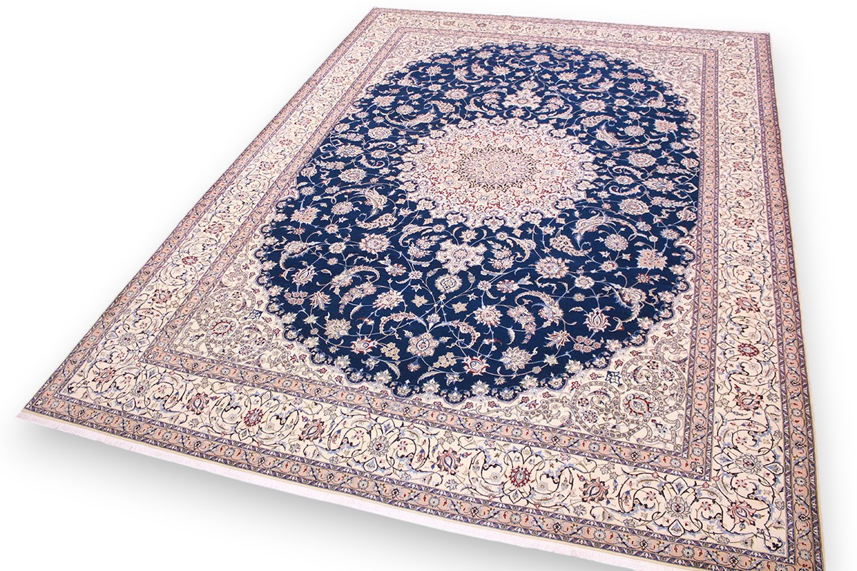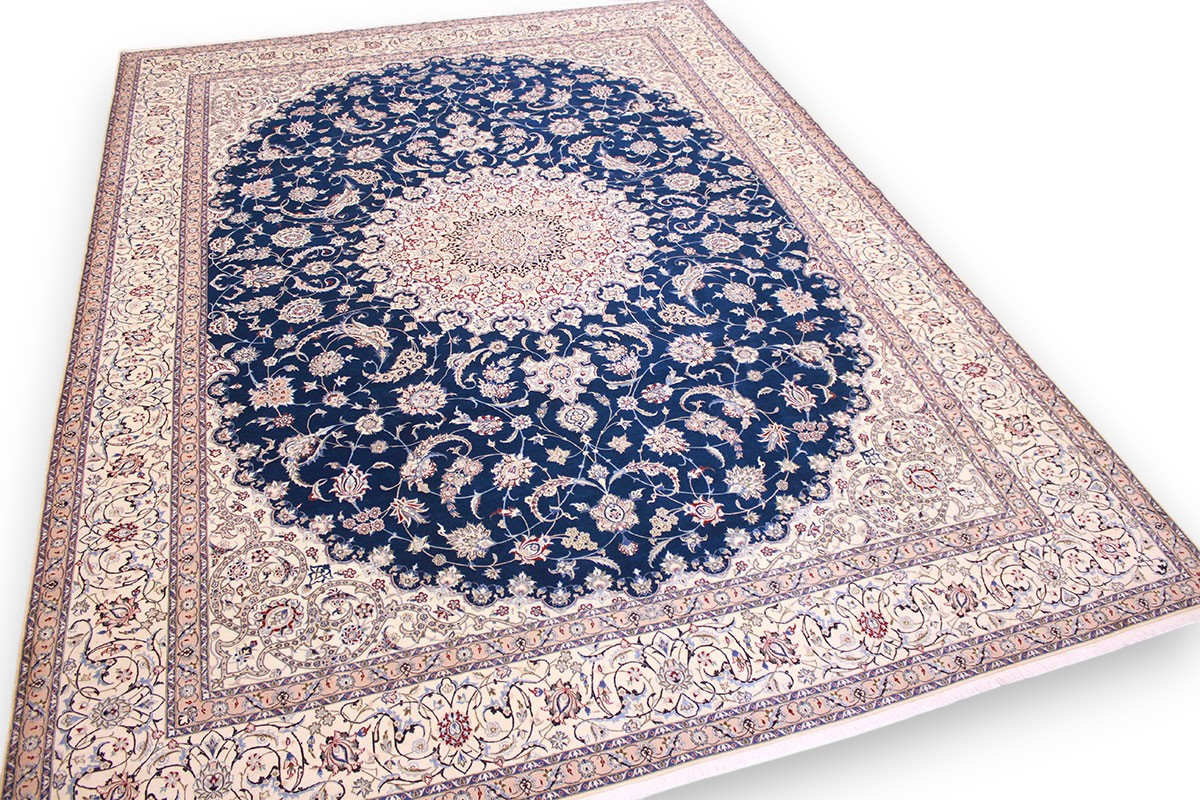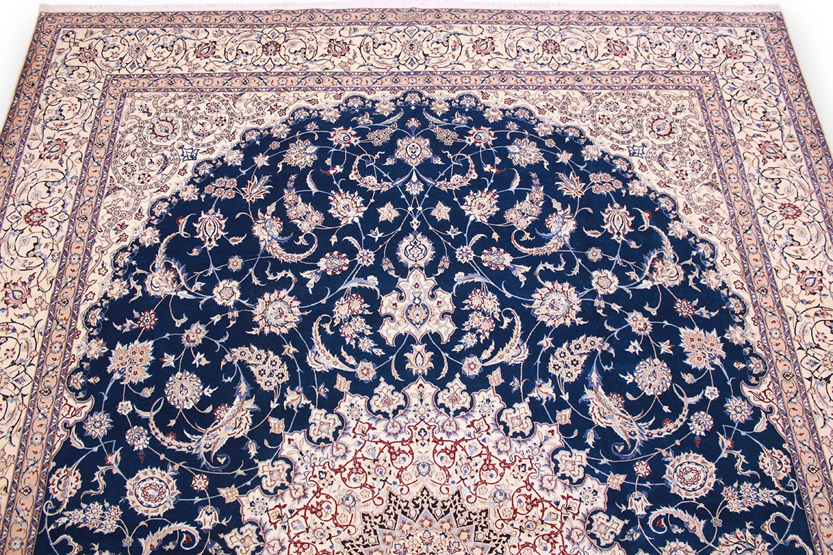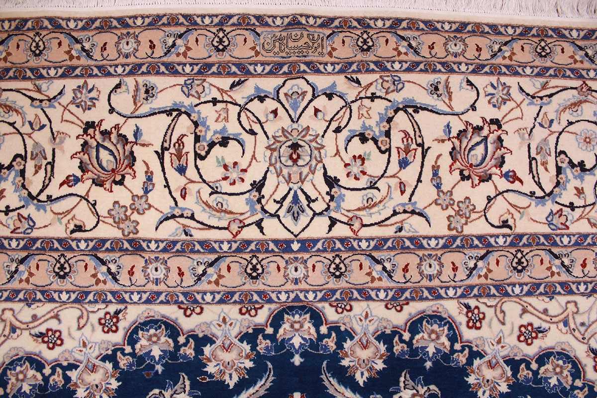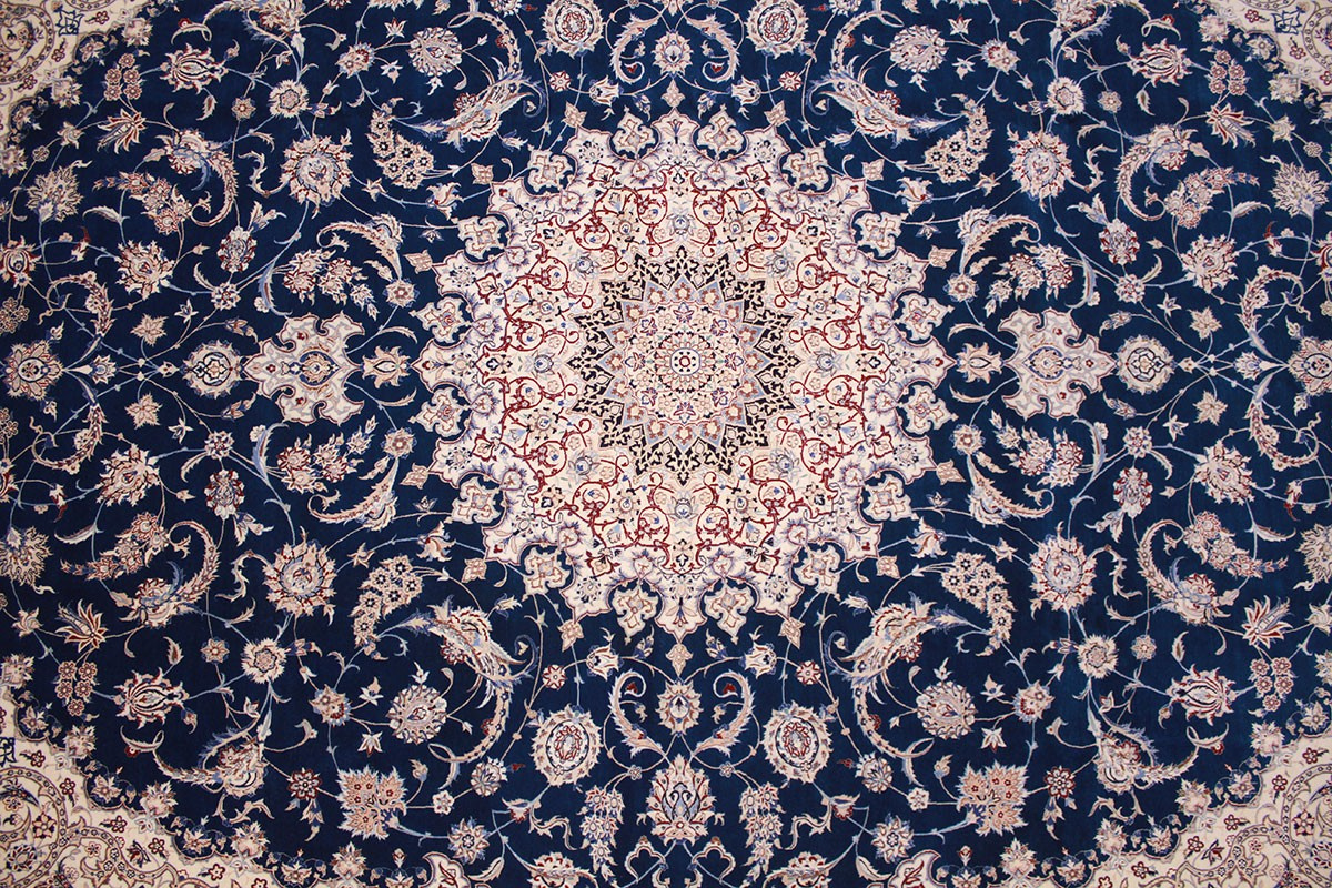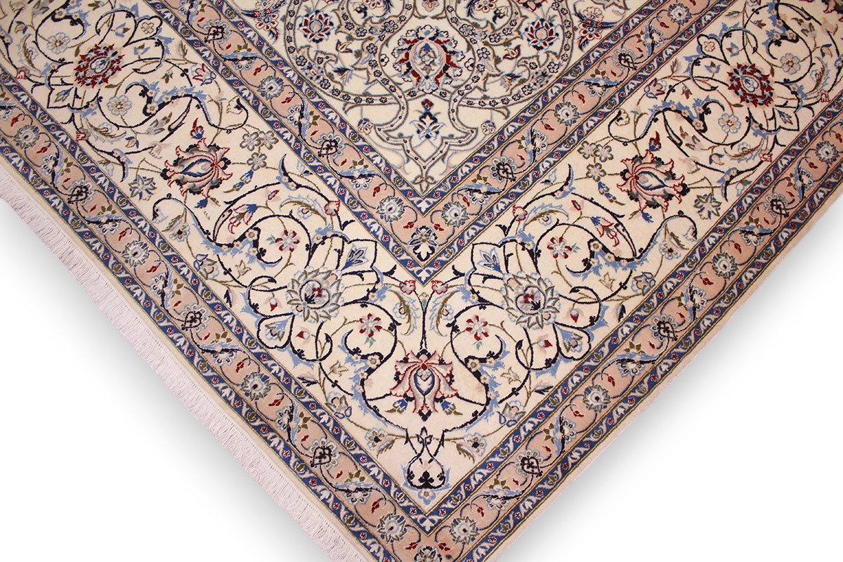 Nain Teppiche sind entweder durchgemustert oder mit Medallion. Typische Farbkombinationen von Nain Teppichen sind Blau-Beige oder Rot-Beige und selten Grün-Beige.