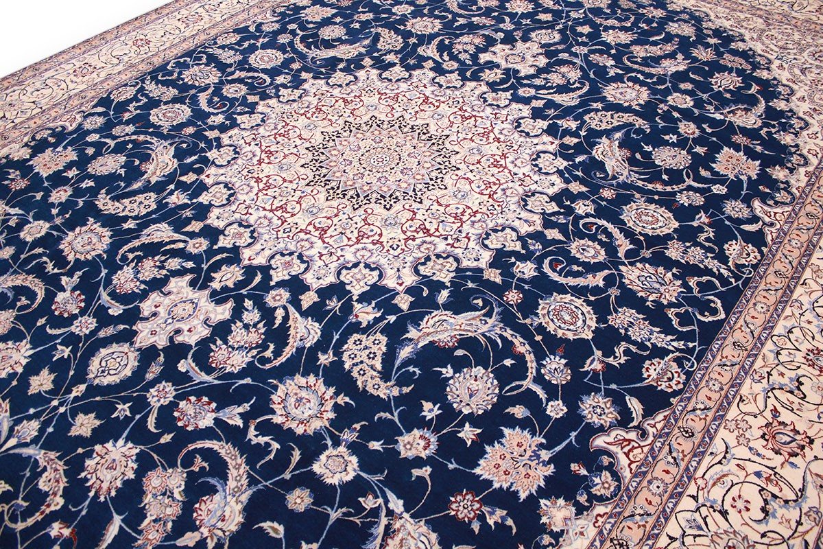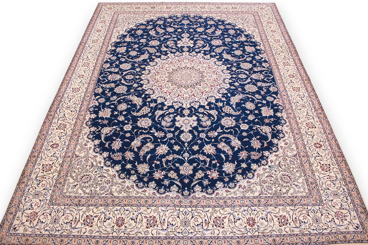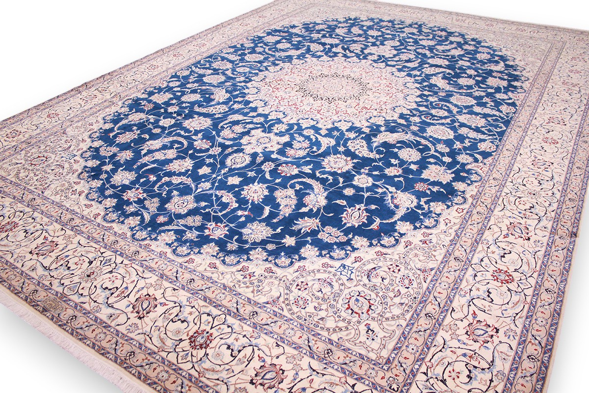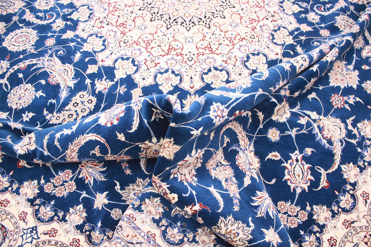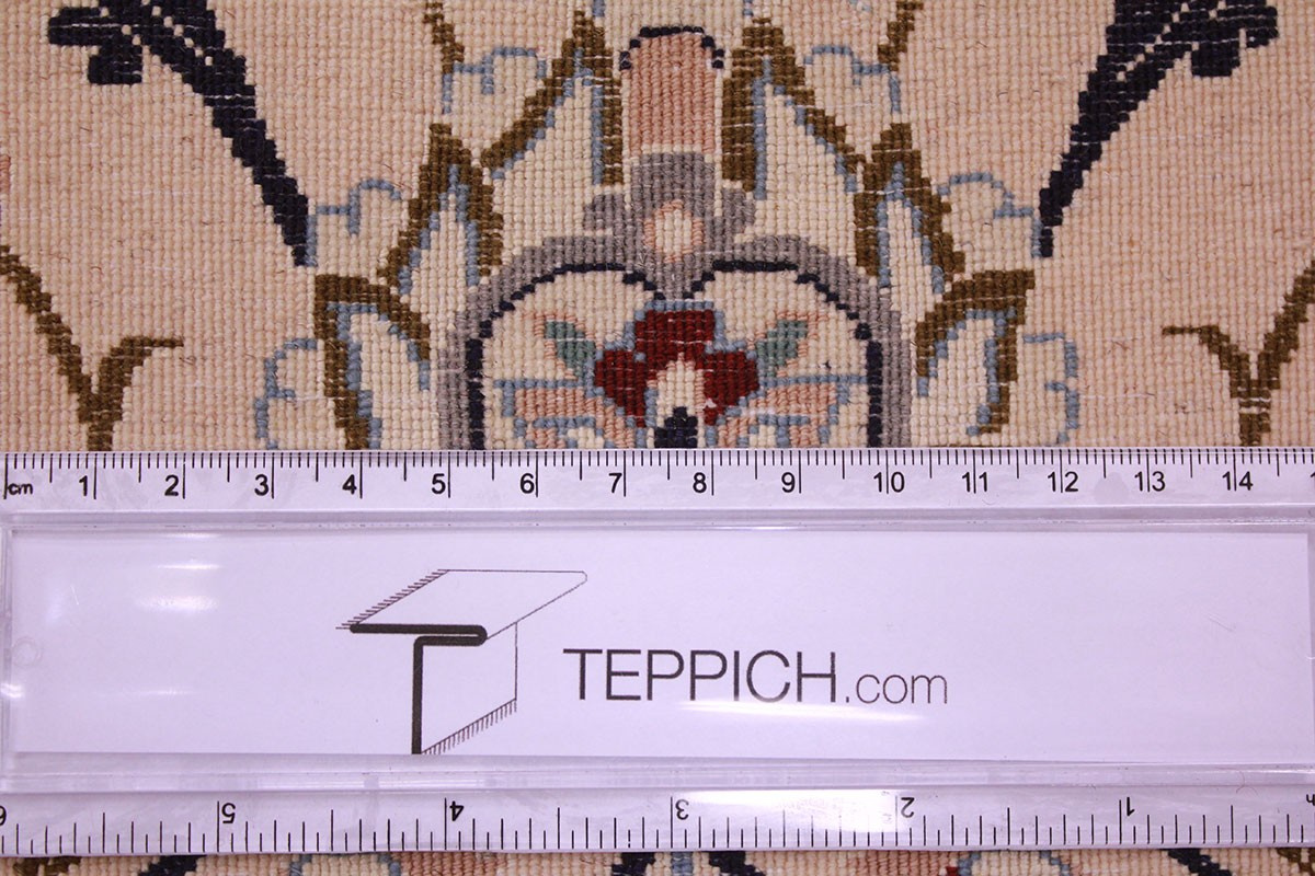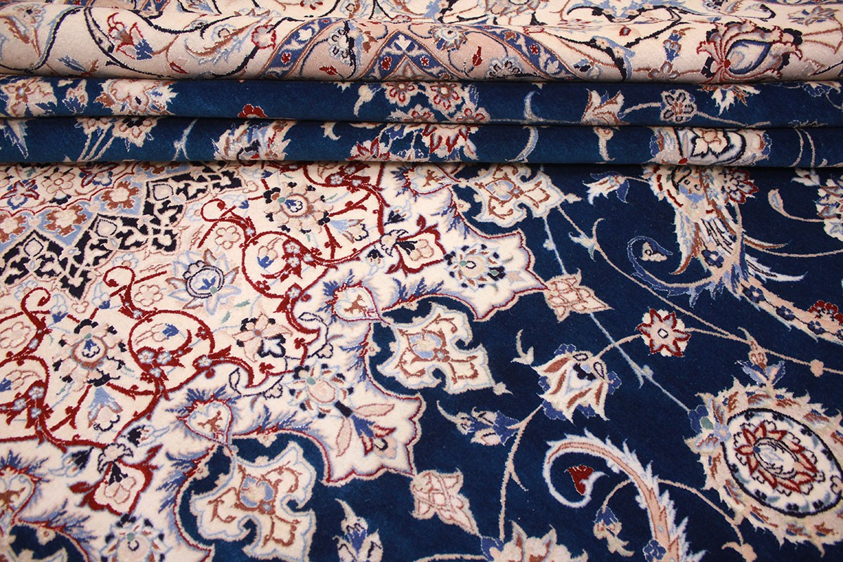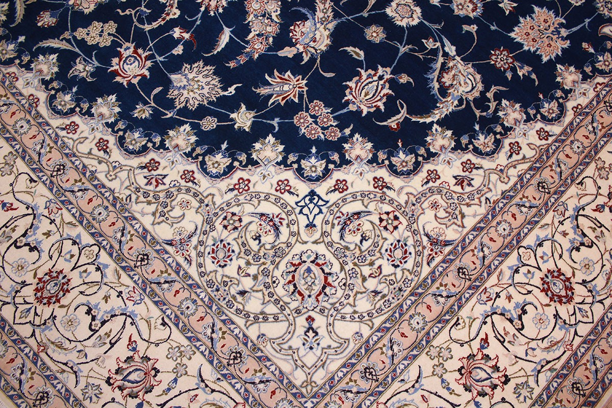 Nain Teppiche sind entweder durchgemustert oder mit Medallion. Typische Farbkombinationen von Nain Teppichen sind Blau-Beige oder Rot-Beige und selten Grün-Beige.