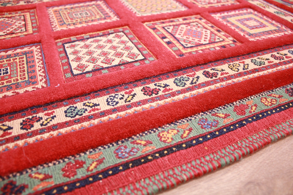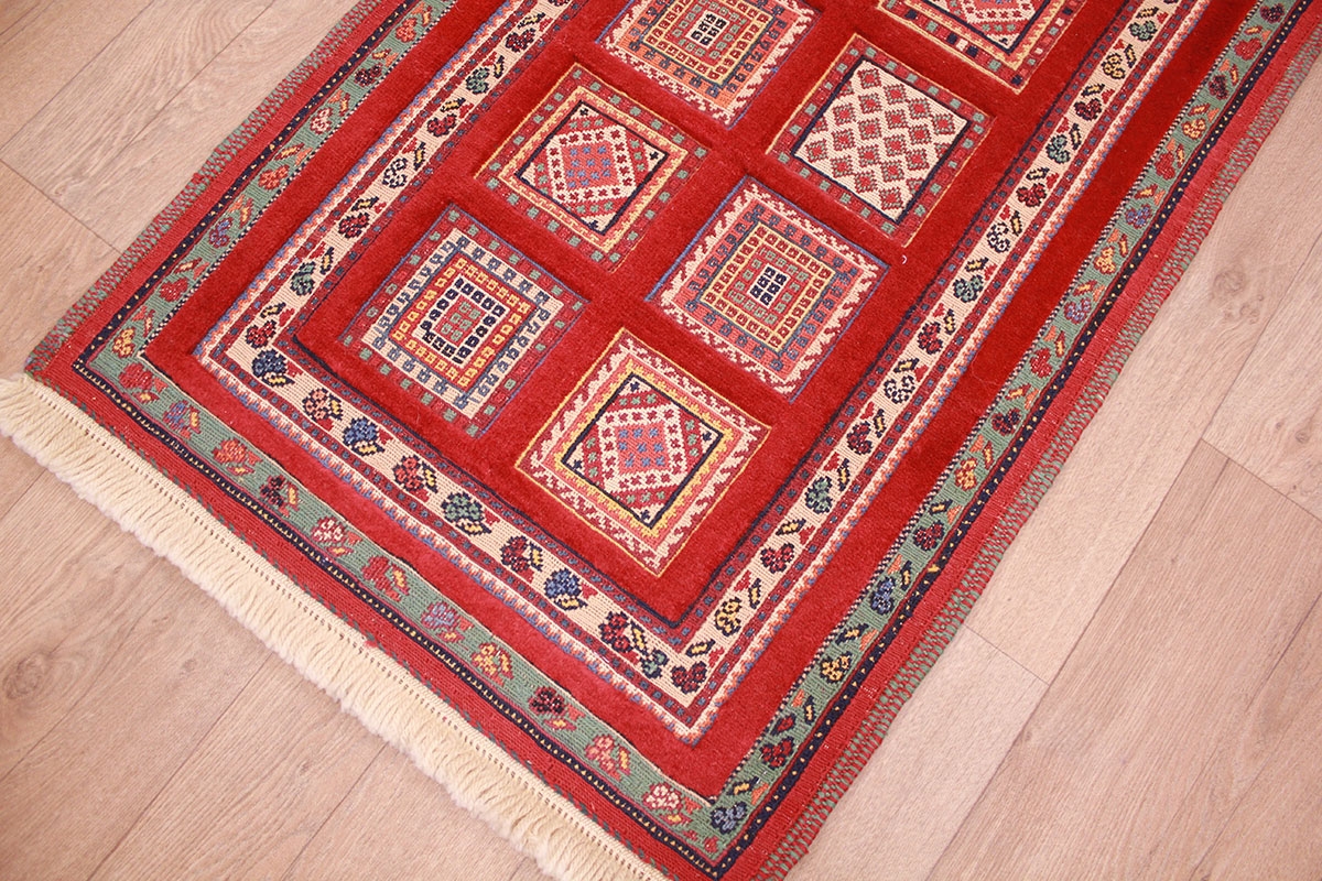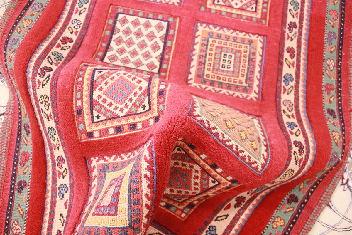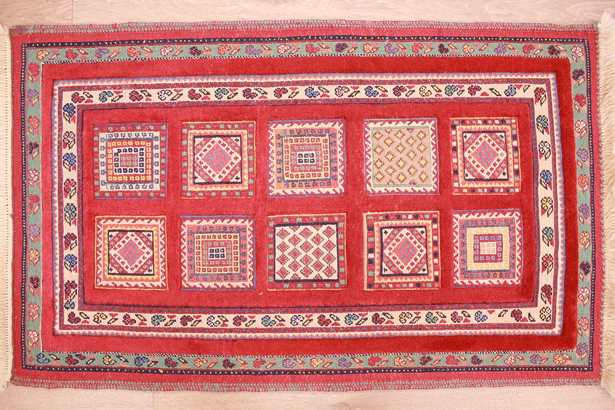 Sie werden sehr kunstvoll geknüpft und sind eine Kombination aus handgewebtem Kelim und handgeknüpftem Teppich.