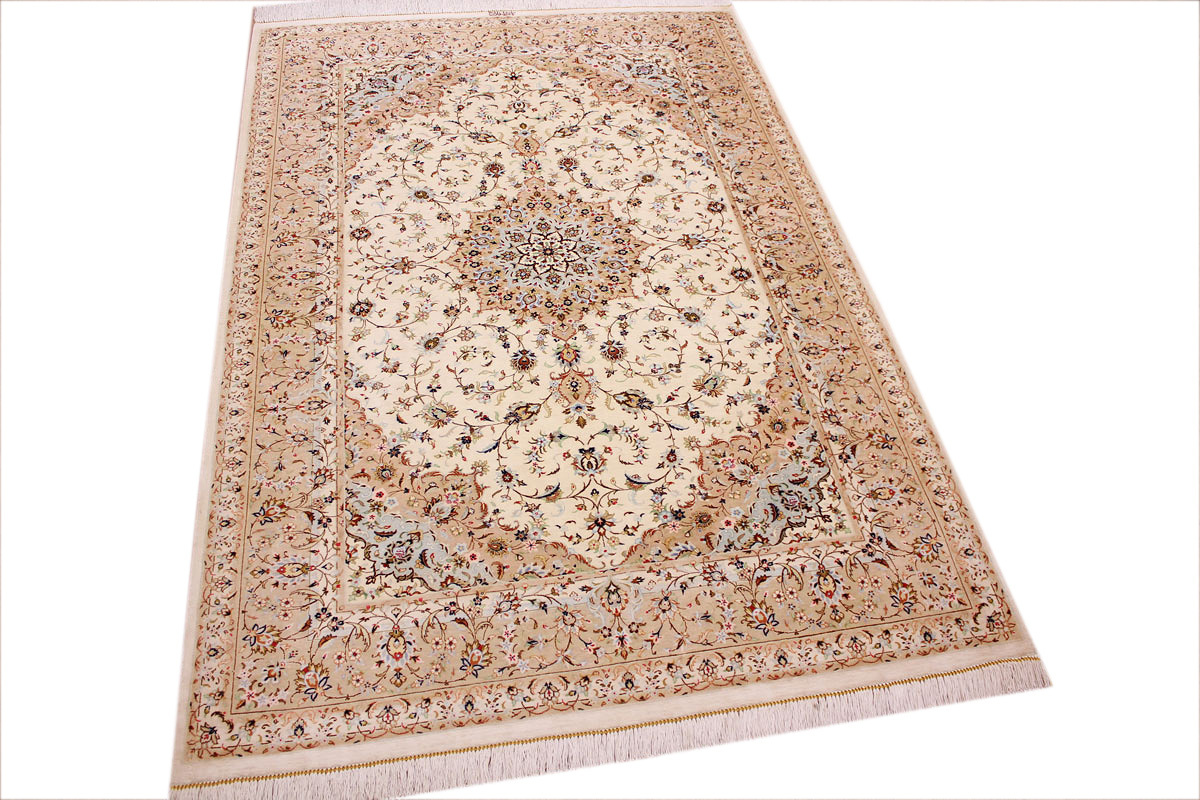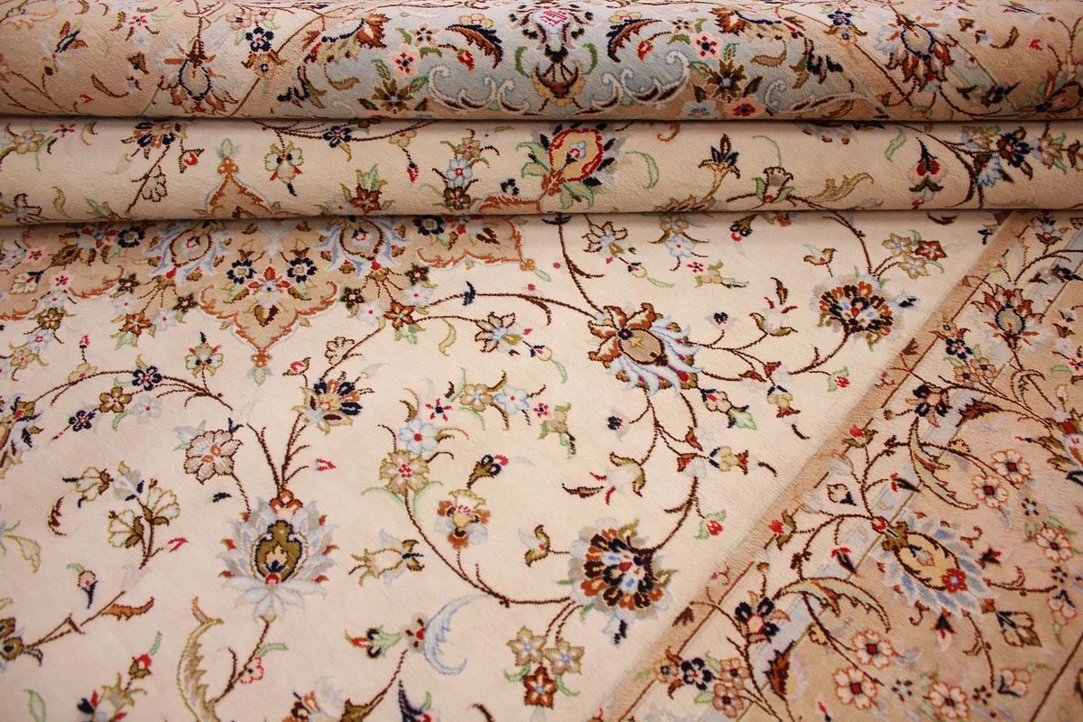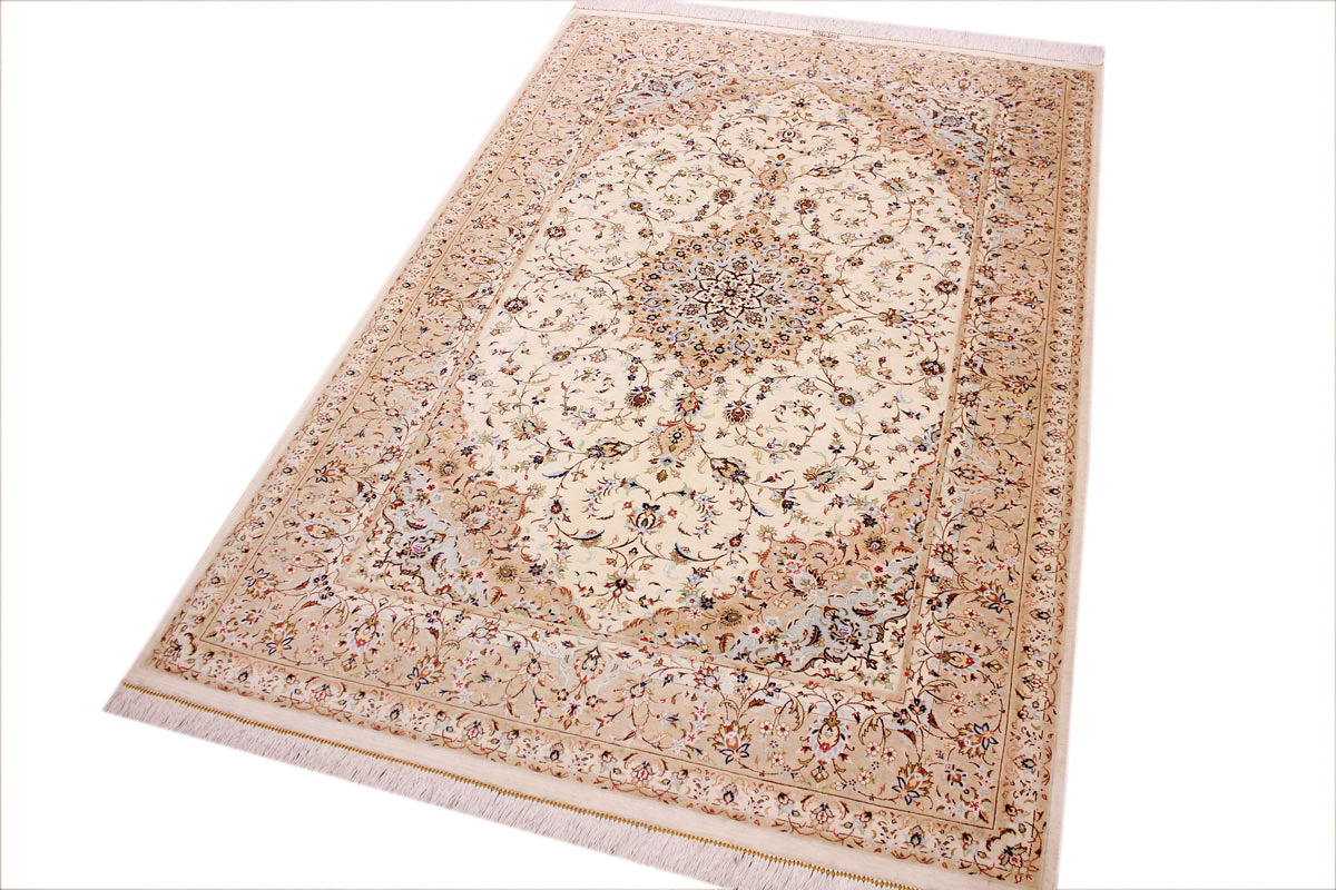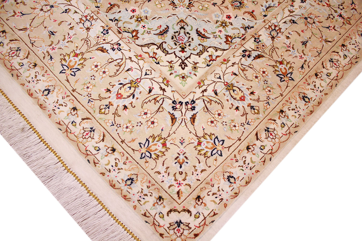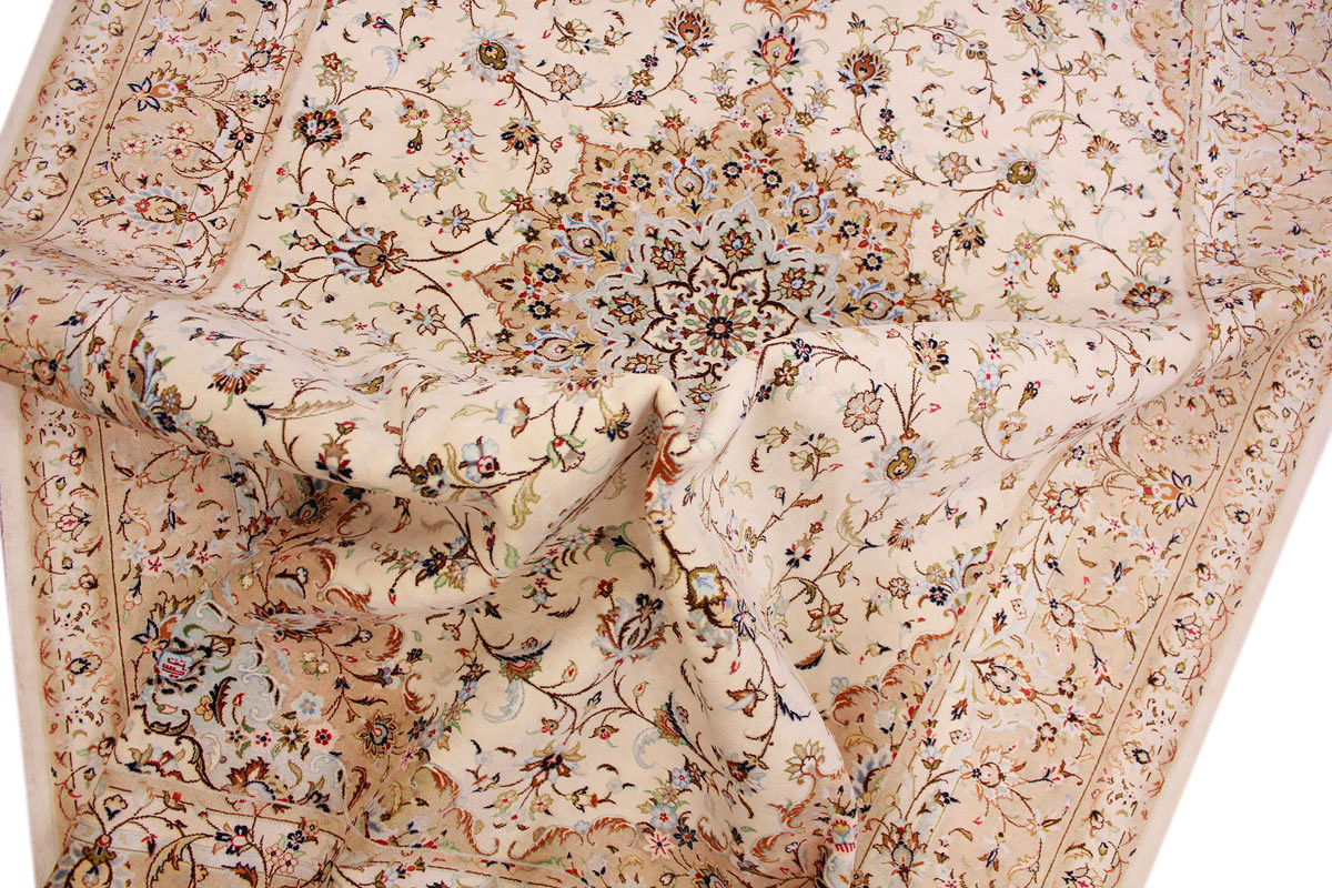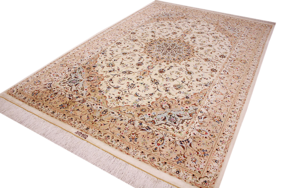 Aufgrund der soliden Wollqualtität und der fast ausschließlichen Verwendung von Naturfarben kann sich der Gom Teppich mit anderen hochwertigen Perserteppichen durchaus messen. Neben guten wollenen Teppichen werden hier in größerer Anzahl Seidenteppiche geknüpft. Als Motive findet man quadratisch unterteilte Gartenteppiche, Jagdschilderungen, Botteh-Motive, Zenrtalmedallions und Vasenmuster. Alle sind liebevoll feingliedrig ausgestattet. Ihre Kolorierung, für die hauptsächlich Naturfarben verwendet werden, reicht von sattem Rot (oft mit leuchtendem Türkis abgestimmt) bis zu lichtblauen, grünen und sogar braunen Tönen. Grundfarbe ist zumeist Elfenbein, zuweilen wird auch Rot als Hintergrundfarbe gewählt.