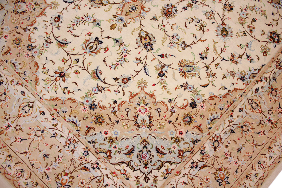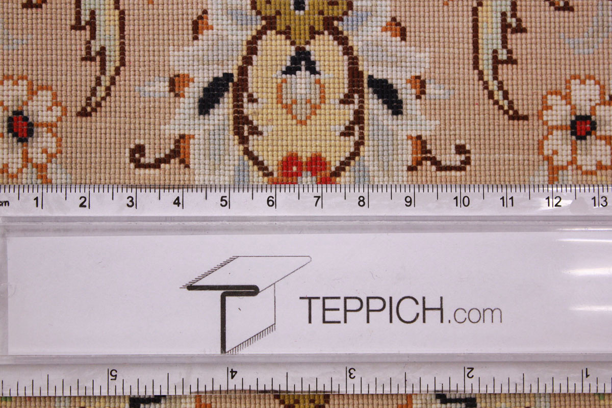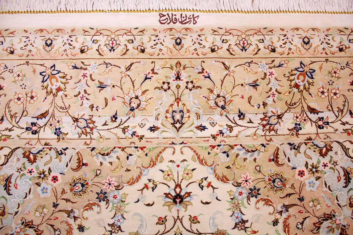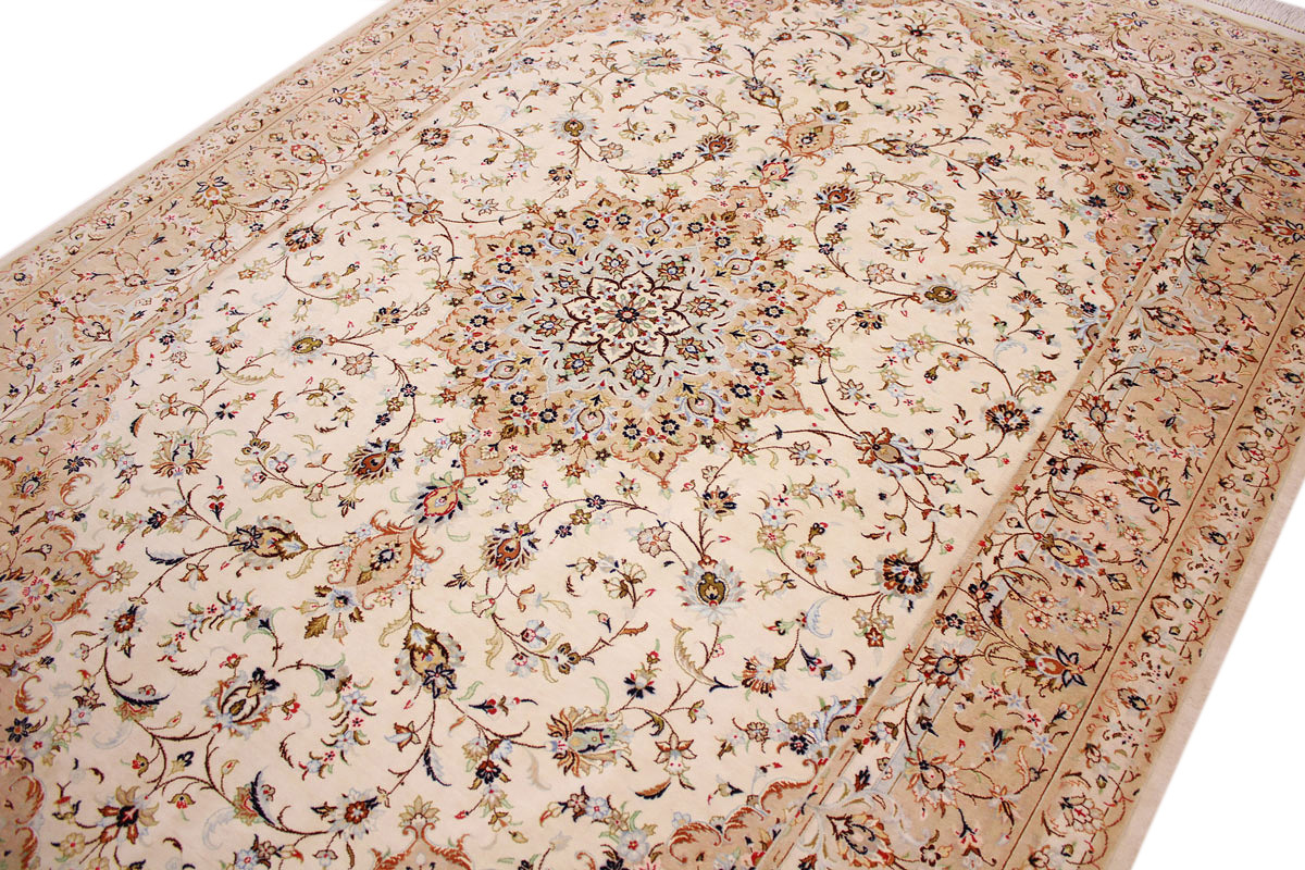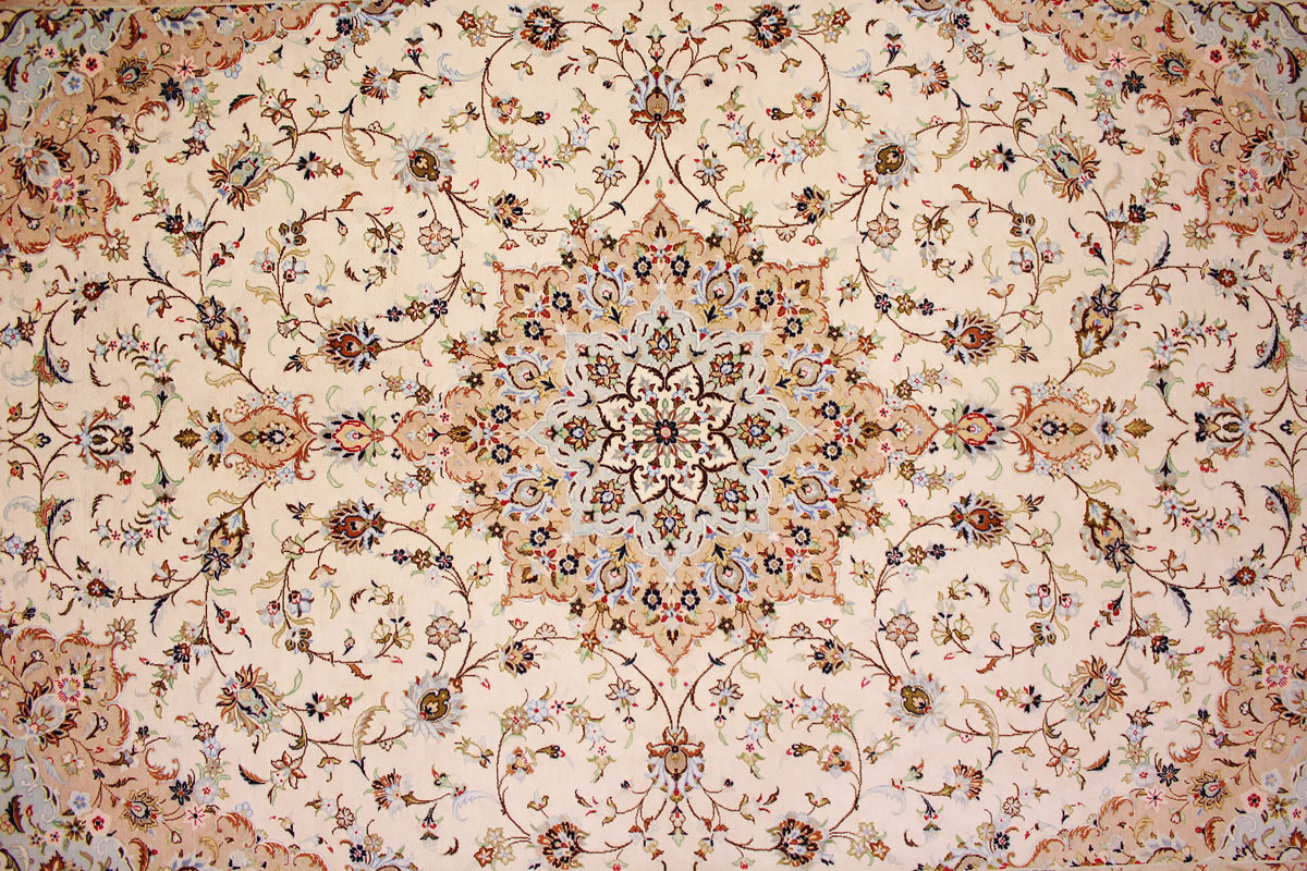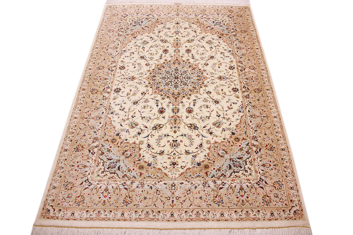 Aufgrund der soliden Wollqualtität und der fast ausschließlichen Verwendung von Naturfarben kann sich der Gom Teppich mit anderen hochwertigen Perserteppichen durchaus messen. Neben guten wollenen Teppichen werden hier in größerer Anzahl Seidenteppiche geknüpft. Als Motive findet man quadratisch unterteilte Gartenteppiche, Jagdschilderungen, Botteh-Motive, Zenrtalmedallions und Vasenmuster. Alle sind liebevoll feingliedrig ausgestattet. Ihre Kolorierung, für die hauptsächlich Naturfarben verwendet werden, reicht von sattem Rot (oft mit leuchtendem Türkis abgestimmt) bis zu lichtblauen, grünen und sogar braunen Tönen. Grundfarbe ist zumeist Elfenbein, zuweilen wird auch Rot als Hintergrundfarbe gewählt.