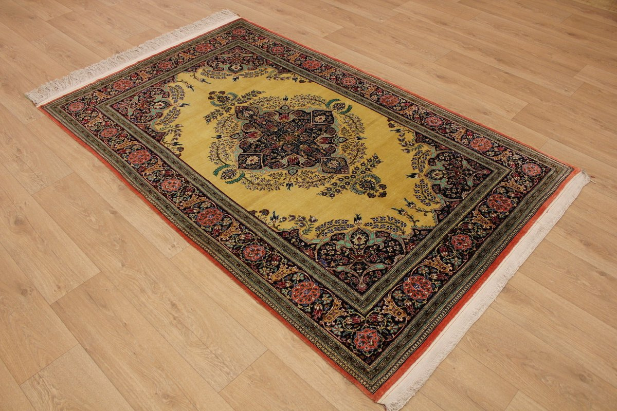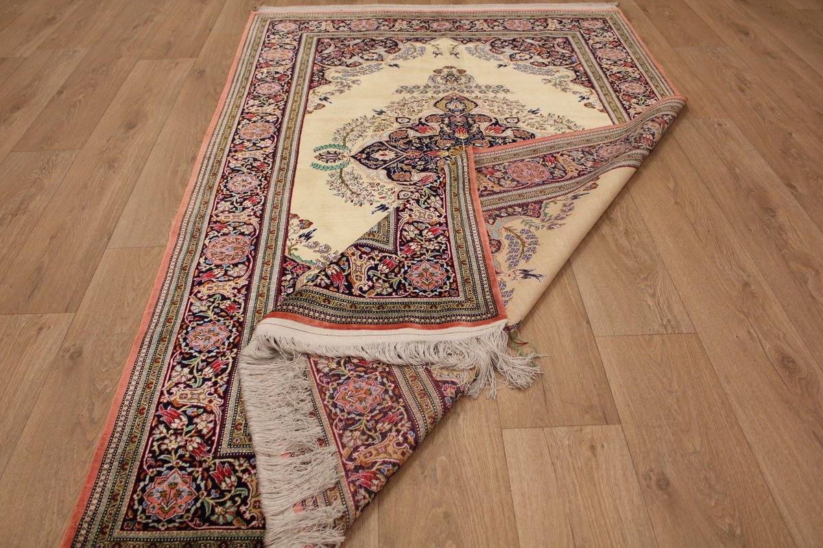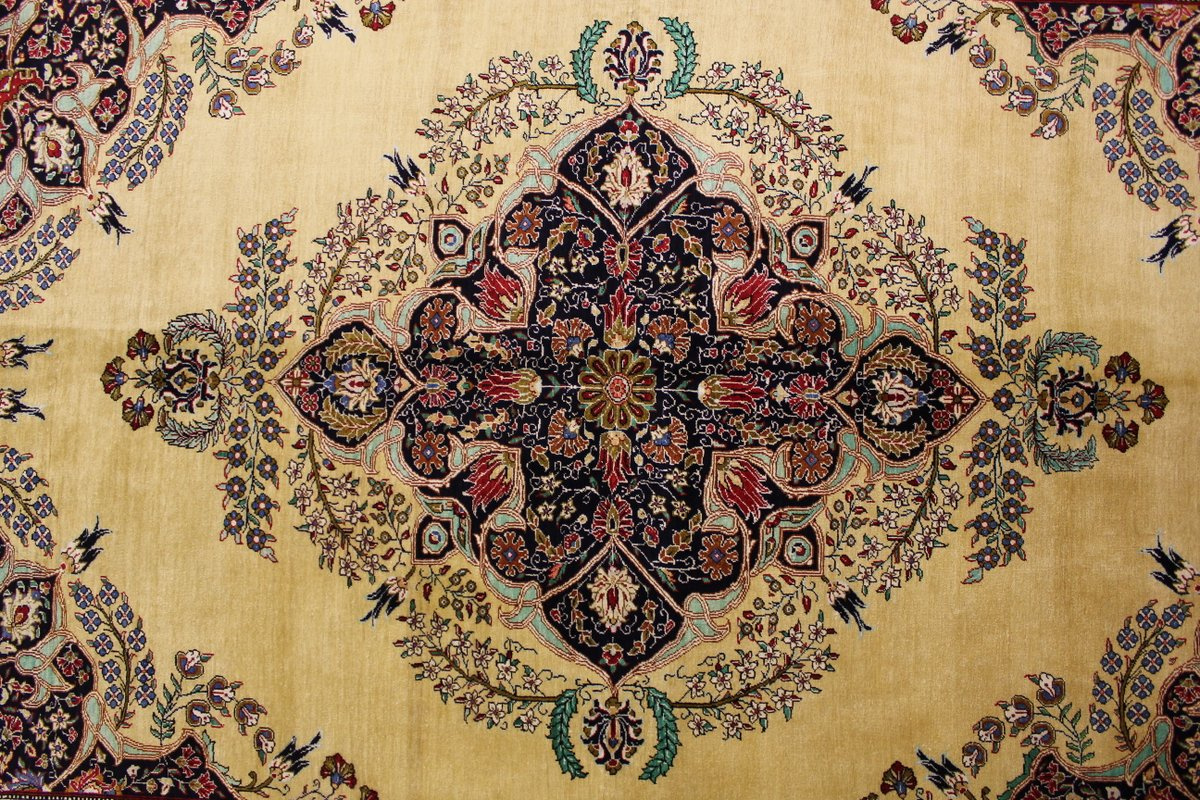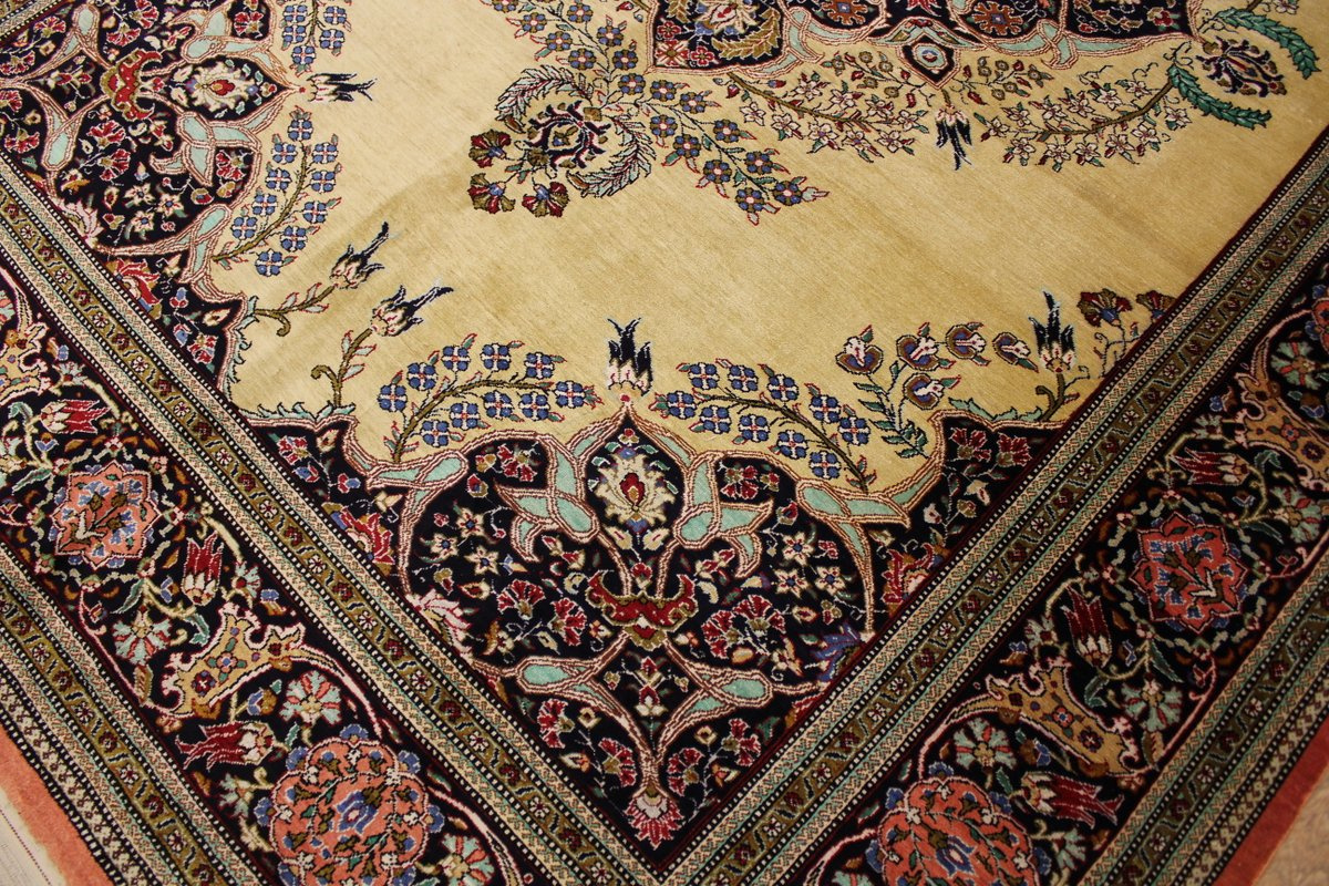 Brilliantly detailed medallions, all-over patterns of the greatest intricacy, and breath-taking pictorials and hunting scenes, attest to the craftsmanship of Persia's finest master-weavers. Some pieces of fine wool are also made there. Although signatures are found on fine rugs made elsewhere, the weavers of Qom take such enormous pride in their product that they almost always weave their signatures into a small part of the carpet´s border. Many shapes and sizes are produced, including squares, rectangles, oval or round, and the sizes may vary from a very small rug to a carpet which would suit the grand salon of a palace. The materials used can be wool, silk, or any combination of the two.