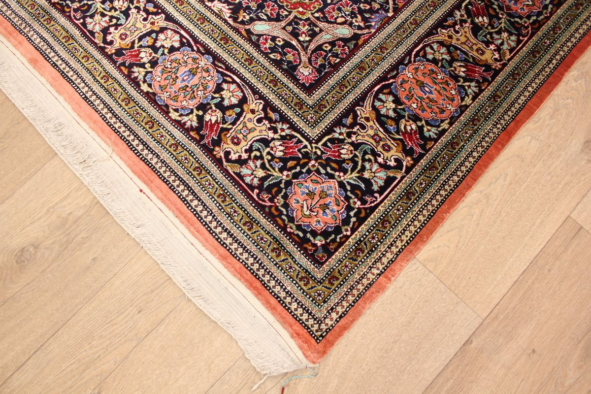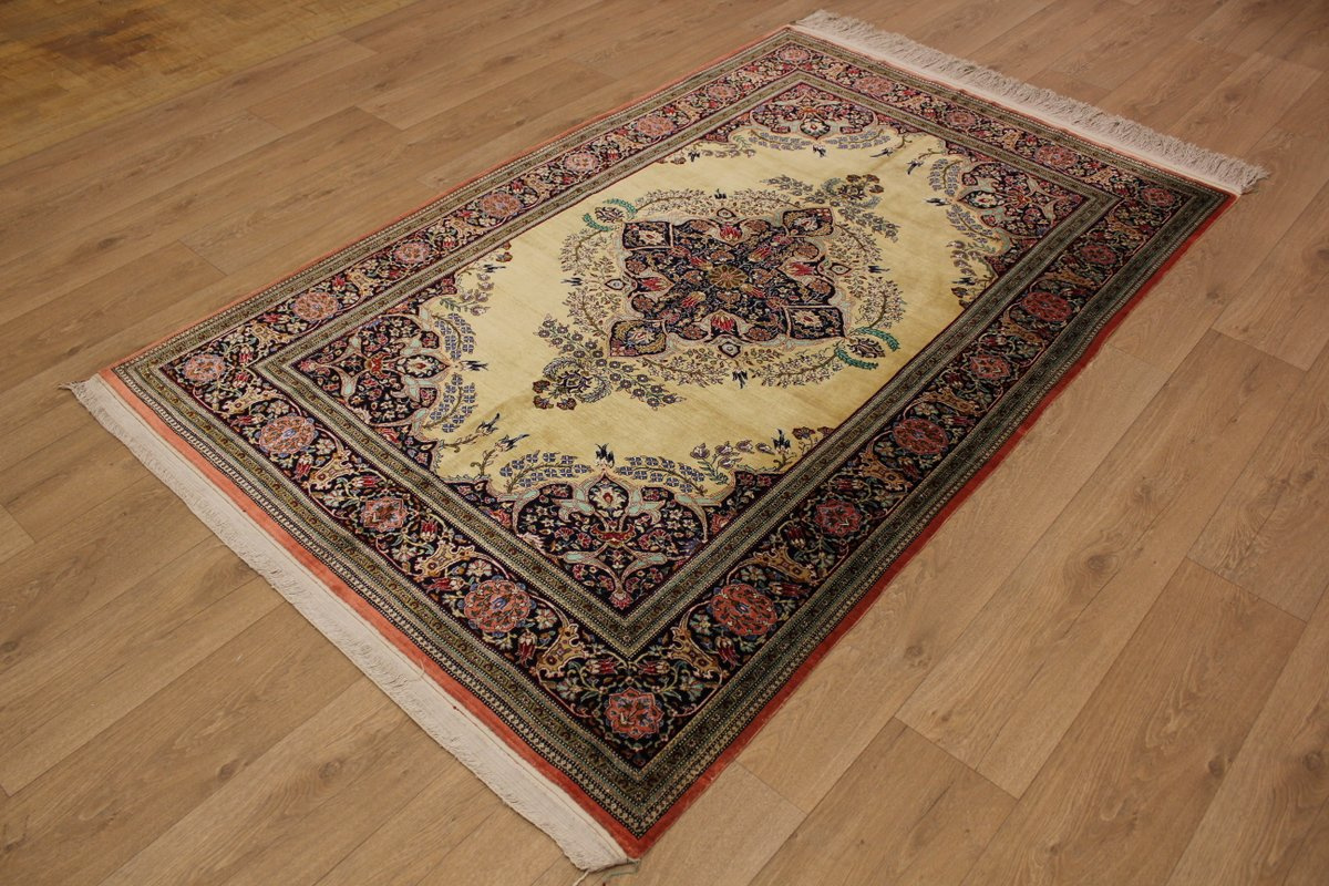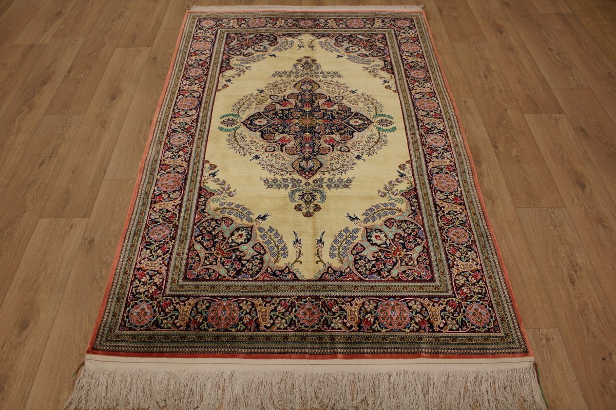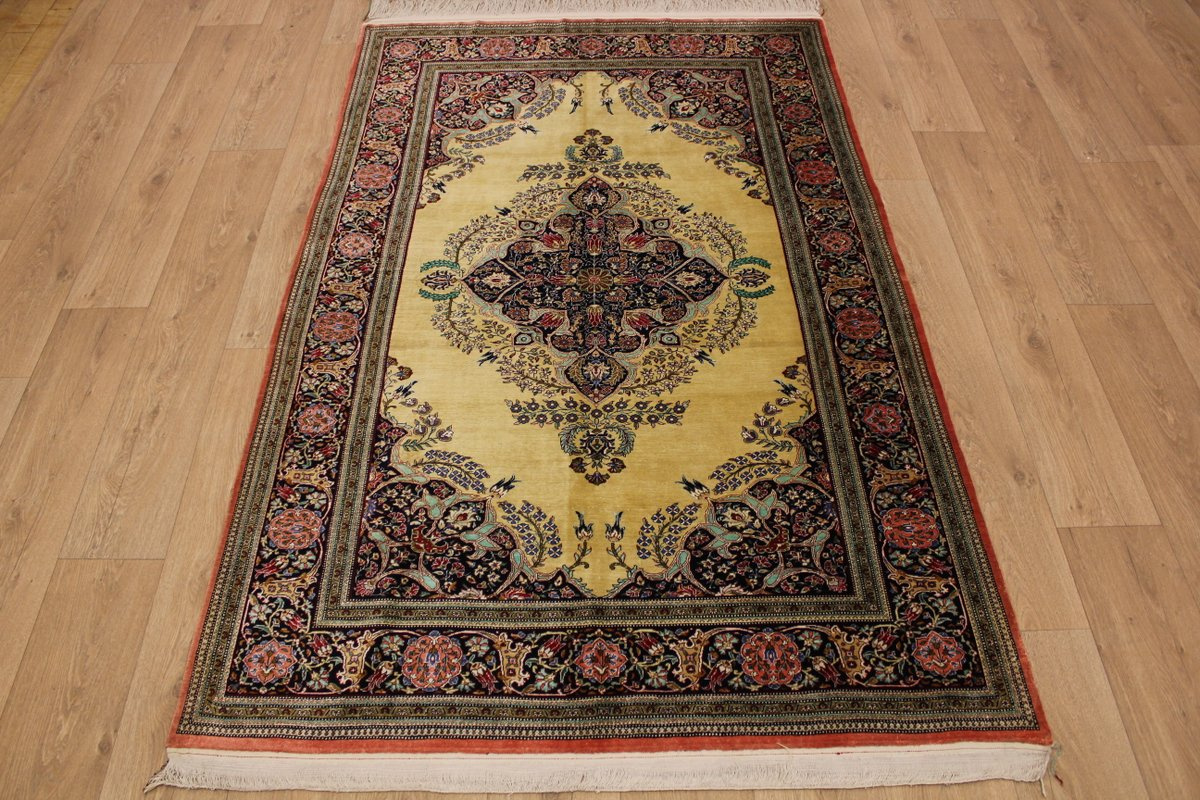 Brilliantly detailed medallions, all-over patterns of the greatest intricacy, and breath-taking pictorials and hunting scenes, attest to the craftsmanship of Persia's finest master-weavers. Some pieces of fine wool are also made there. Although signatures are found on fine rugs made elsewhere, the weavers of Qom take such enormous pride in their product that they almost always weave their signatures into a small part of the carpet´s border. Many shapes and sizes are produced, including squares, rectangles, oval or round, and the sizes may vary from a very small rug to a carpet which would suit the grand salon of a palace. The materials used can be wool, silk, or any combination of the two.