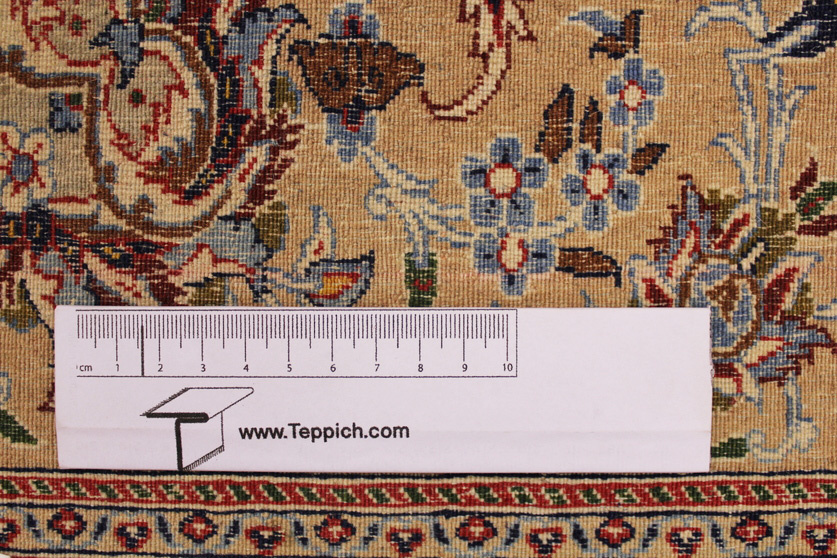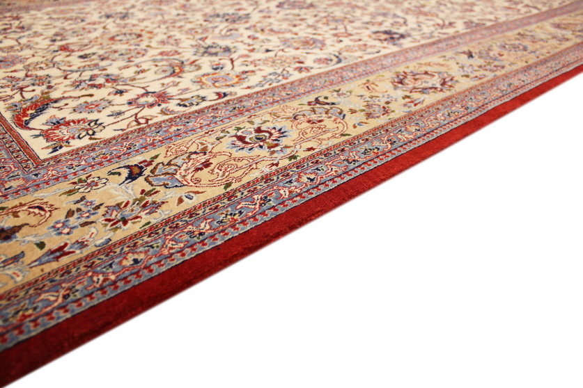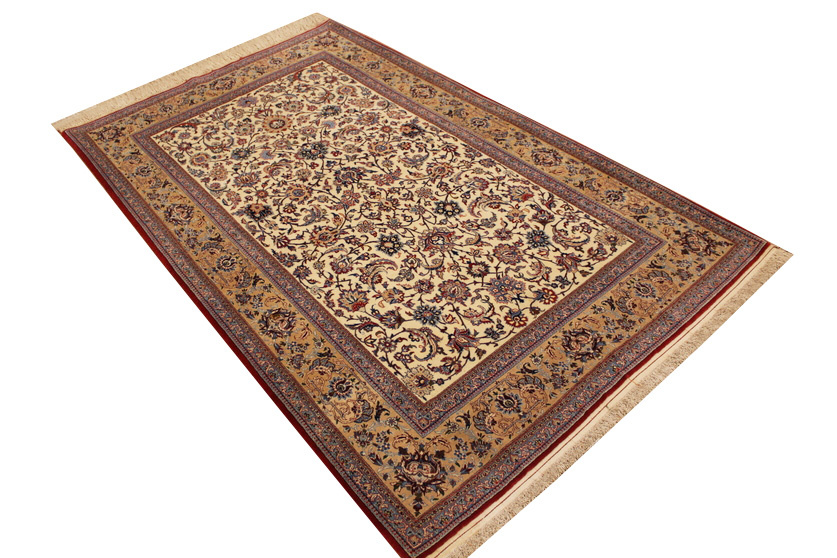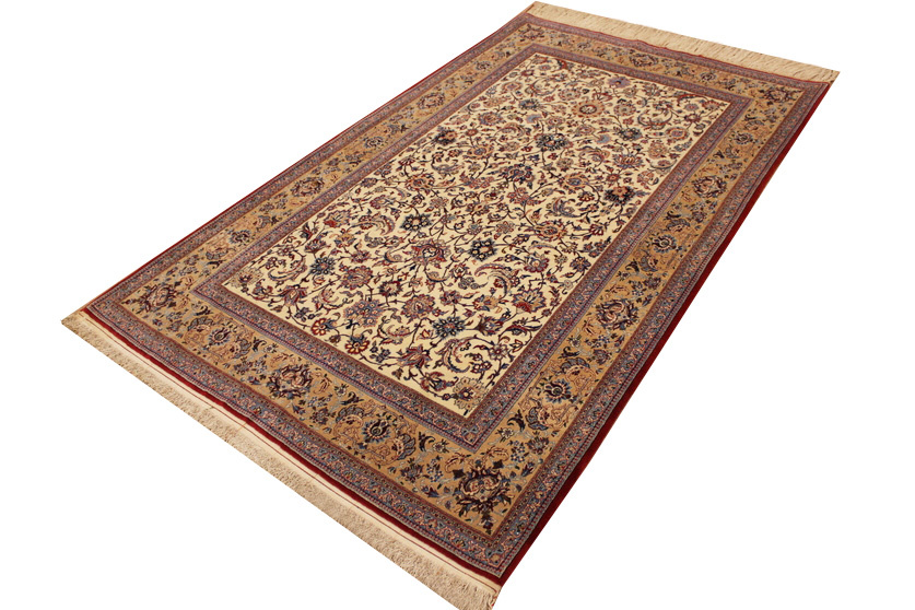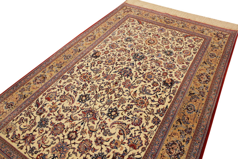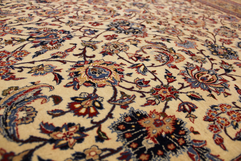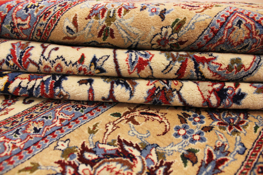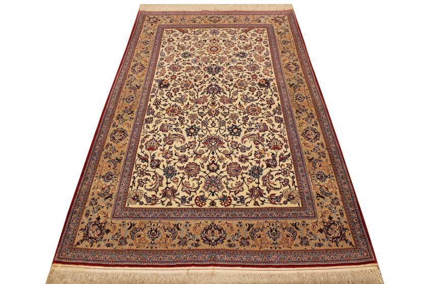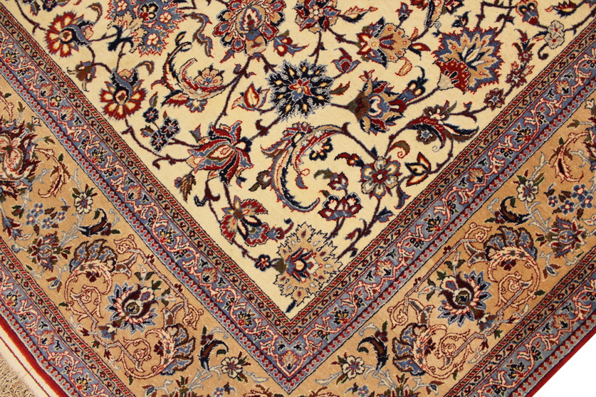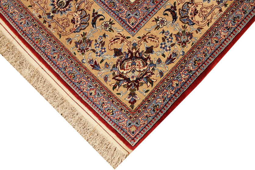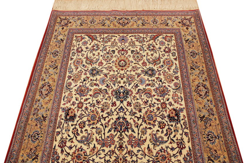 Its talented master weavers may take several years to complete a carpet. Though very similar in appearance to Isfahans, they are easily identifiable because of their distinctive color scheme and smooth, closely clipped pile. Nain carpets usually feature an overall arabesque and curvilinear floral pattern of blues against a warm beige or ivory background, with touches of greens and whites. Over 300 to 500 knots per square inch are not uncommon in Nains. Excellent grades of wool and silk are used on foundations of fine cotton or silk.