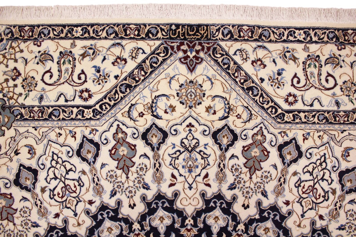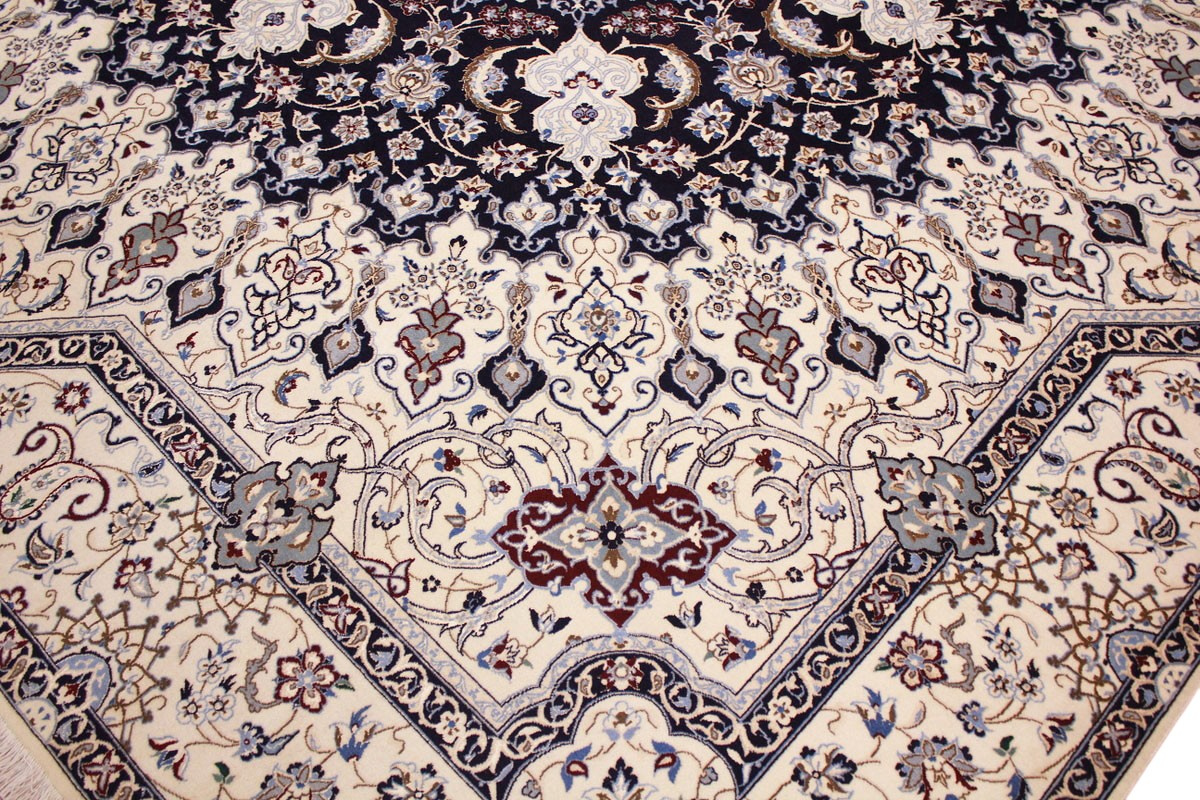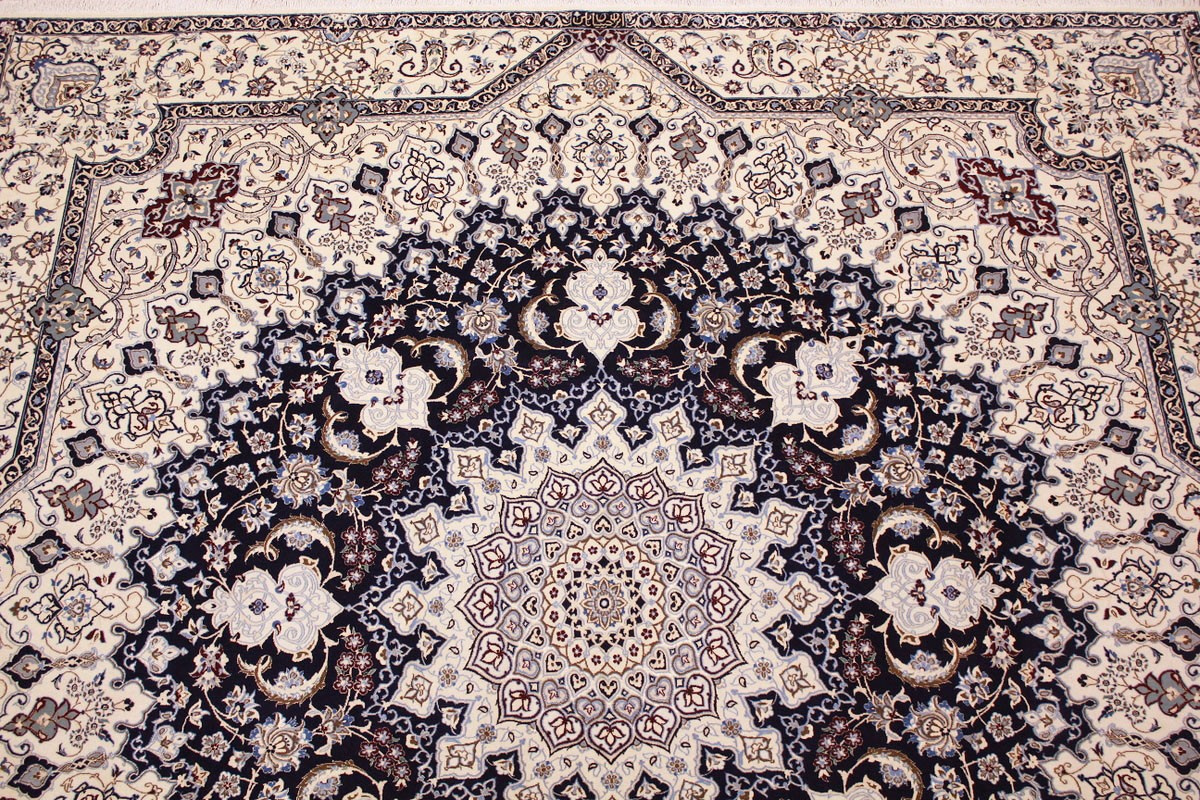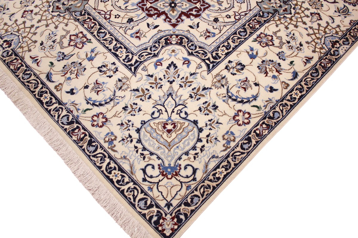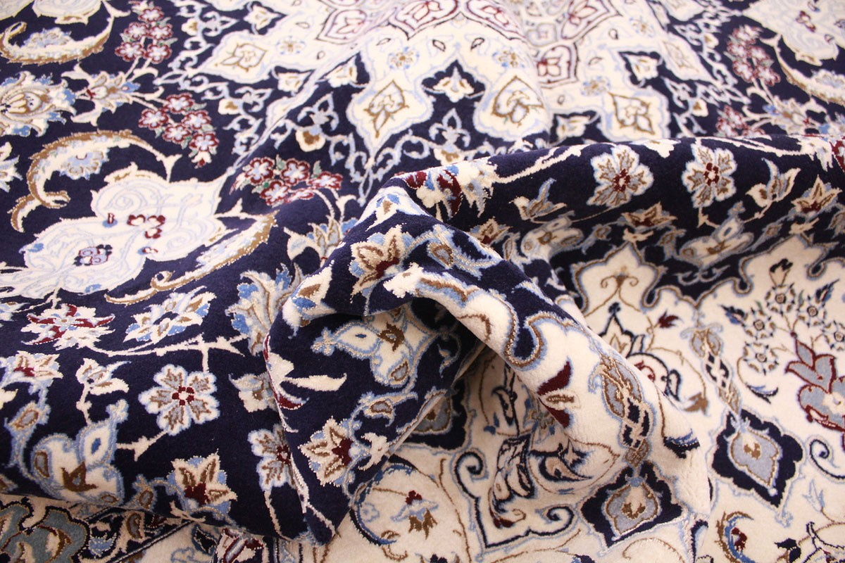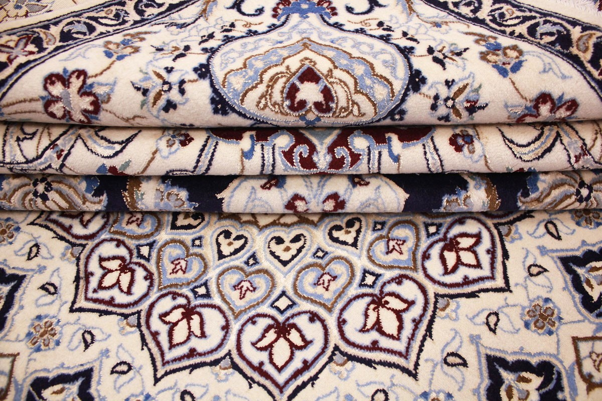 Its talented master weavers may take several years to complete a carpet. Though very similar in appearance to Isfahans, they are easily identifiable because of their distinctive color scheme and smooth, closely clipped pile. Nain carpets usually feature an overall arabesque and curvilinear floral pattern of blues against a warm beige or ivory background, with touches of greens and whites. Over 300 to 500 knots per square inch are not uncommon in Nains. Excellent grades of wool and silk are used on foundations of fine cotton or silk.