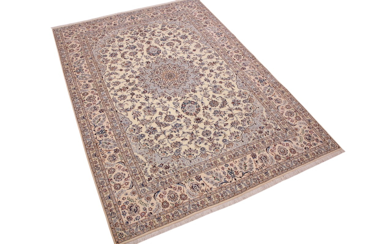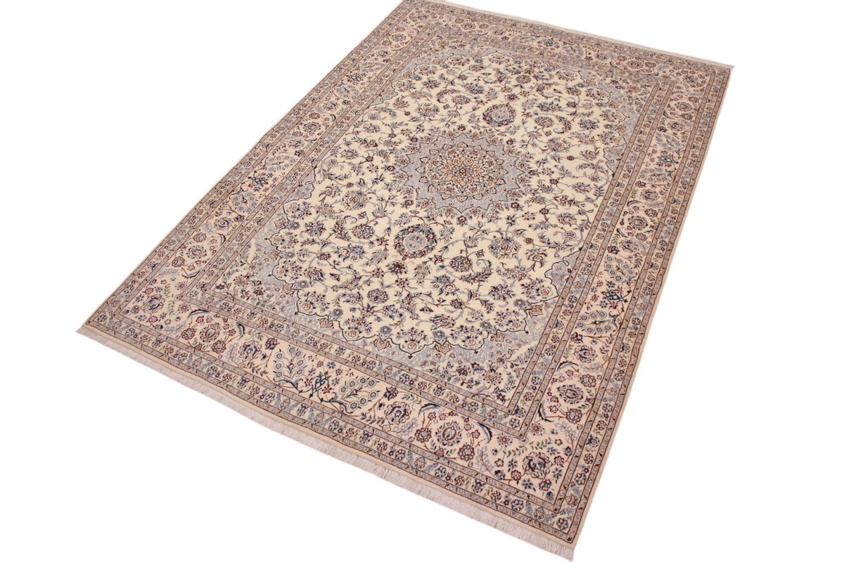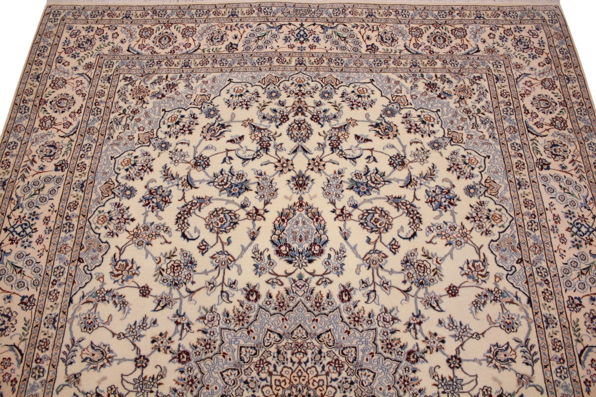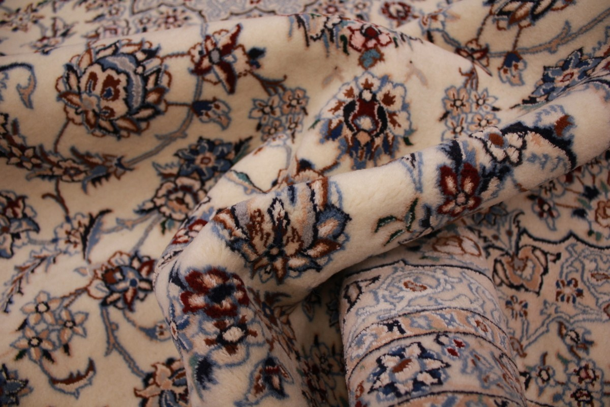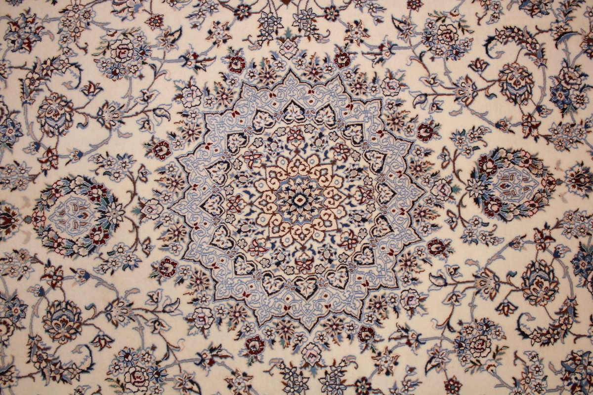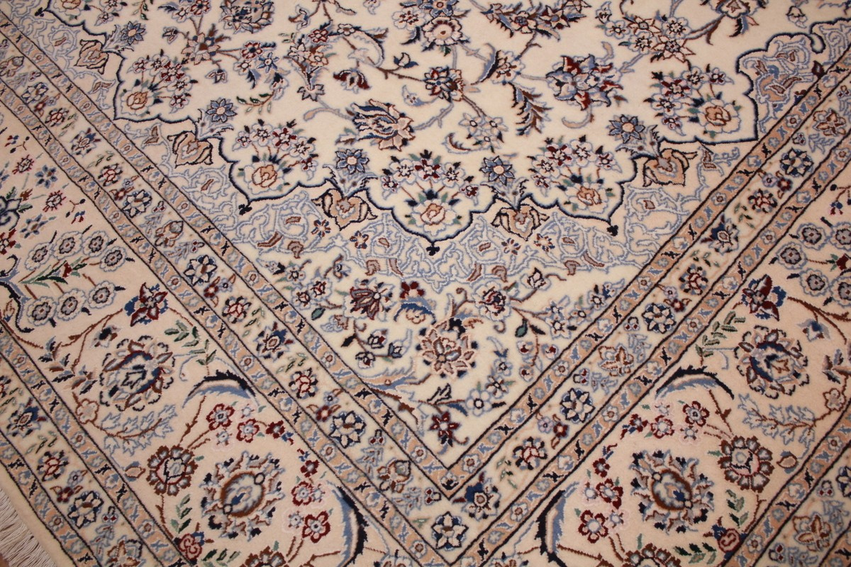 Its talented master weavers may take several years to complete a carpet. Though very similar in appearance to Isfahans, they are easily identifiable because of their distinctive color scheme and smooth, closely clipped pile. Nain carpets usually feature an overall arabesque and curvilinear floral pattern of blues against a warm beige or ivory background, with touches of greens and whites. Over 300 to 500 knots per square inch are not uncommon in Nains. Excellent grades of wool and silk are used on foundations of fine cotton or silk.