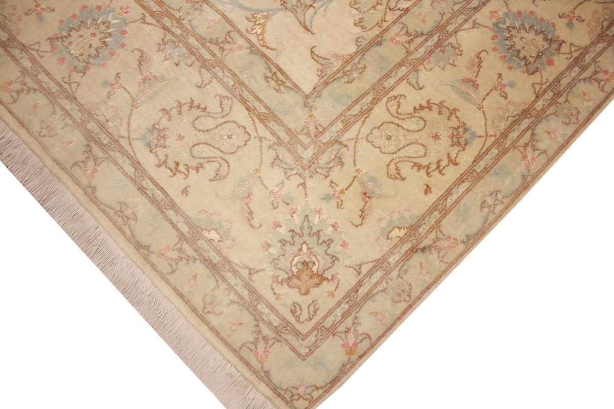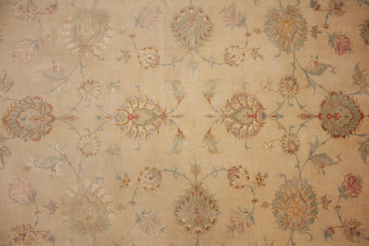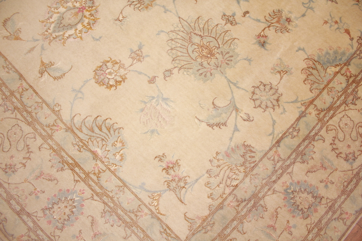 Taabriz is an ancient city in north-western Persia, and the most prolific of all carpet centres. The quality in their carpets is generally exceptional, with most on a base of fine cotton, but sometimes on pure silk. There are many unique designs but typically the pattern in a Taabriz rug is filled with dense floral motifs, large palmettes, vases, or vivid hunting scenes or pictorials in the field. These can be with or without a medallion, and geometric designs are also seen. Taabriz has sub-styles as well. These include the restrained and elegant 'Mahi' in co-ordinated borders of subdued tones that fit in anywhere; the Naqsheh, with its plethora of pinks on beige, or very occasionally, black; and the wild but beautiful Tabatabaie, always in touches of orange, lemon green and beige. The finer Naqsheh and Mahi are mostly in highly-priced Kurk wool, and silk is often used to outline lavishly the highlights of the rug.