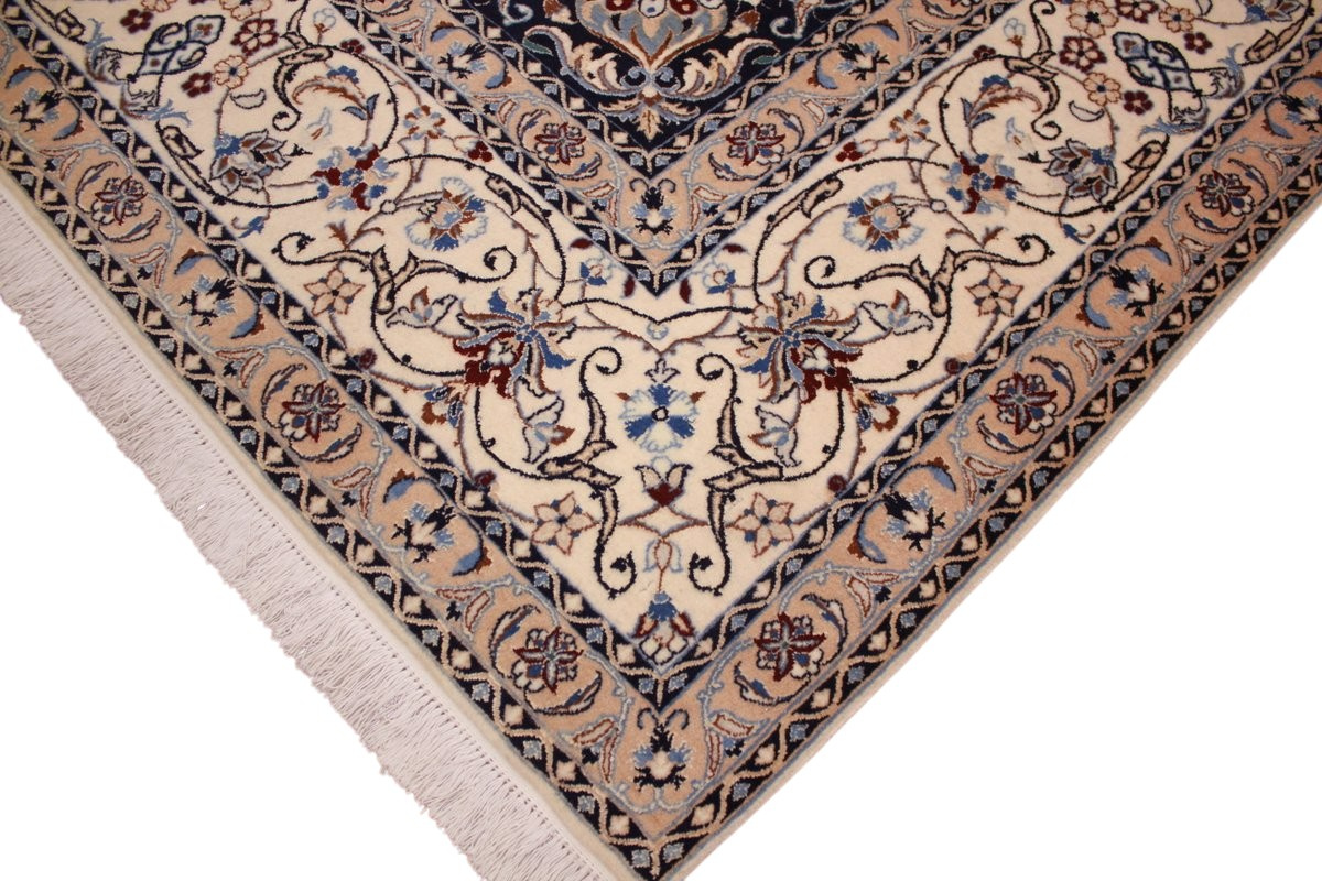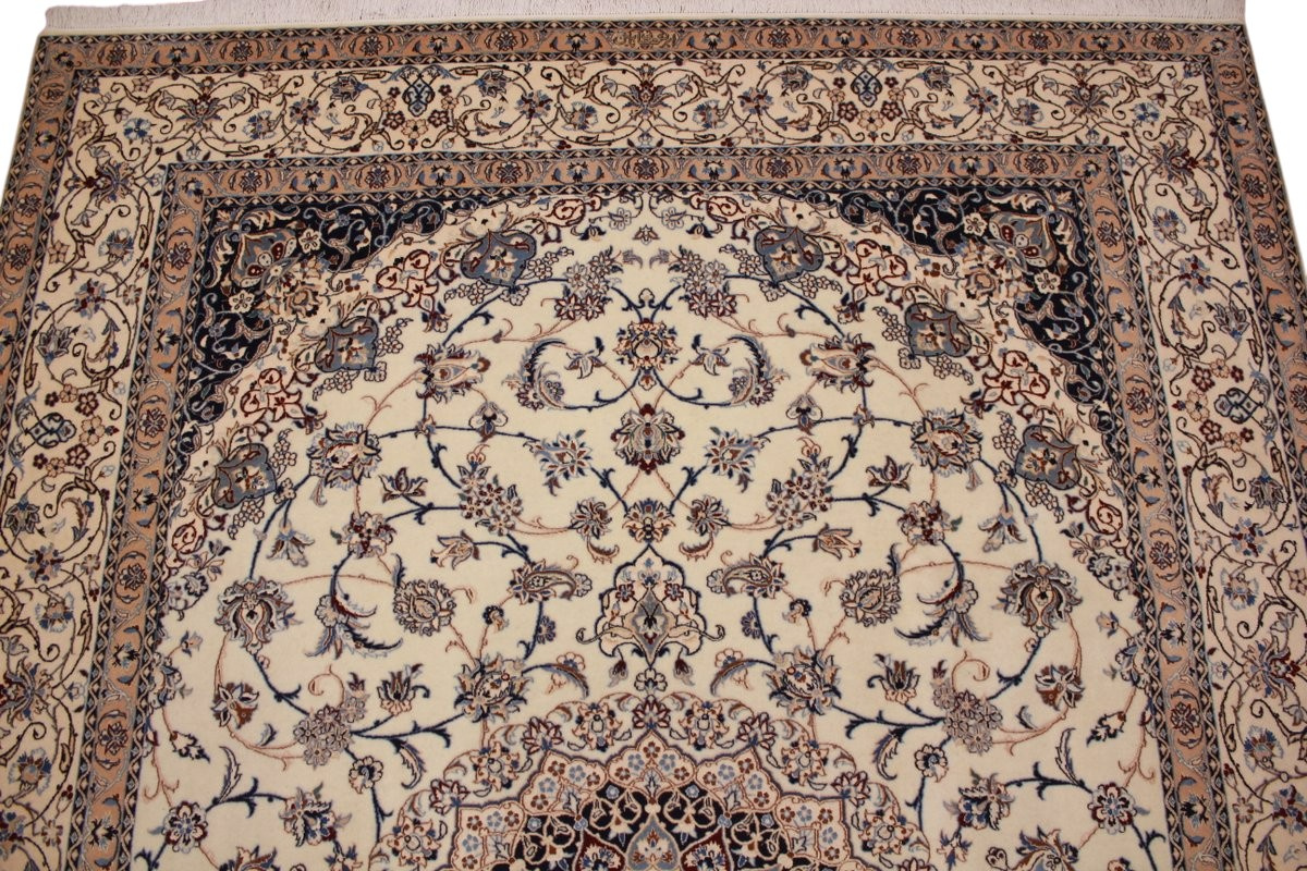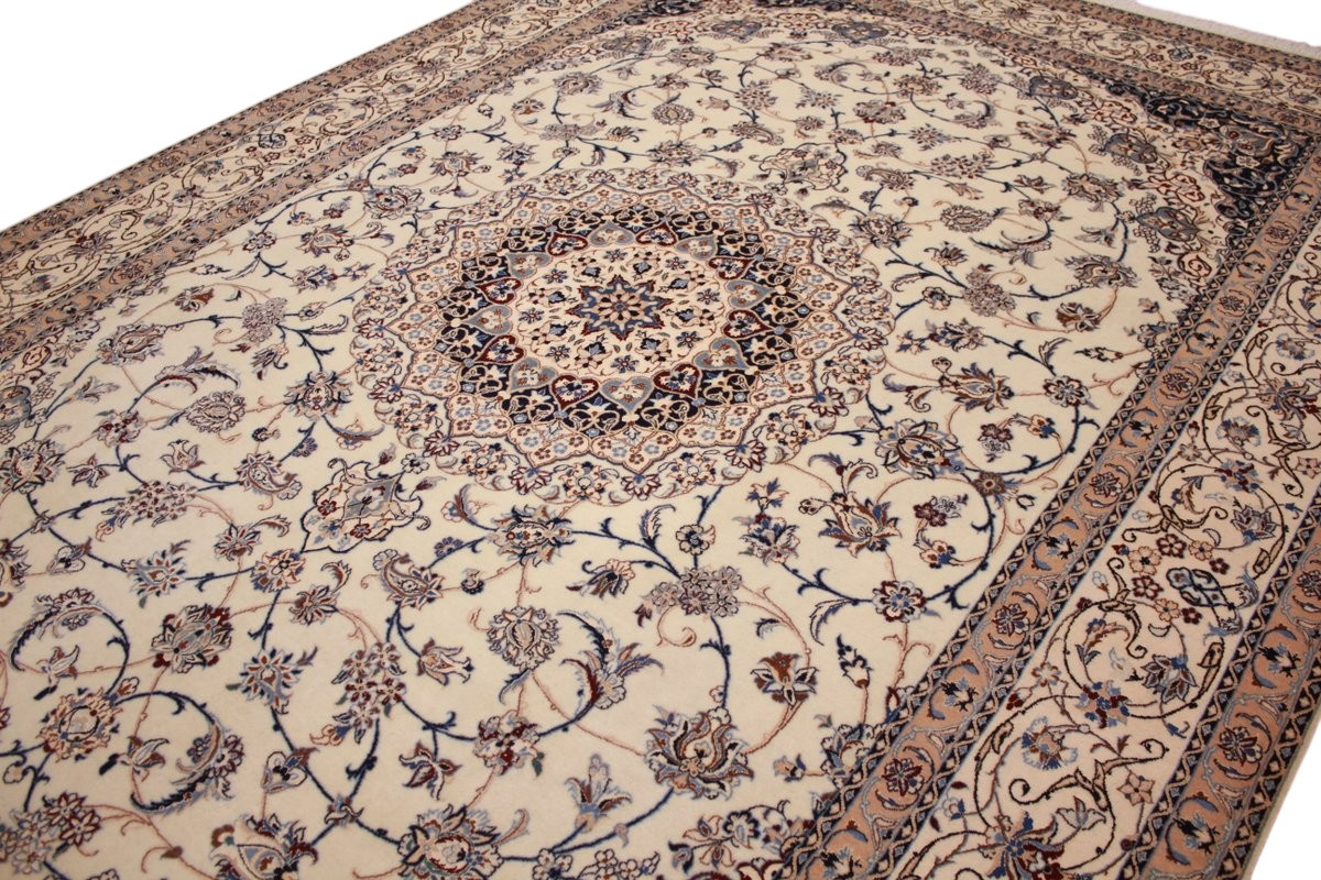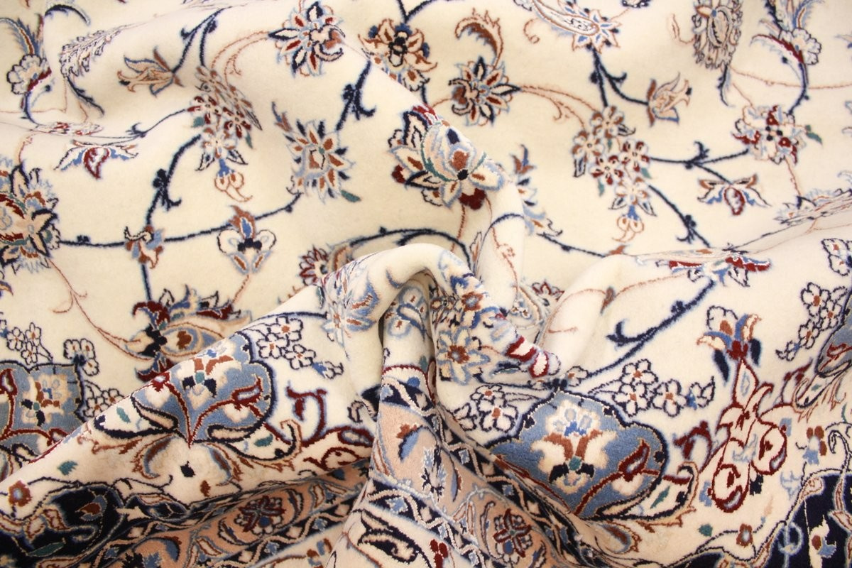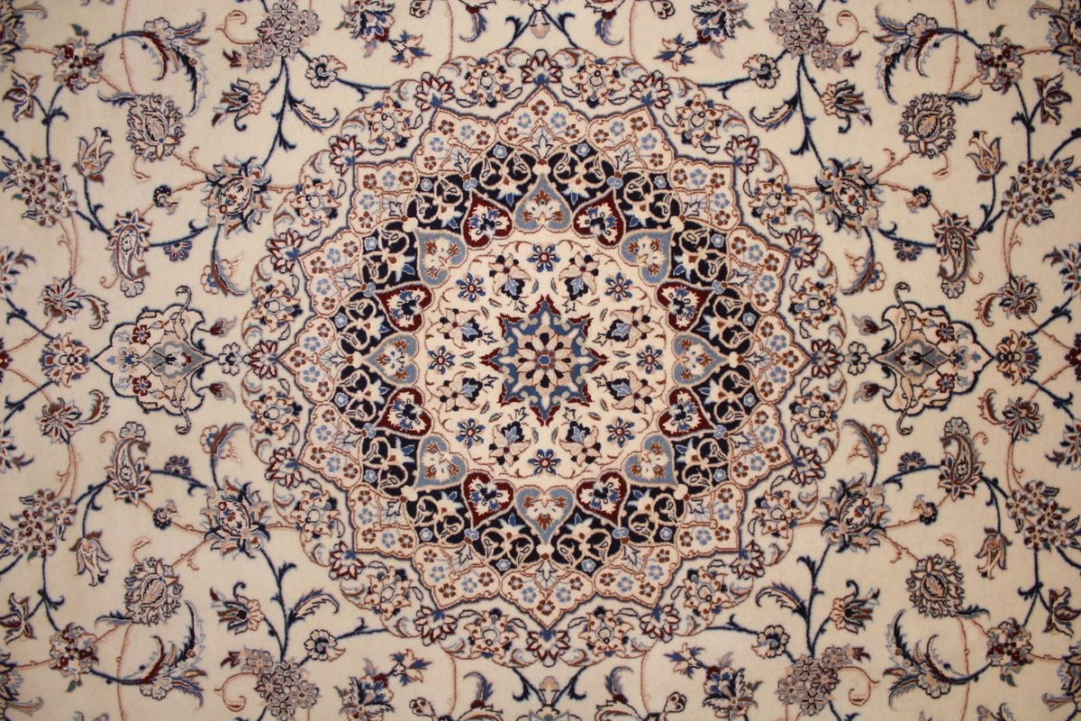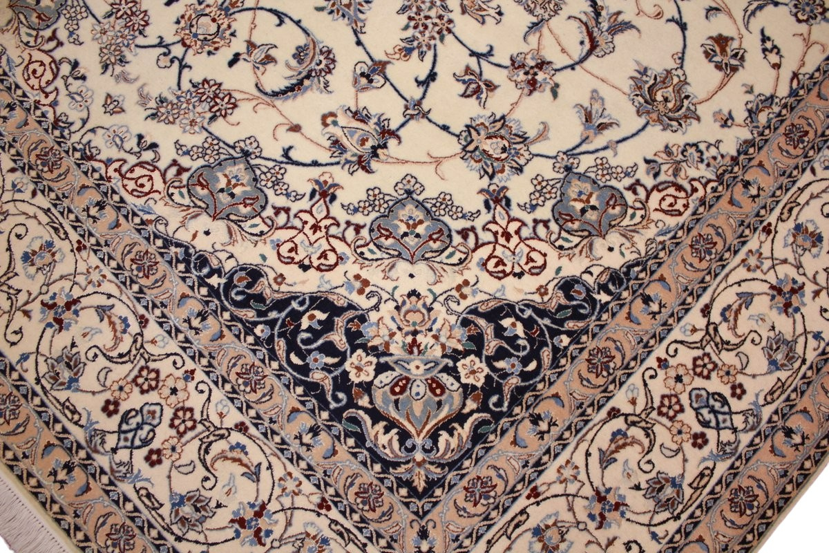 Its talented master weavers may take several years to complete a carpet. Though very similar in appearance to Isfahans, they are easily identifiable because of their distinctive color scheme and smooth, closely clipped pile. Nain carpets usually feature an overall arabesque and curvilinear floral pattern of blues against a warm beige or ivory background, with touches of greens and whites. Over 300 to 500 knots per square inch are not uncommon in Nains. Excellent grades of wool and silk are used on foundations of fine cotton or silk.