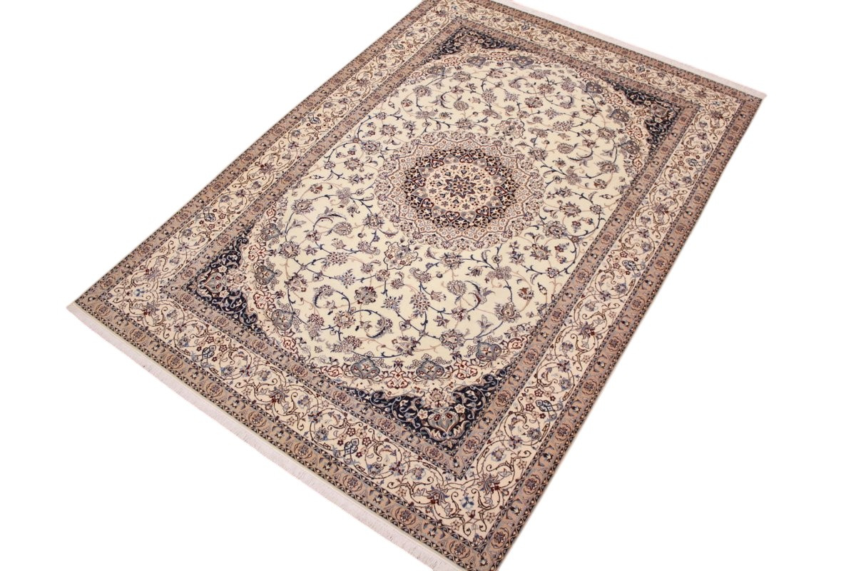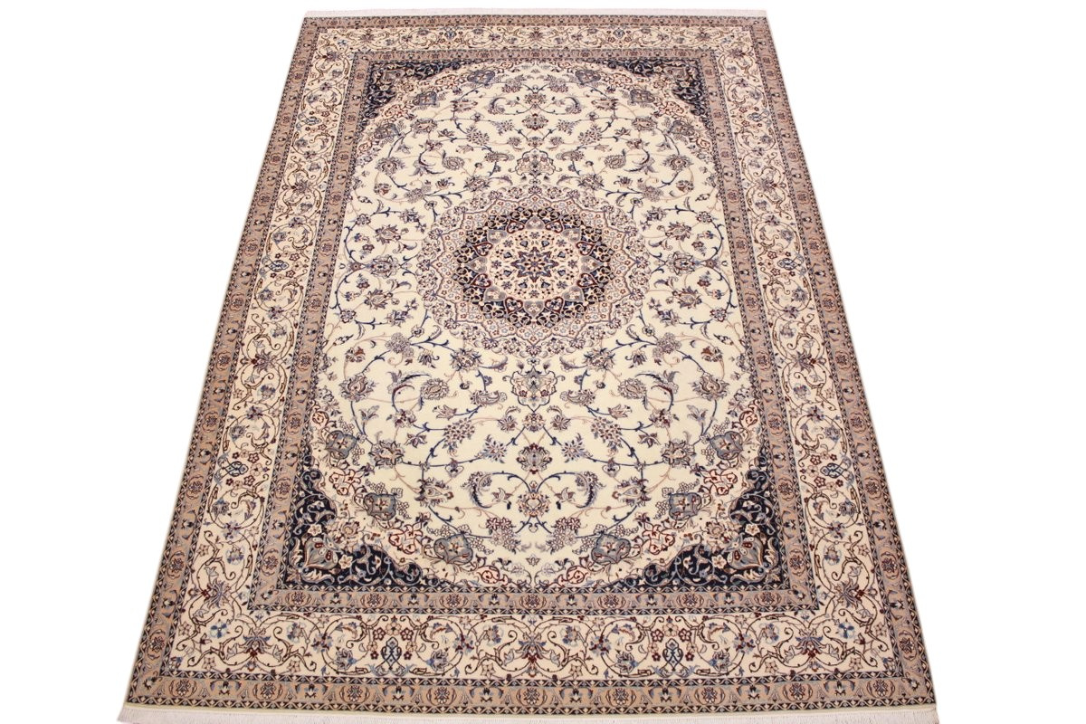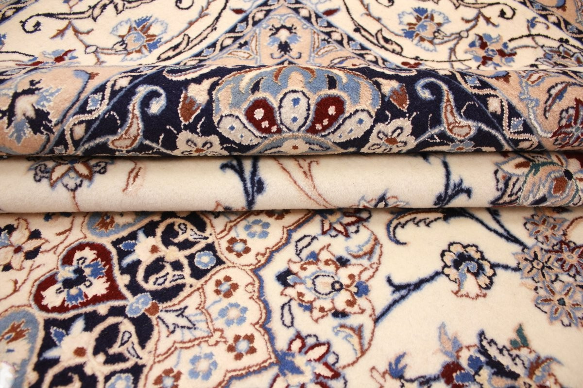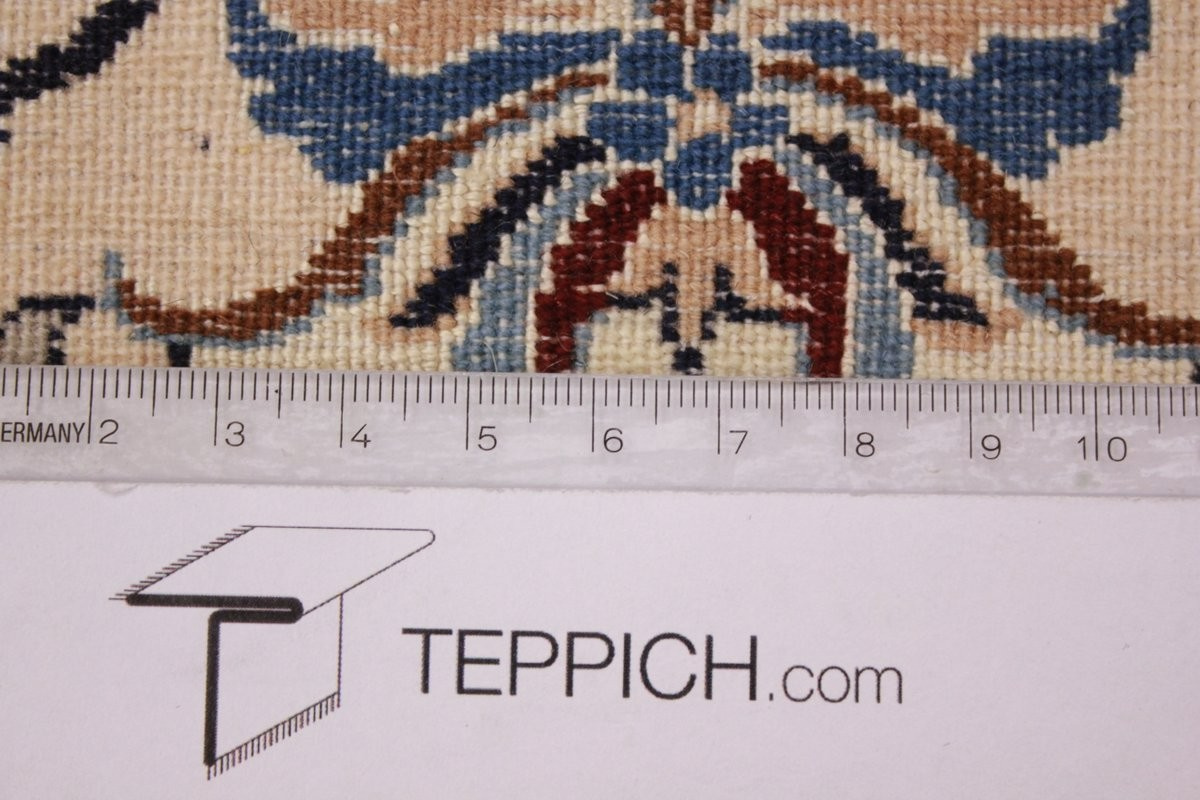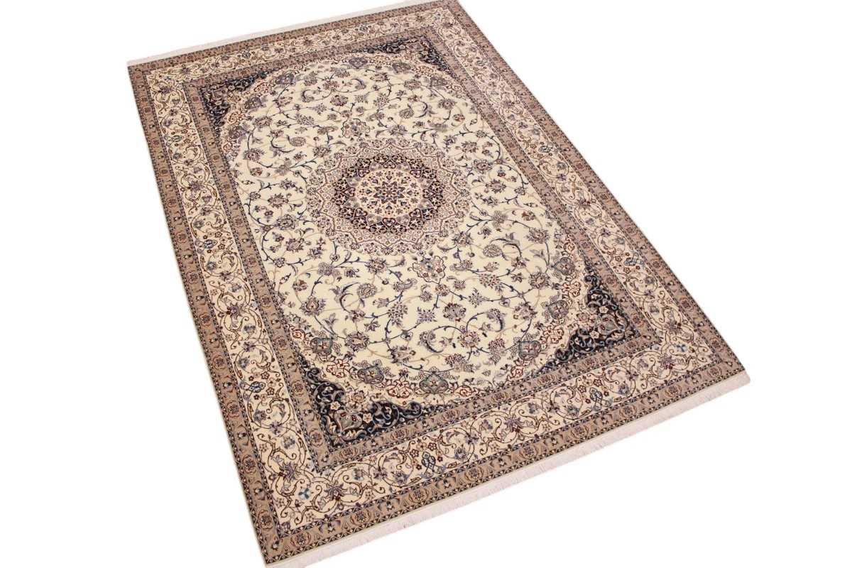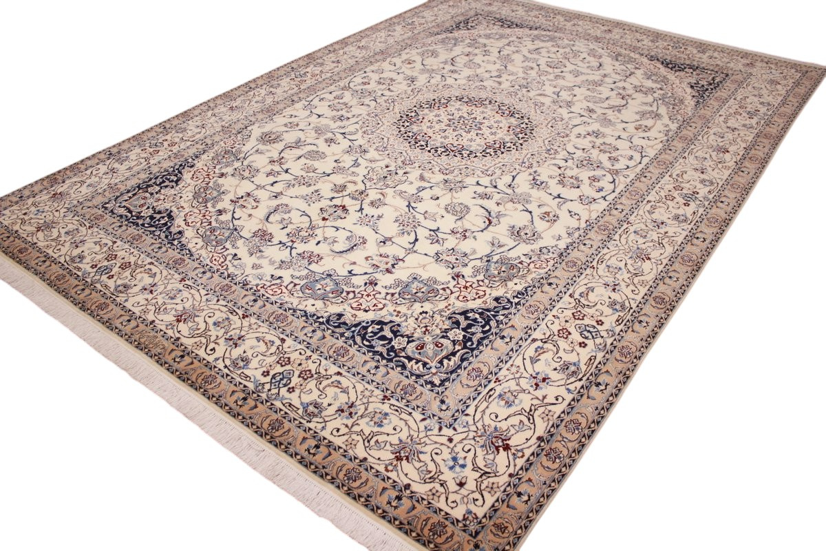 Its talented master weavers may take several years to complete a carpet. Though very similar in appearance to Isfahans, they are easily identifiable because of their distinctive color scheme and smooth, closely clipped pile. Nain carpets usually feature an overall arabesque and curvilinear floral pattern of blues against a warm beige or ivory background, with touches of greens and whites. Over 300 to 500 knots per square inch are not uncommon in Nains. Excellent grades of wool and silk are used on foundations of fine cotton or silk.