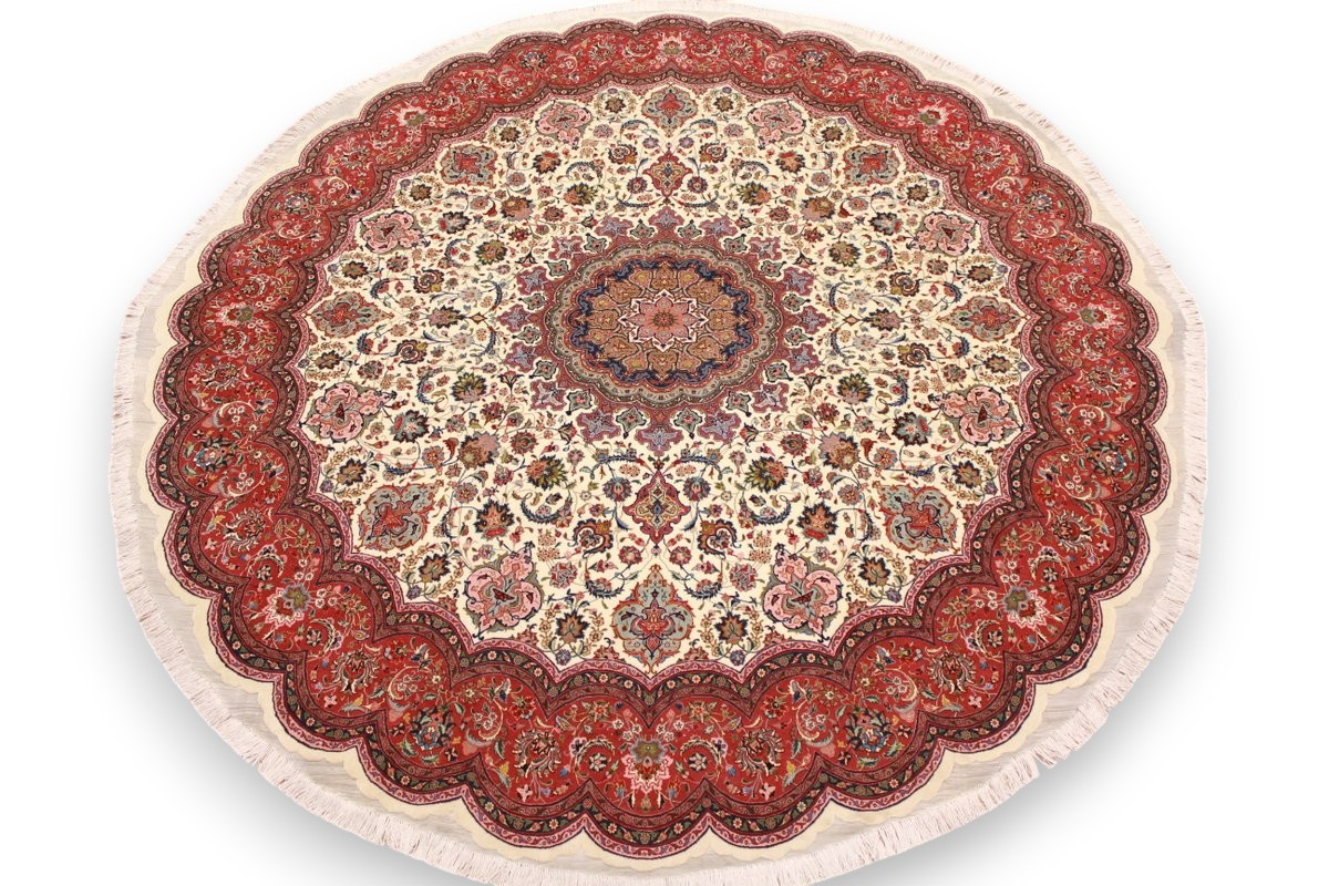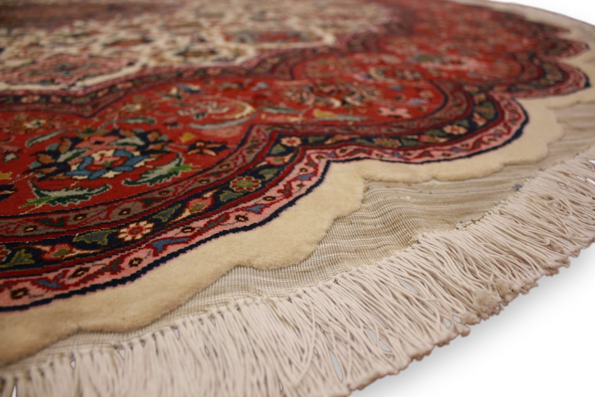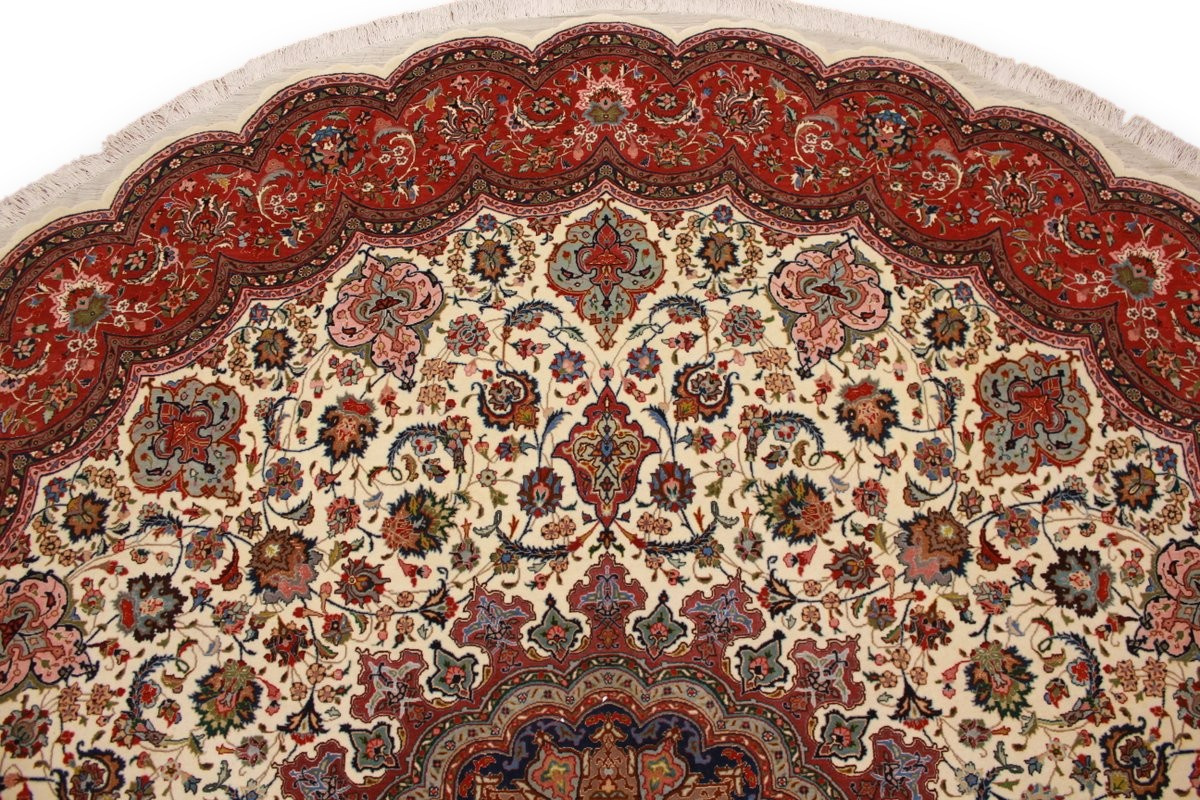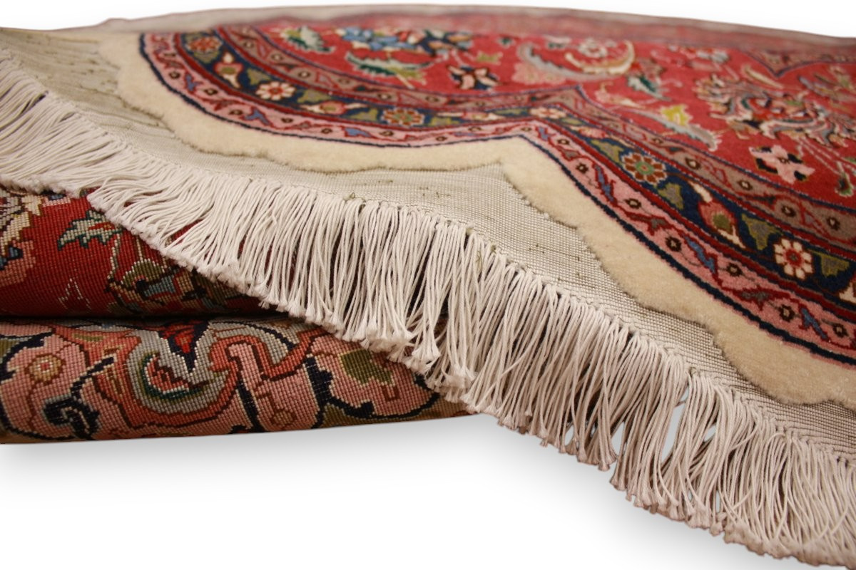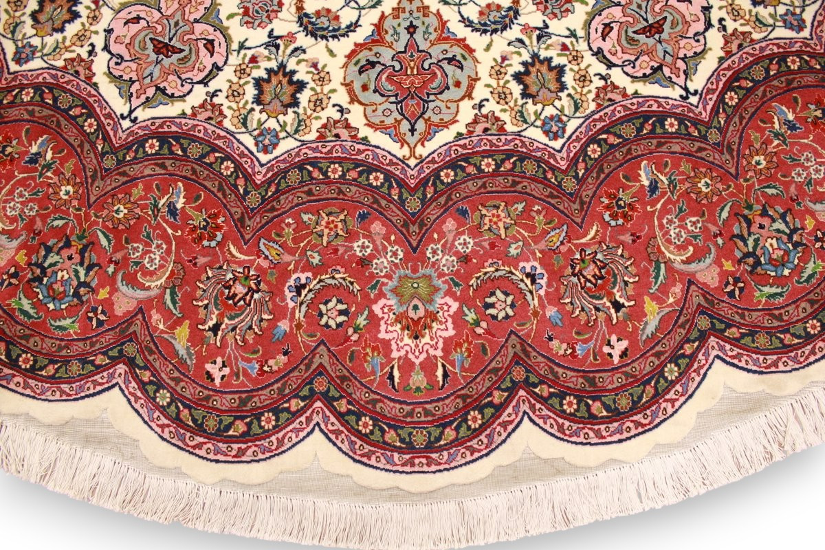 Taabriz is an ancient city in north-western Persia, and the most prolific of all carpet centres. The quality in their carpets is generally exceptional, with most on a base of fine cotton, but sometimes on pure silk. There are many unique designs but typically the pattern in a Taabriz rug is filled with dense floral motifs, large palmettes, vases, or vivid hunting scenes or pictorials in the field. These can be with or without a medallion, and geometric designs are also seen. Taabriz has sub-styles as well. These include the restrained and elegant 'Mahi' in co-ordinated borders of subdued tones that fit in anywhere; the Naqsheh, with its plethora of pinks on beige, or very occasionally, black; and the wild but beautiful Tabatabaie, always in touches of orange, lemon green and beige. The finer Naqsheh and Mahi are mostly in highly-priced Kurk wool, and silk is often used to outline lavishly the highlights of the rug.