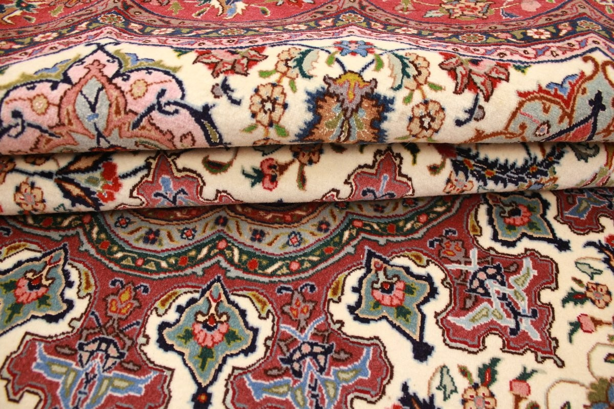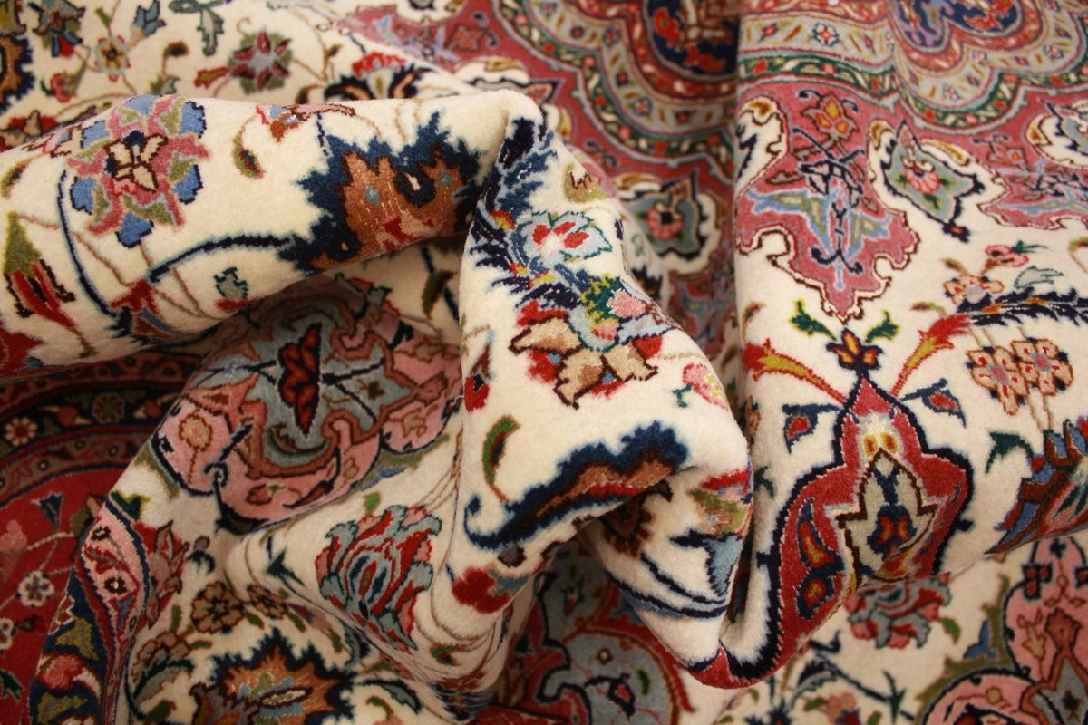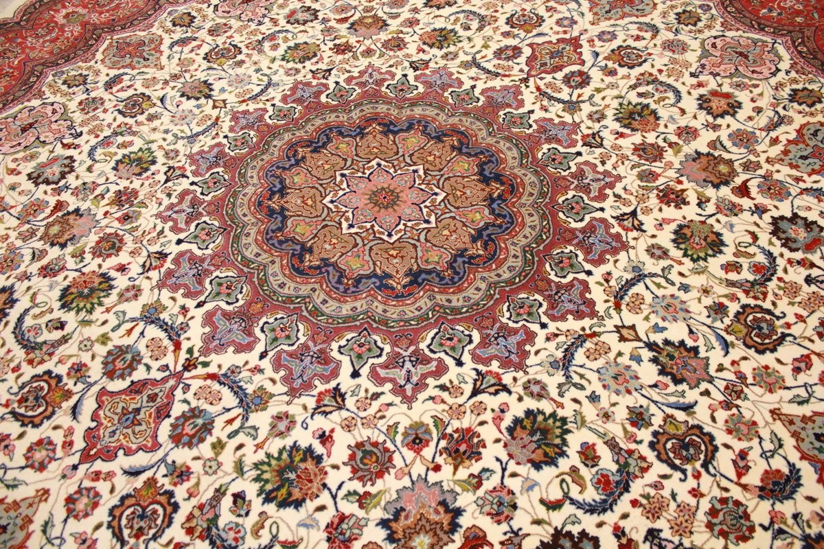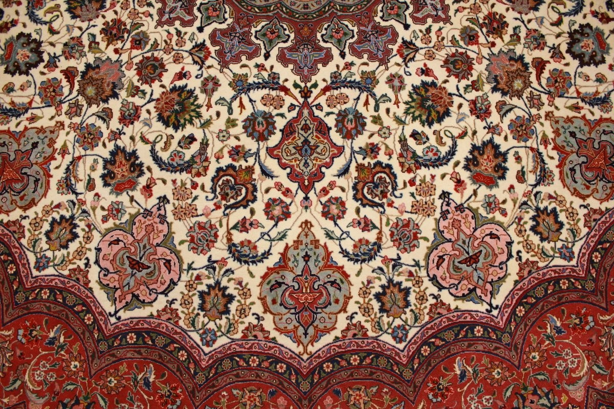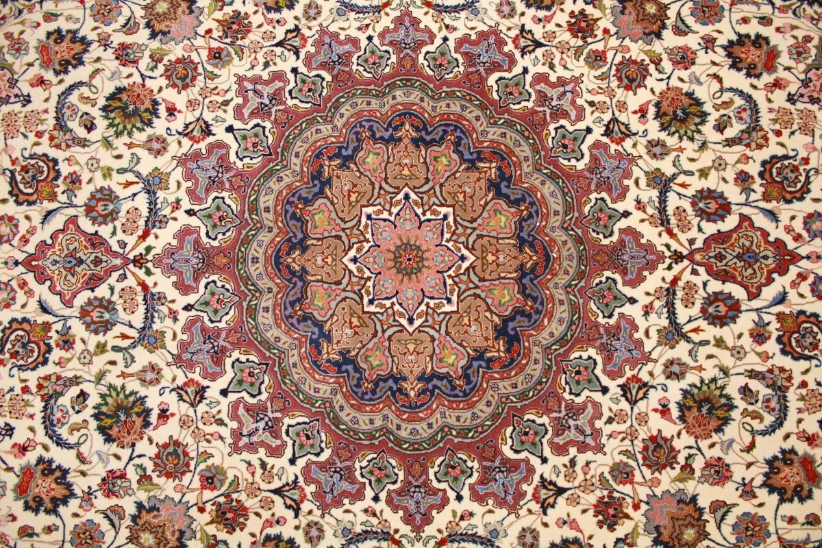 Taabriz is probably the most prolific carpet-producing center in the world, and certainly one of the oldest. This enchanted city was established more than a thousand years ago. After many invasions, occupations and wars, Taabriz took the ancient techniques of the past and created a huge rug-exporting industry. The finest era of Persian rug weaving was the Safavid Dynasty (1499 - 1722), when the Safavids overthrew the Turks who had occupied Taabriz. They gave the city one of the first Royal workshops, making it the artistic center of Persian culture. In spite of all the later conquests and political restructurings, Taabriz managed to keep these ancient traditions alive. Today, many rugs produced in Taabriz emulate the artististic heritage of the Persian Safavid carpet, and when a designer in any part of the world wants to commission a certain pattern to be hand-woven, Taabriz is the city that he visits. Attesting to their pride in producing fine carpets, the master-weavers of Taabriz often weave their signature into a part of the carpet's border. These signatures can, of course, be found on extremely fine rugs made in other cities, but a signature on the 'ceremonial' border of a Taabriz Naqsheh is the ultimate in formality and sophistication. The material used for the pile of these rugs are wool, silk, or a combination of the two. A beautiful blend of fine Kurk wool and silk is the most common in a fine Taabriz, with wool only used in those of average quality. In the very finest carpets, the foundation of the rug is pure silk instead of cotton, and some even have 18 or 24 karat gold threads woven into the foundation, with 300 to 800 KPSI not being uncommon.