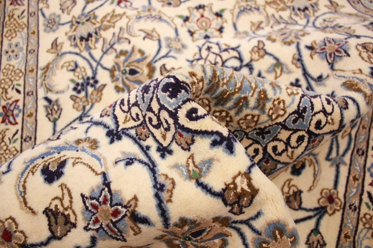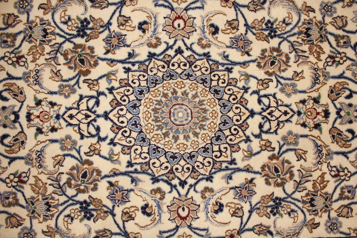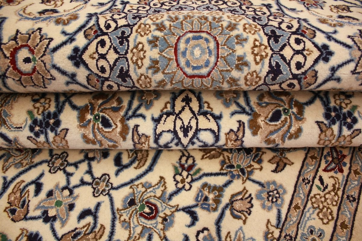Its talented master weavers may take several years to complete a carpet. Though very similar in appearance to Isfahans, they are easily identifiable because of their distinctive color scheme and smooth, closely clipped pile. Nain carpets usually feature an overall arabesque and curvilinear floral pattern of blues against a warm beige or ivory background, with touches of greens and whites. Over 300 to 500 knots per square inch are not uncommon in Nains. Excellent grades of wool and silk are used on foundations of fine cotton or silk.