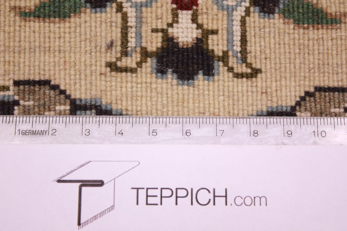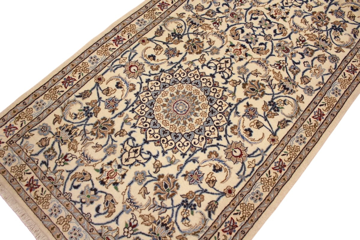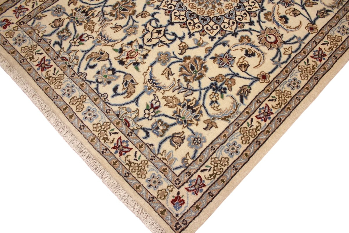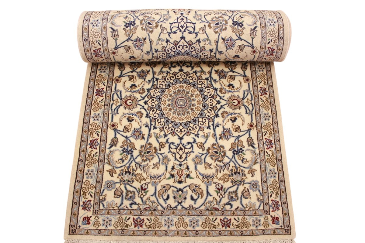 Its talented master weavers may take several years to complete a carpet. Though very similar in appearance to Isfahans, they are easily identifiable because of their distinctive color scheme and smooth, closely clipped pile. Nain carpets usually feature an overall arabesque and curvilinear floral pattern of blues against a warm beige or ivory background, with touches of greens and whites. Over 300 to 500 knots per square inch are not uncommon in Nains. Excellent grades of wool and silk are used on foundations of fine cotton or silk.