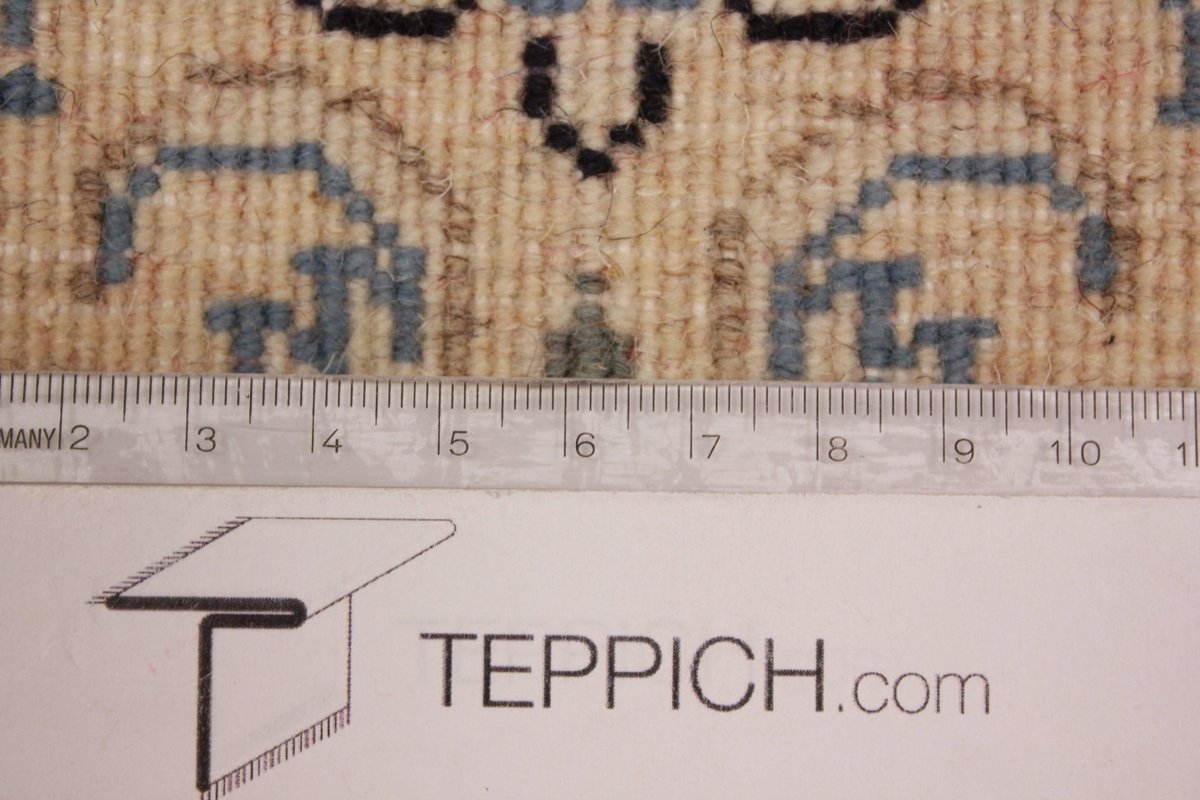 Its talented master weavers may take several years to complete a carpet. Though very similar in appearance to Isfahans, they are easily identifiable because of their distinctive color scheme and smooth, closely clipped pile. Nain carpets usually feature an overall arabesque and curvilinear floral pattern of blues against a warm beige or ivory background, with touches of greens and whites. Over 300 to 500 knots per square inch are not uncommon in Nains. Excellent grades of wool and silk are used on foundations of fine cotton or silk.