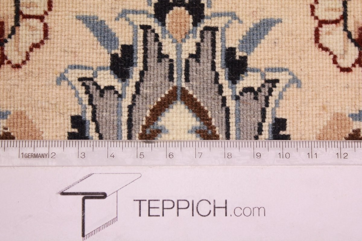 Its talented master weavers may take several years to complete a carpet. Though very similar in appearance to Isfahans, they are easily identifiable because of their distinctive color scheme and smooth, closely clipped pile. Nain carpets usually feature an overall arabesque and curvilinear floral pattern of blues against a warm beige or ivory background, with touches of greens and whites. Over 300 to 500 knots per square inch are not uncommon in Nains. Excellent grades of wool and silk are used on foundations of fine cotton or silk.