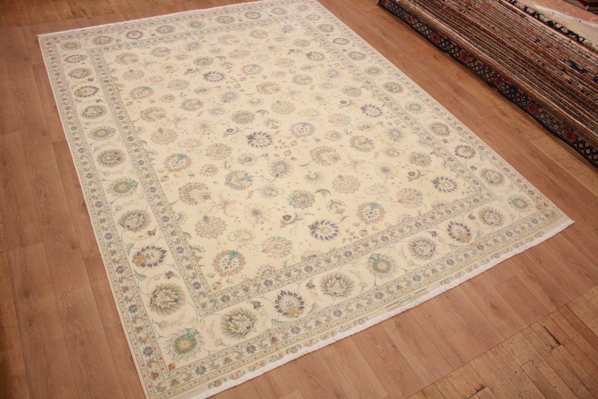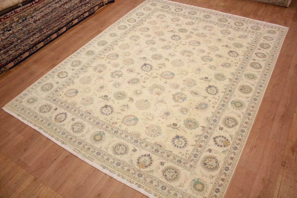 Taabriz is an ancient city in north-western Persia, and the most prolific of all carpet centres. The quality in their carpets is generally exceptional, with most on a base of fine cotton, but sometimes on pure silk. There are many unique designs but typically the pattern in a Taabriz rug is filled with dense floral motifs, large palmettes, vases, or vivid hunting scenes or pictorials in the field. These can be with or without a medallion, and geometric designs are also seen. Taabriz has sub-styles as well. These include the restrained and elegant 'Mahi' in co-ordinated borders of subdued tones that fit in anywhere; the Naqsheh, with its plethora of pinks on beige, or very occasionally, black; and the wild but beautiful Tabatabaie, always in touches of orange, lemon green and beige. The finer Naqsheh and Mahi are mostly in highly-priced Kurk wool, and silk is often used to outline lavishly the highlights of the rug.