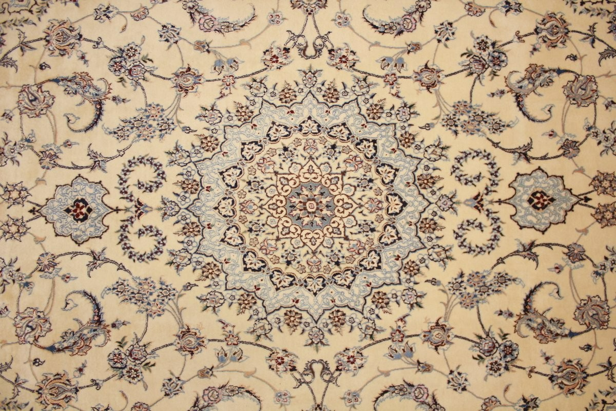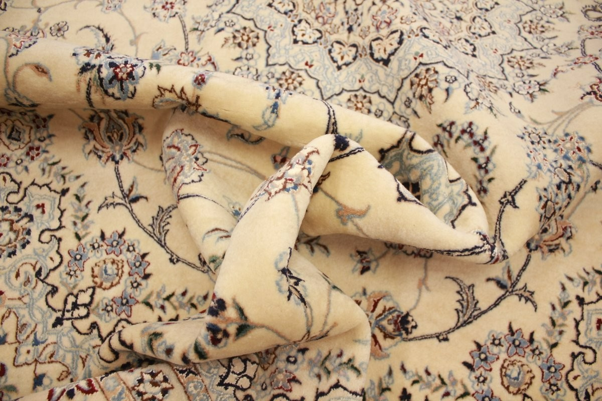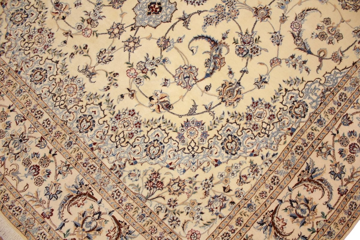 Its talented master weavers may take several years to complete a carpet. Though very similar in appearance to Isfahans, they are easily identifiable because of their distinctive color scheme and smooth, closely clipped pile. Nain carpets usually feature an overall arabesque and curvilinear floral pattern of blues against a warm beige or ivory background, with touches of greens and whites. Over 300 to 500 knots per square inch are not uncommon in Nains. Excellent grades of wool and silk are used on foundations of fine cotton or silk.