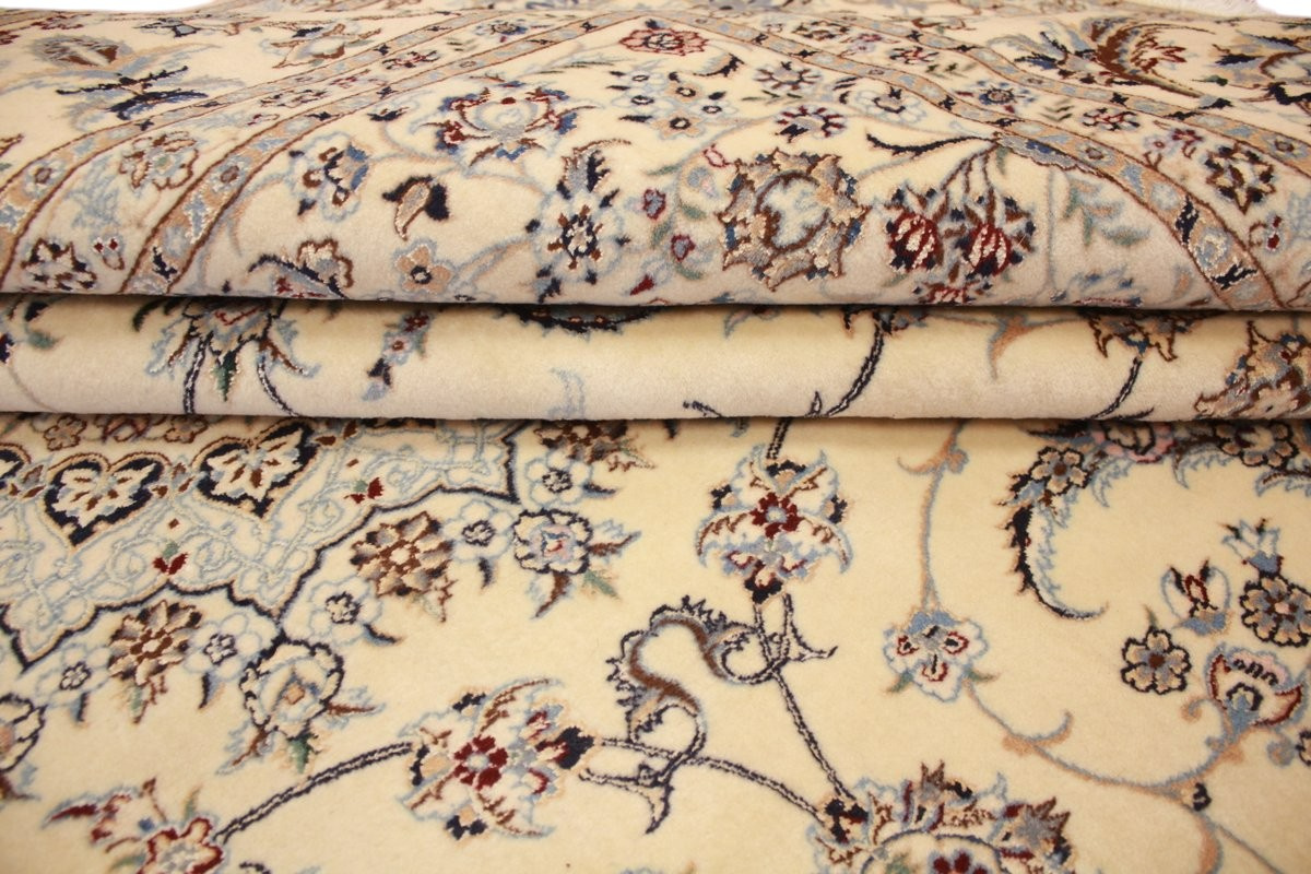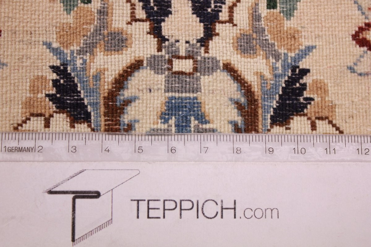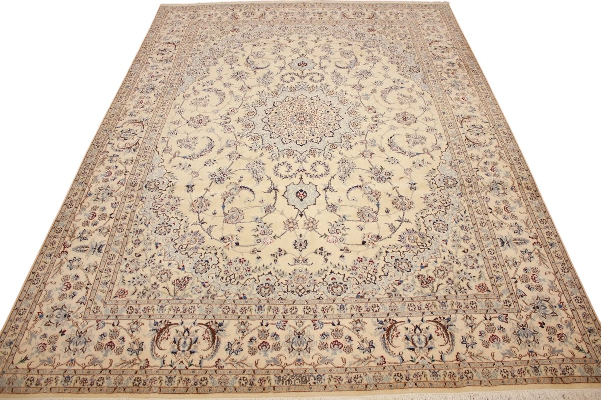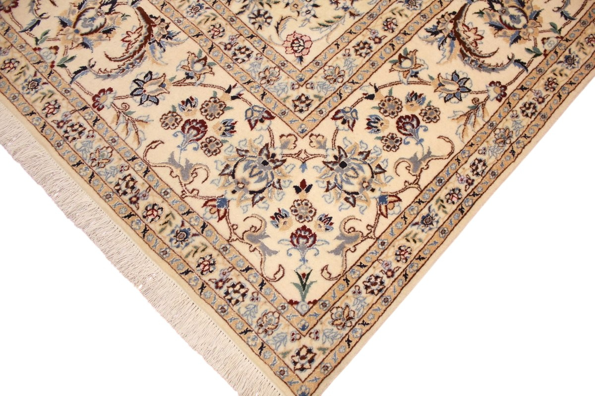 Its talented master weavers may take several years to complete a carpet. Though very similar in appearance to Isfahans, they are easily identifiable because of their distinctive color scheme and smooth, closely clipped pile. Nain carpets usually feature an overall arabesque and curvilinear floral pattern of blues against a warm beige or ivory background, with touches of greens and whites. Over 300 to 500 knots per square inch are not uncommon in Nains. Excellent grades of wool and silk are used on foundations of fine cotton or silk.
