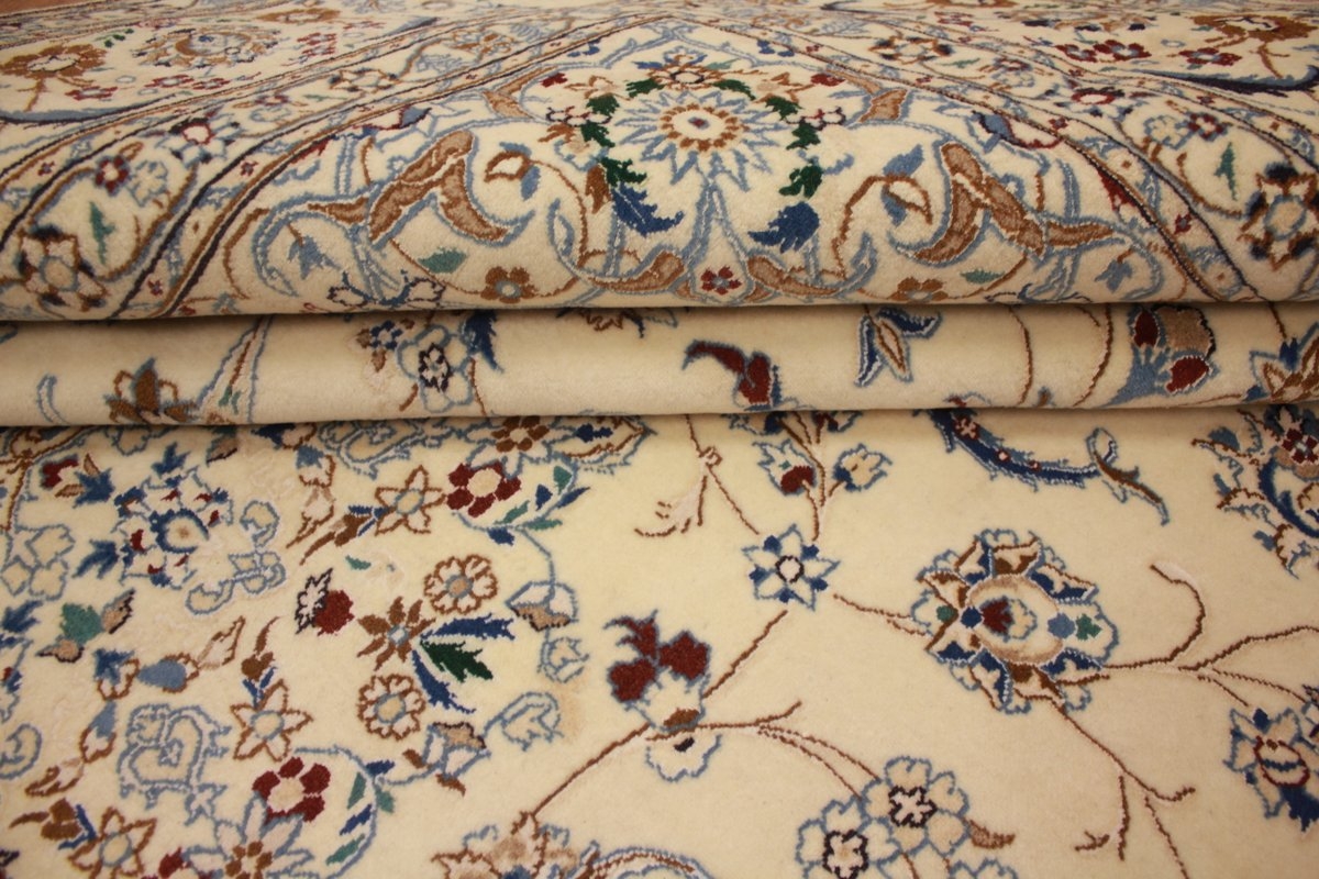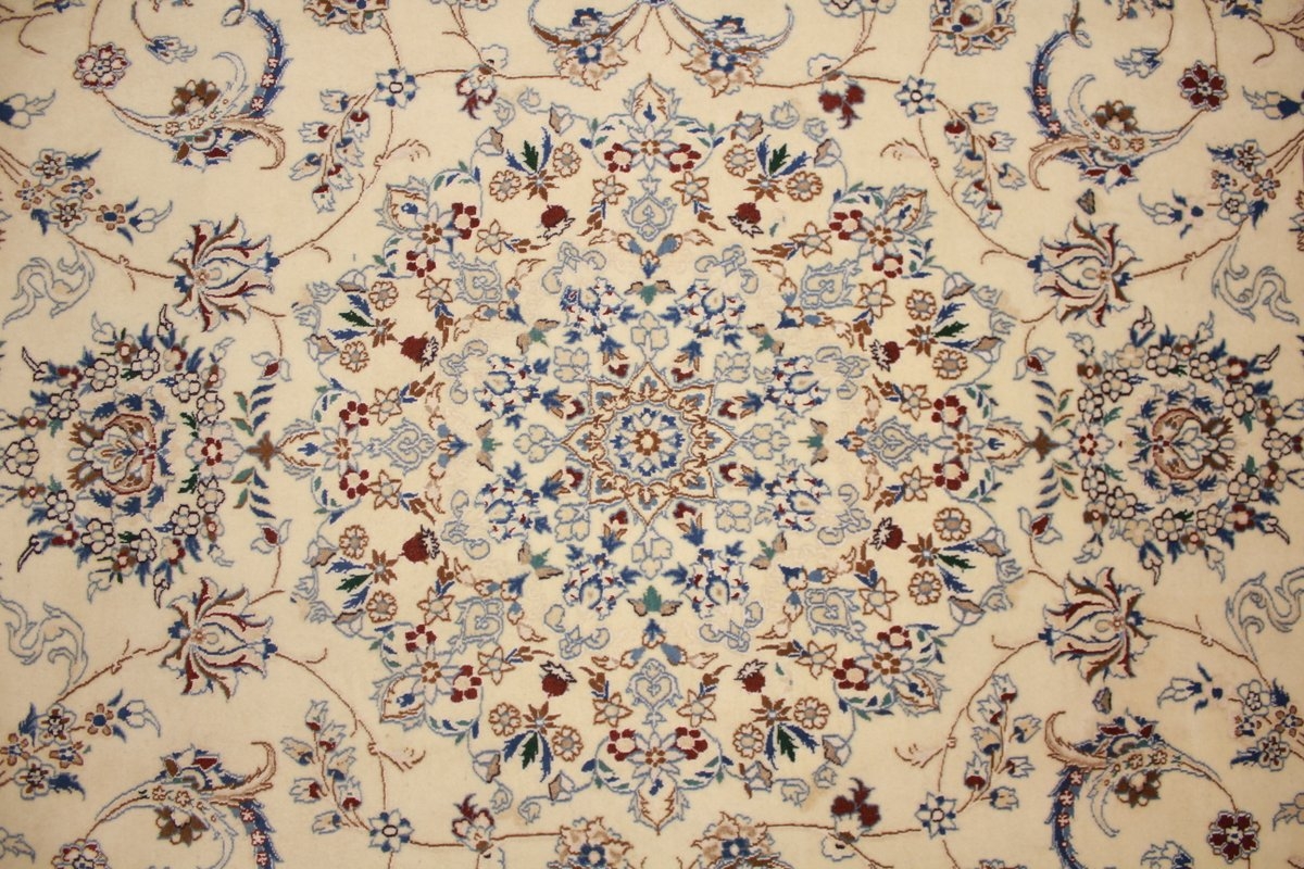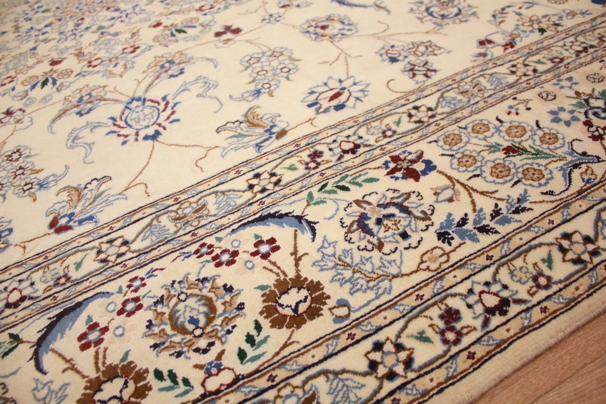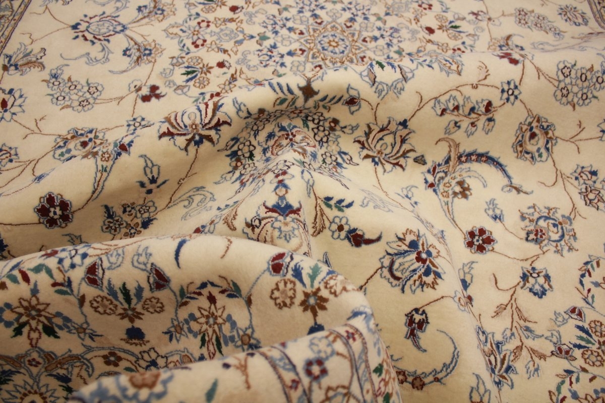 Its talented master weavers may take several years to complete a carpet. Though very similar in appearance to Isfahans, they are easily identifiable because of their distinctive color scheme and smooth, closely clipped pile. Nain carpets usually feature an overall arabesque and curvilinear floral pattern of blues against a warm beige or ivory background, with touches of greens and whites. Over 300 to 500 knots per square inch are not uncommon in Nains. Excellent grades of wool and silk are used on foundations of fine cotton or silk.
