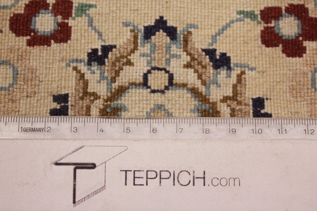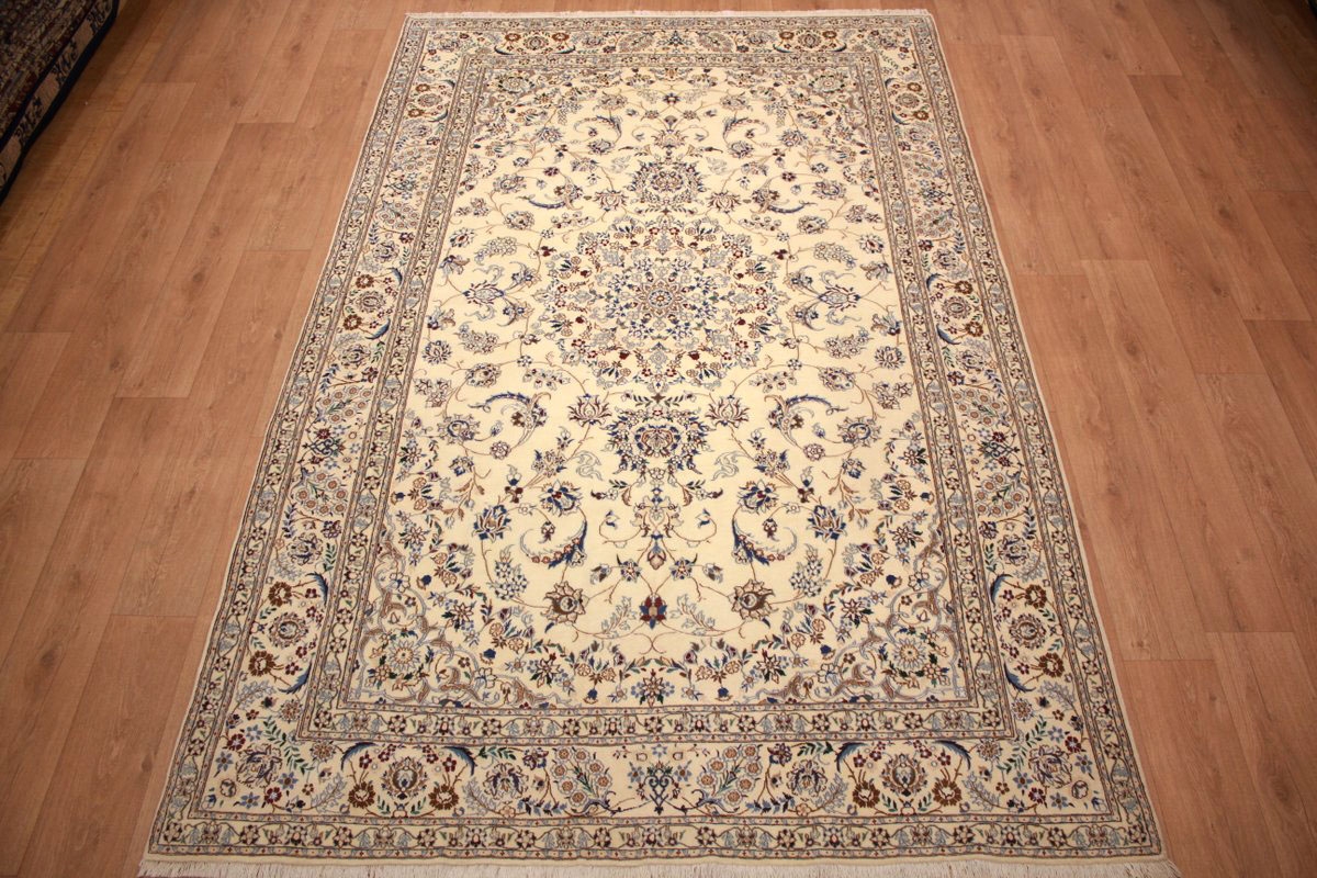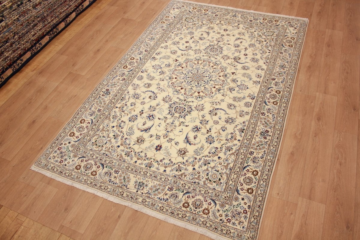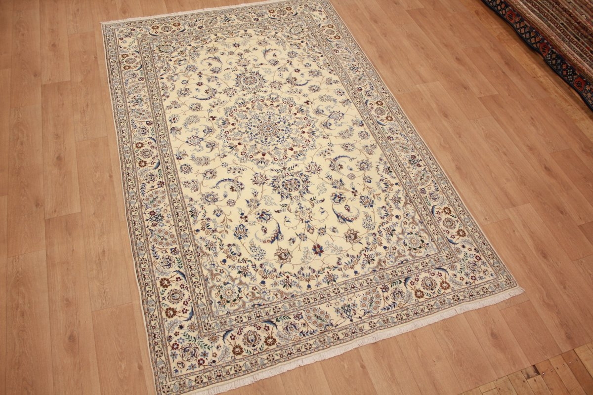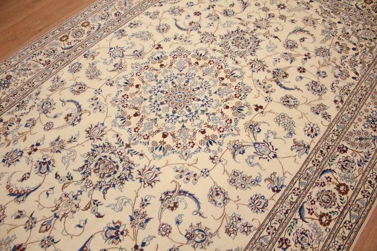 Its talented master weavers may take several years to complete a carpet. Though very similar in appearance to Isfahans, they are easily identifiable because of their distinctive color scheme and smooth, closely clipped pile. Nain carpets usually feature an overall arabesque and curvilinear floral pattern of blues against a warm beige or ivory background, with touches of greens and whites. Over 300 to 500 knots per square inch are not uncommon in Nains. Excellent grades of wool and silk are used on foundations of fine cotton or silk.