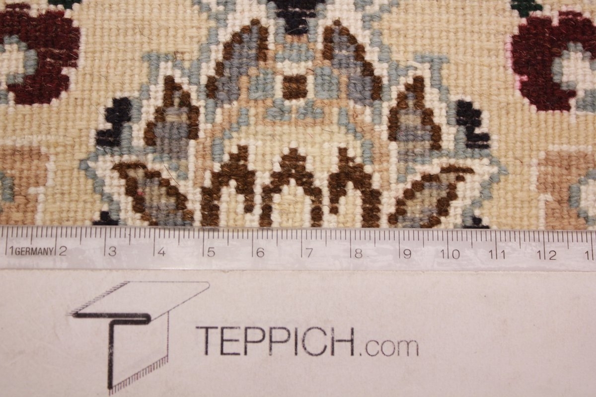 Its talented master weavers may take several years to complete a carpet. Though very similar in appearance to Isfahans, they are easily identifiable because of their distinctive color scheme and smooth, closely clipped pile. Nain carpets usually feature an overall arabesque and curvilinear floral pattern of blues against a warm beige or ivory background, with touches of greens and whites. Over 300 to 500 knots per square inch are not uncommon in Nains. Excellent grades of wool and silk are used on foundations of fine cotton or silk.