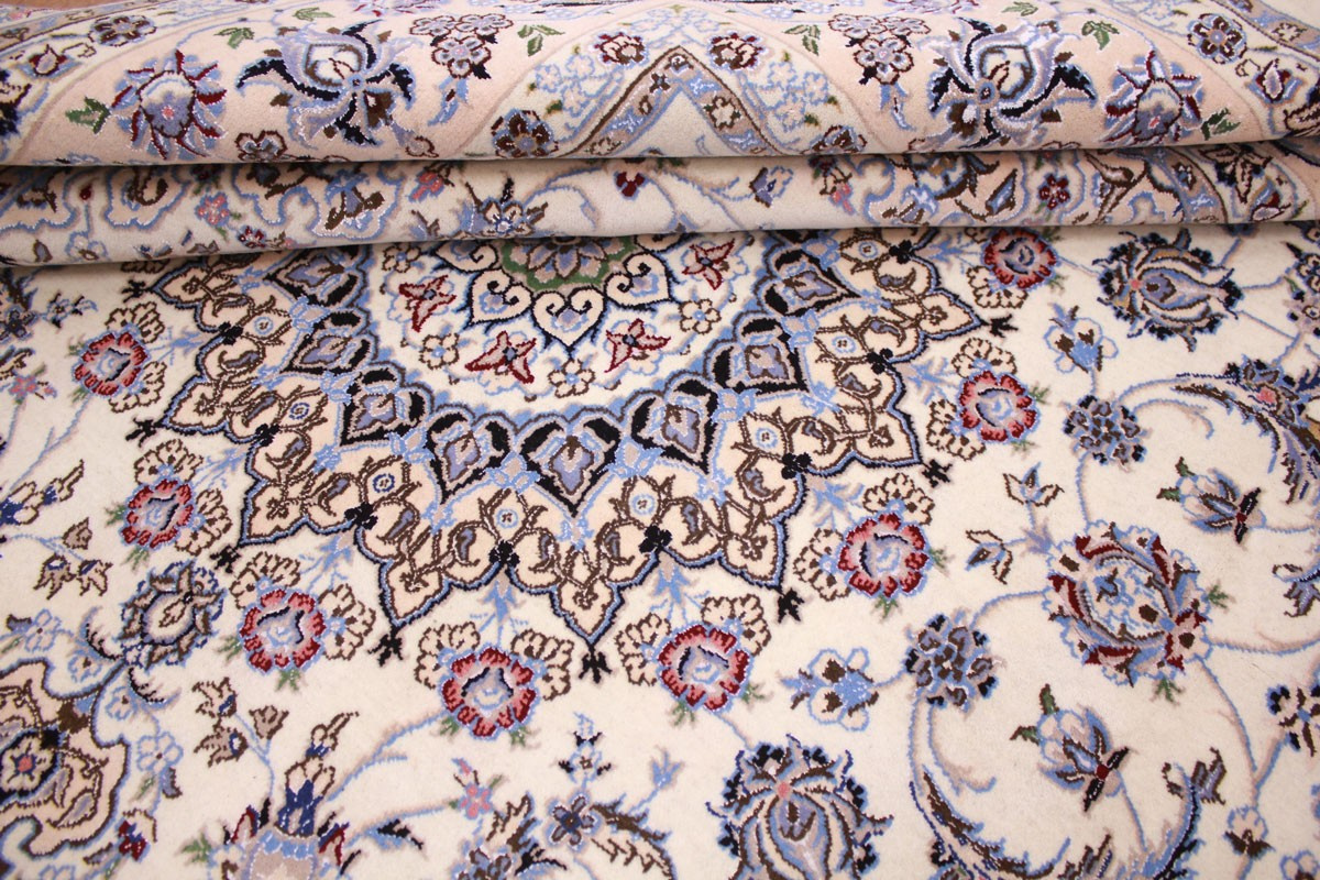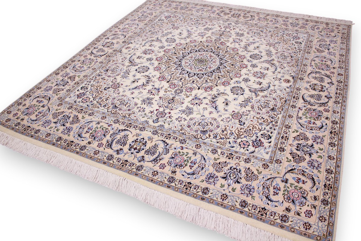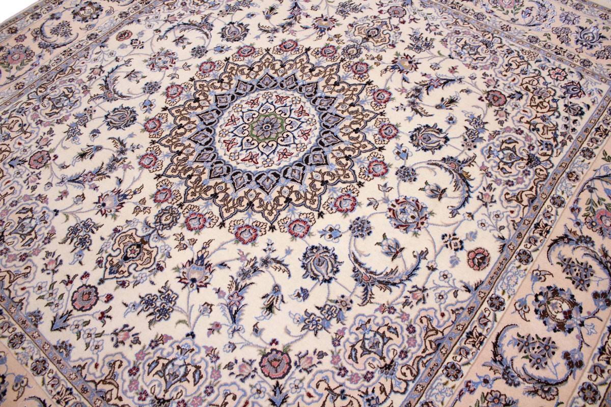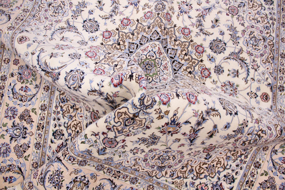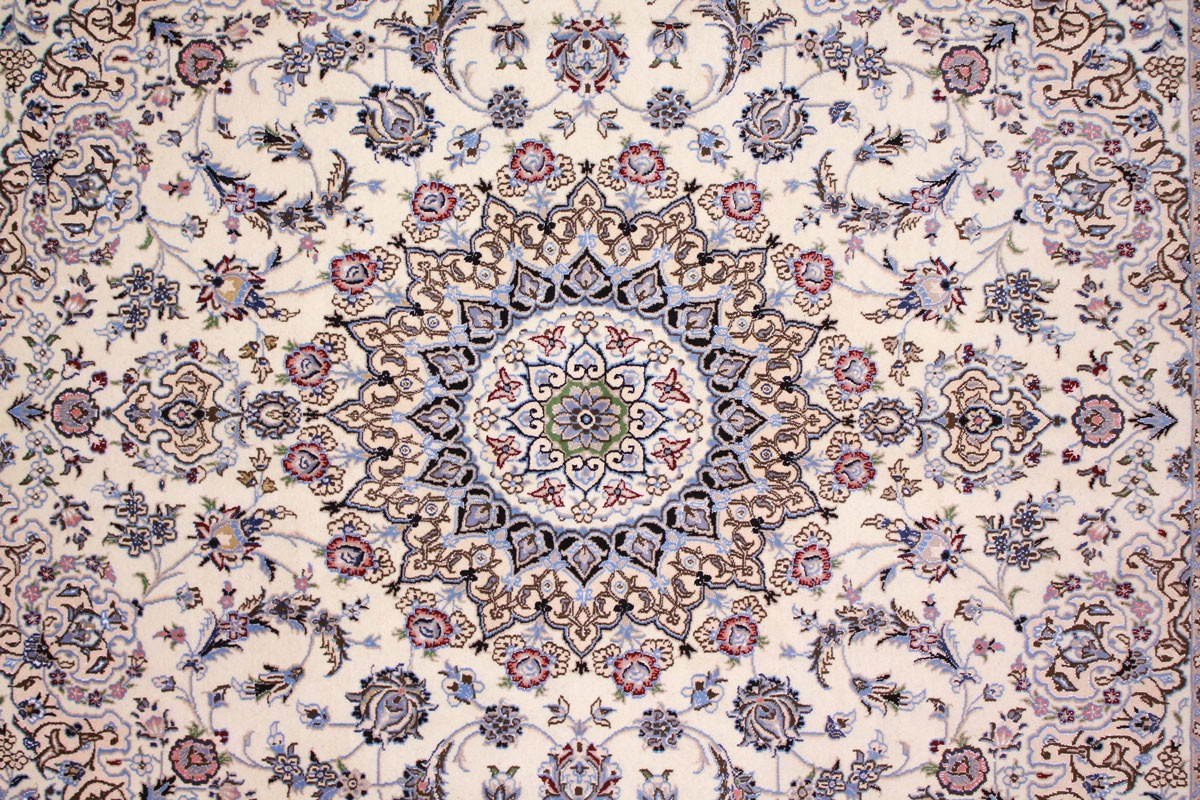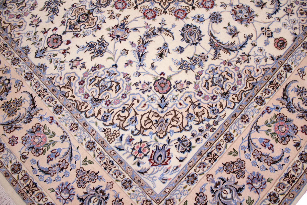Its talented master weavers may take several years to complete a carpet. Though very similar in appearance to Isfahans, they are easily identifiable because of their distinctive color scheme and smooth, closely clipped pile. Nain carpets usually feature an overall arabesque and curvilinear floral pattern of blues against a warm beige or ivory background, with touches of greens and whites. Over 300 to 500 knots per square inch are not uncommon in Nains. Excellent grades of wool and silk are used on foundations of fine cotton or silk.