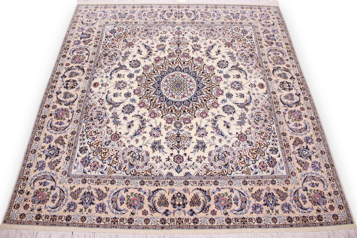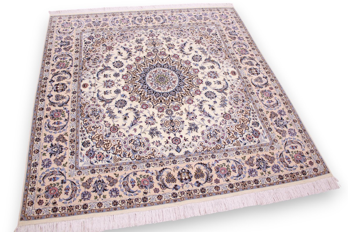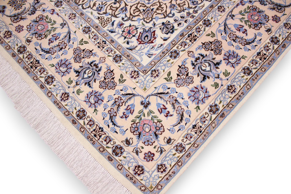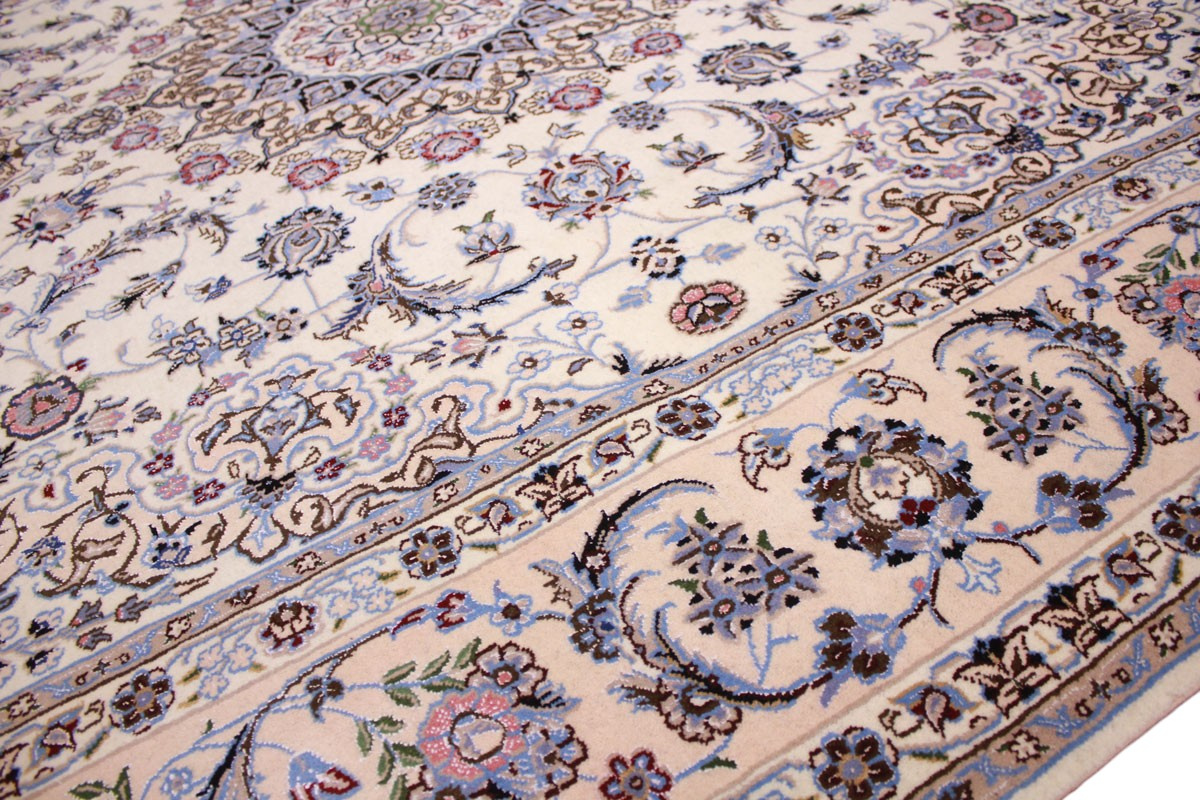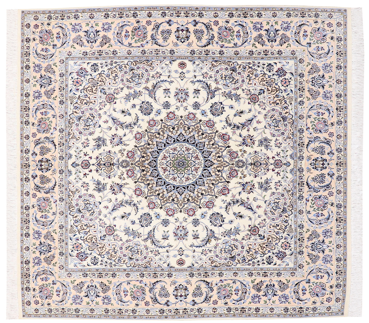 Its talented master weavers may take several years to complete a carpet. Though very similar in appearance to Isfahans, they are easily identifiable because of their distinctive color scheme and smooth, closely clipped pile. Nain carpets usually feature an overall arabesque and curvilinear floral pattern of blues against a warm beige or ivory background, with touches of greens and whites. Over 300 to 500 knots per square inch are not uncommon in Nains. Excellent grades of wool and silk are used on foundations of fine cotton or silk.