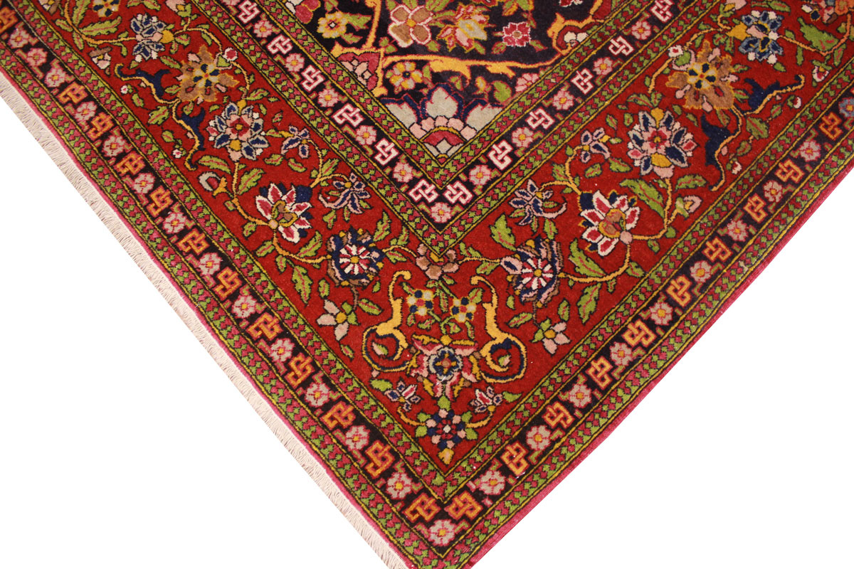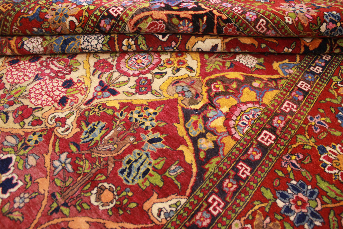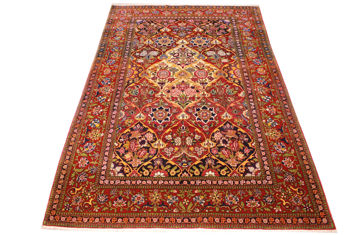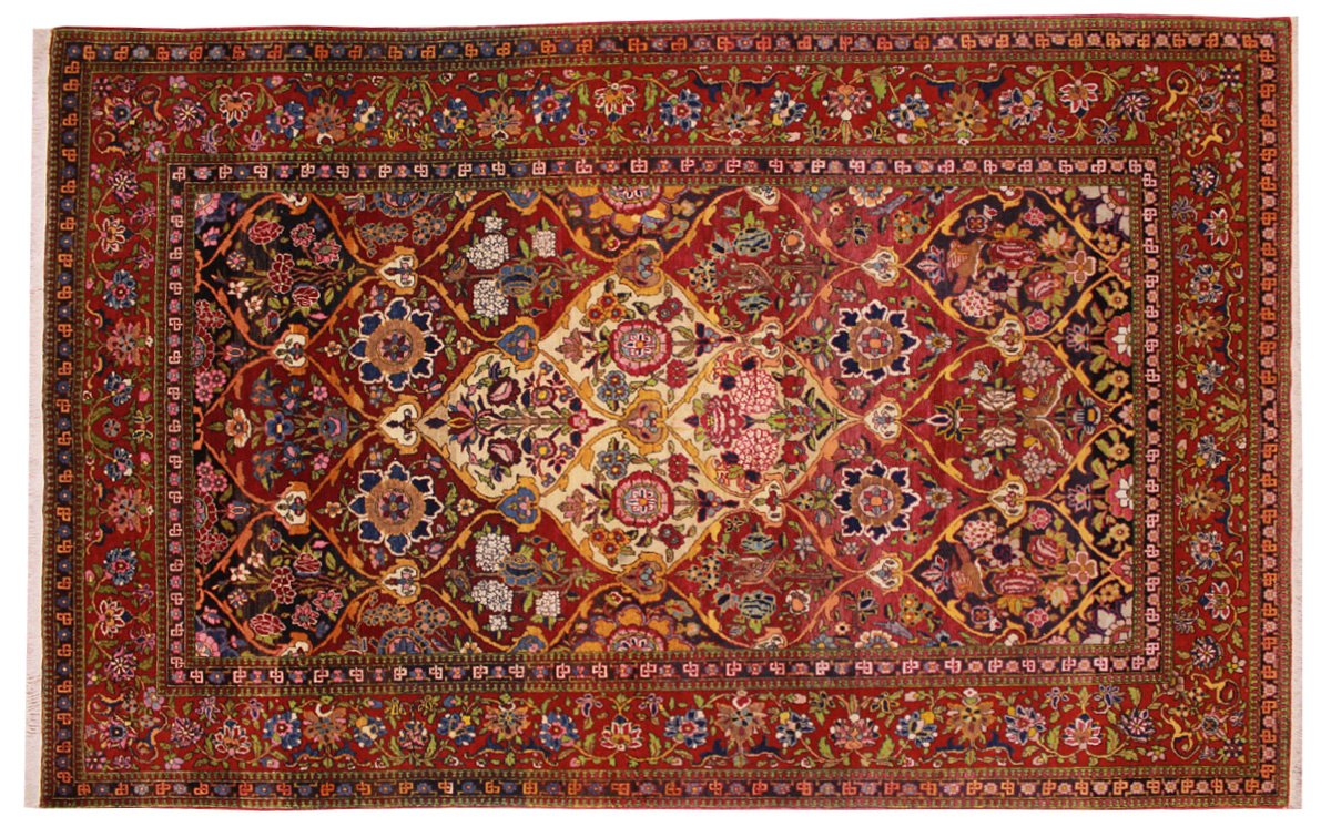 Besides the legendary cities of central Persia, such as Tehran, Isfahan, Kashan, Yazd, and Kerman, there are many smaller towns scattered throughout this area that also weave carpets of very high quality. Some of these small towns near Tehran are Veramin, Tafresh, Boroujerd, Khomaine and Taleghan, and, near Isfahan, are Najafabad, Josheghan, and the village of Maymeh. There are also a few near Kashan that produce fine rugs, such as Yazd and Ardekan. Kashan and Isfahan, being among the pioneers from the 16th century, have had enormous influence on their surroundings. Najafabad produces the designs of Isfahan, and Yazd and Ardekan the famous designs of Kashan, almost indistinguishably. An expert weaver in one of these cities will work non-stop on a carpet for many years. The famous asymmetrical Persian knot is generally the one used. The materials can be all wool, all silk or a mixture of the two. The foundation is usually cotton, except in very fine pieces, where it can be pure silk. Although rugs produced in the major cities of this region are technically superior to the ones produced on the outskirts, these pieces from the smaller towns of central Persia are still among the best. Many carpets from this area have been known to last several hundreds of years.