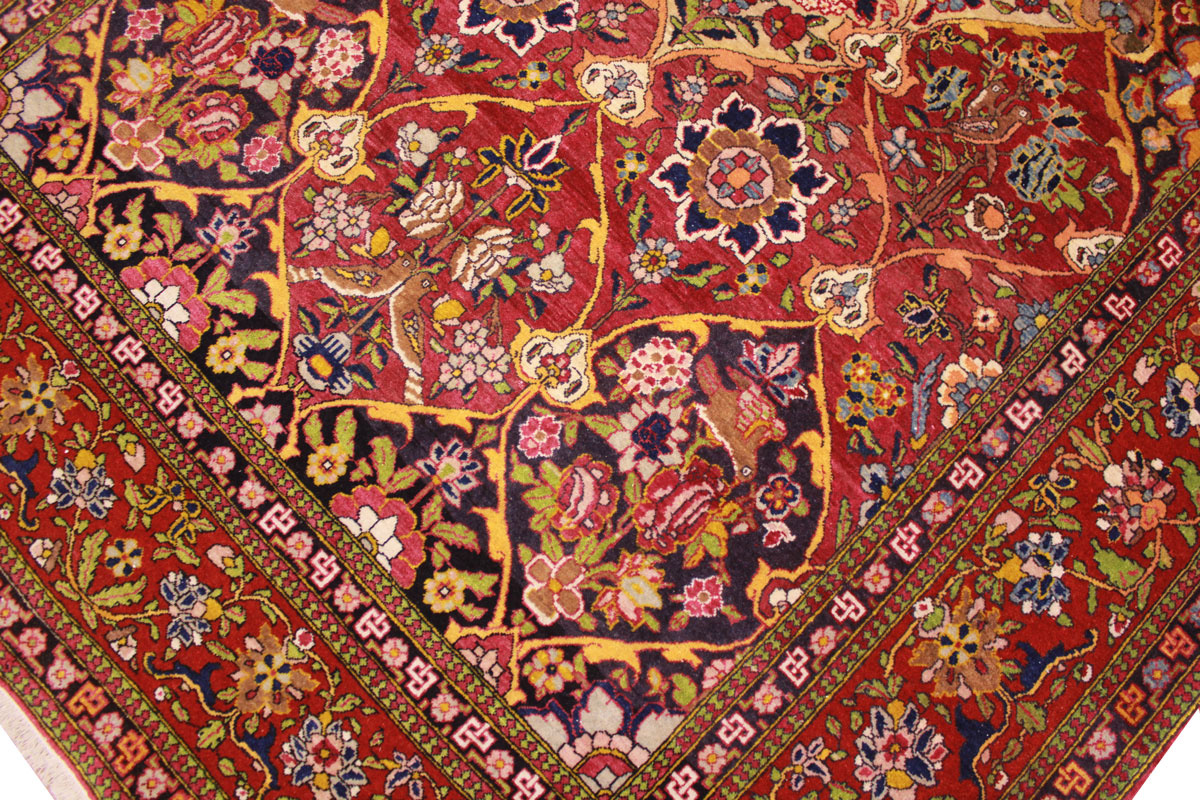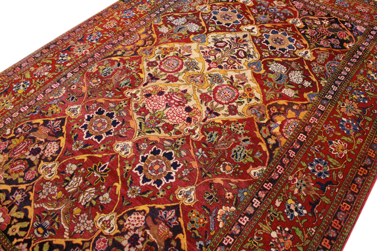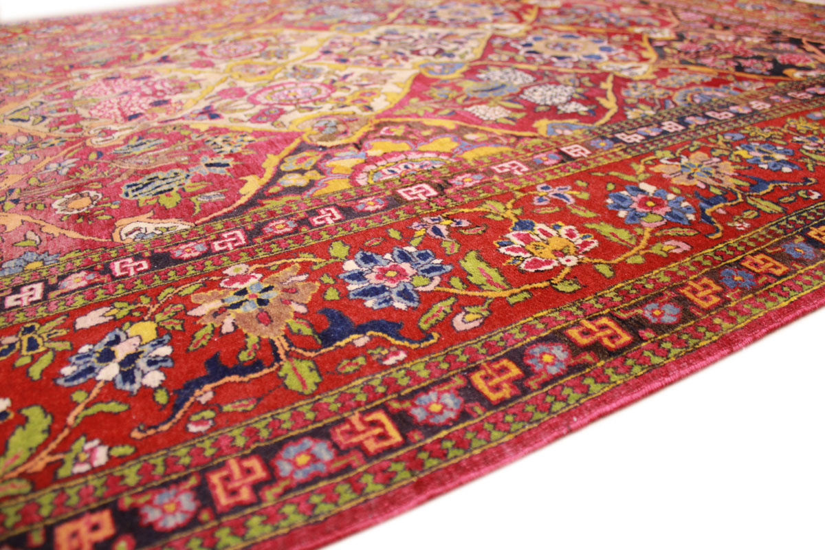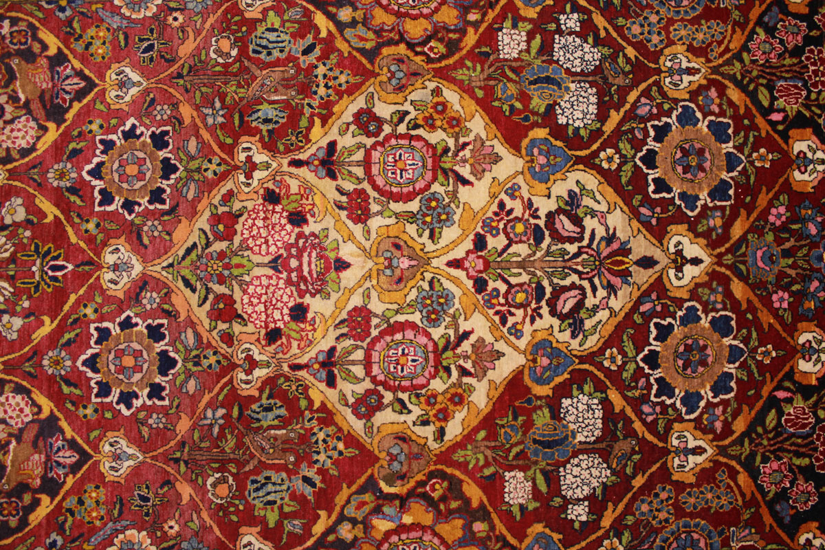 Besides the legendary cities of central Persia, such as Tehran, Isfahan, Kashan, Yazd, and Kerman, there are many smaller towns scattered throughout this area that also weave carpets of very high quality. Some of these small towns near Tehran are Veramin, Tafresh, Boroujerd, Khomaine and Taleghan, and, near Isfahan, are Najafabad, Josheghan, and the village of Maymeh. There are also a few near Kashan that produce fine rugs, such as Yazd and Ardekan. Kashan and Isfahan, being among the pioneers from the 16th century, have had enormous influence on their surroundings. Najafabad produces the designs of Isfahan, and Yazd and Ardekan the famous designs of Kashan, almost indistinguishably. An expert weaver in one of these cities will work non-stop on a carpet for many years. The famous asymmetrical Persian knot is generally the one used. The materials can be all wool, all silk or a mixture of the two. The foundation is usually cotton, except in very fine pieces, where it can be pure silk. Although rugs produced in the major cities of this region are technically superior to the ones produced on the outskirts, these pieces from the smaller towns of central Persia are still among the best. Many carpets from this area have been known to last several hundreds of years