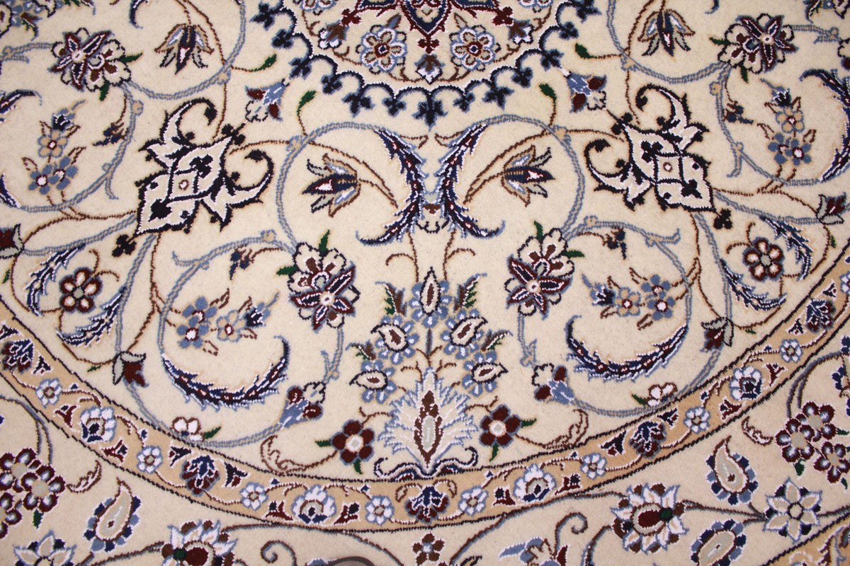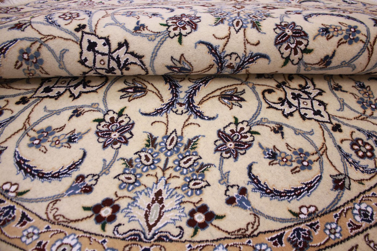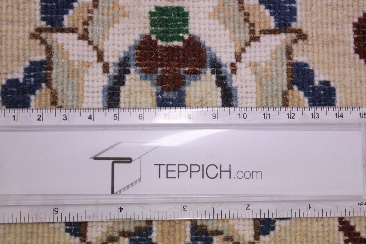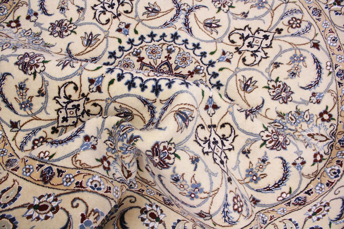 Its talented master weavers may take several years to complete a carpet. Though very similar in appearance to Isfahans, they are easily identifiable because of their distinctive color scheme and smooth, closely clipped pile. Nain carpets usually feature an overall arabesque and curvilinear floral pattern of blues against a warm beige or ivory background, with touches of greens and whites. Over 300 to 500 knots per square inch are not uncommon in Nains. Excellent grades of wool and silk are used on foundations of fine cotton or silk.