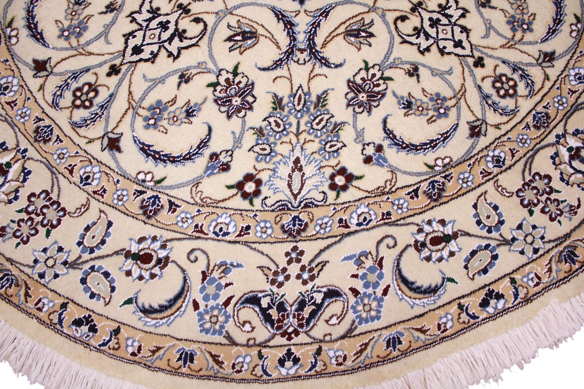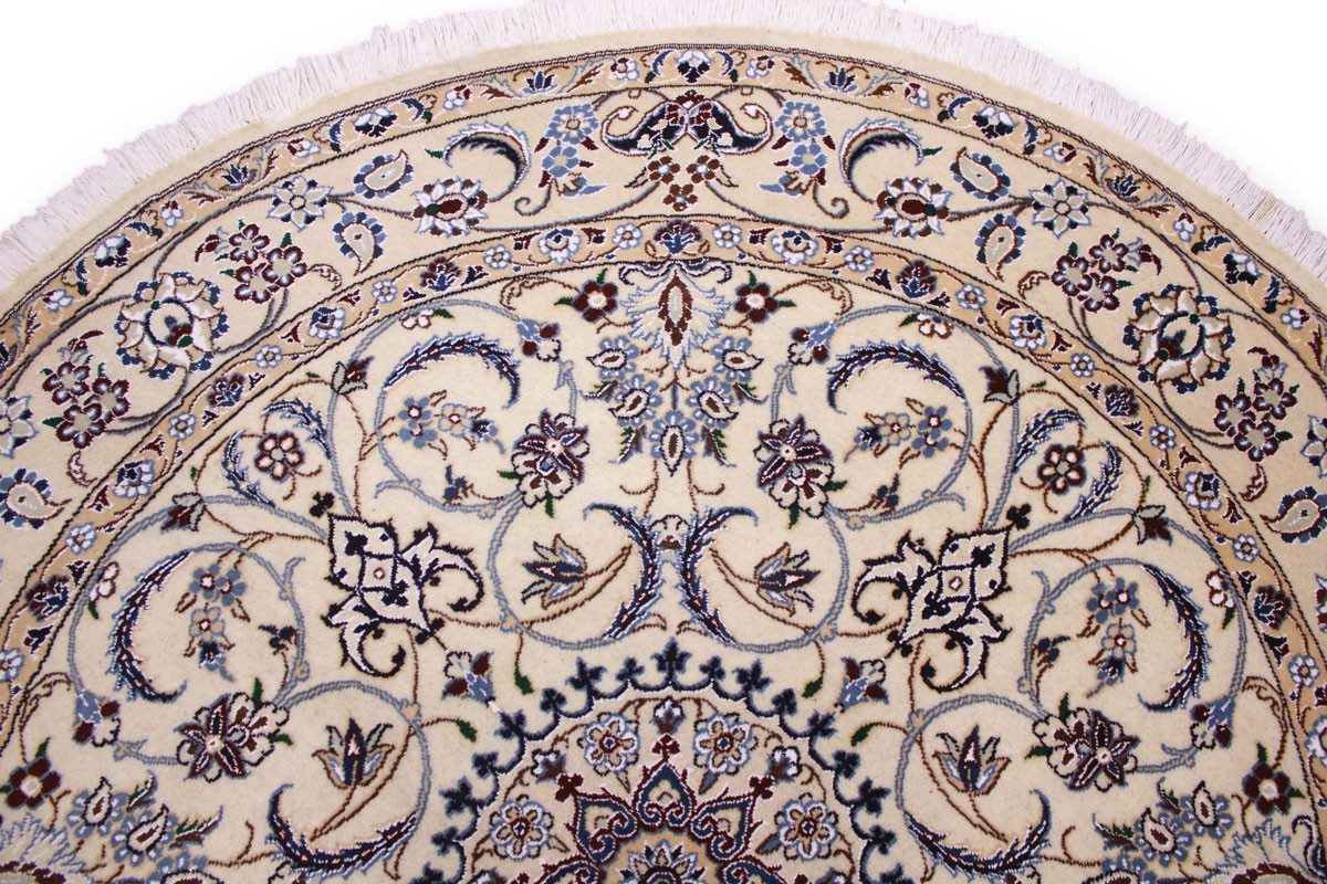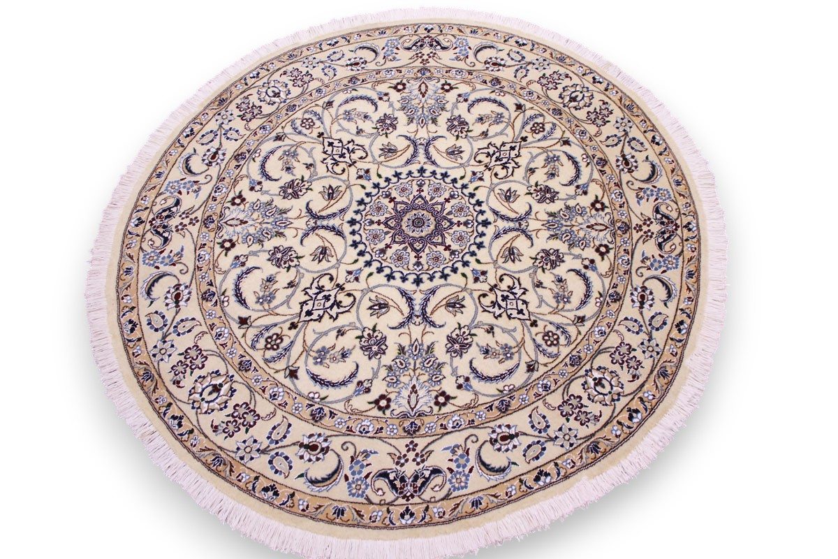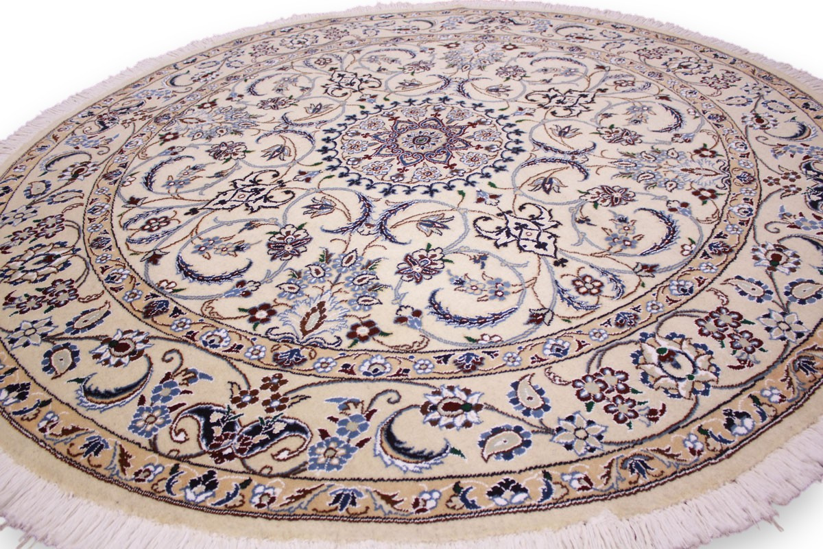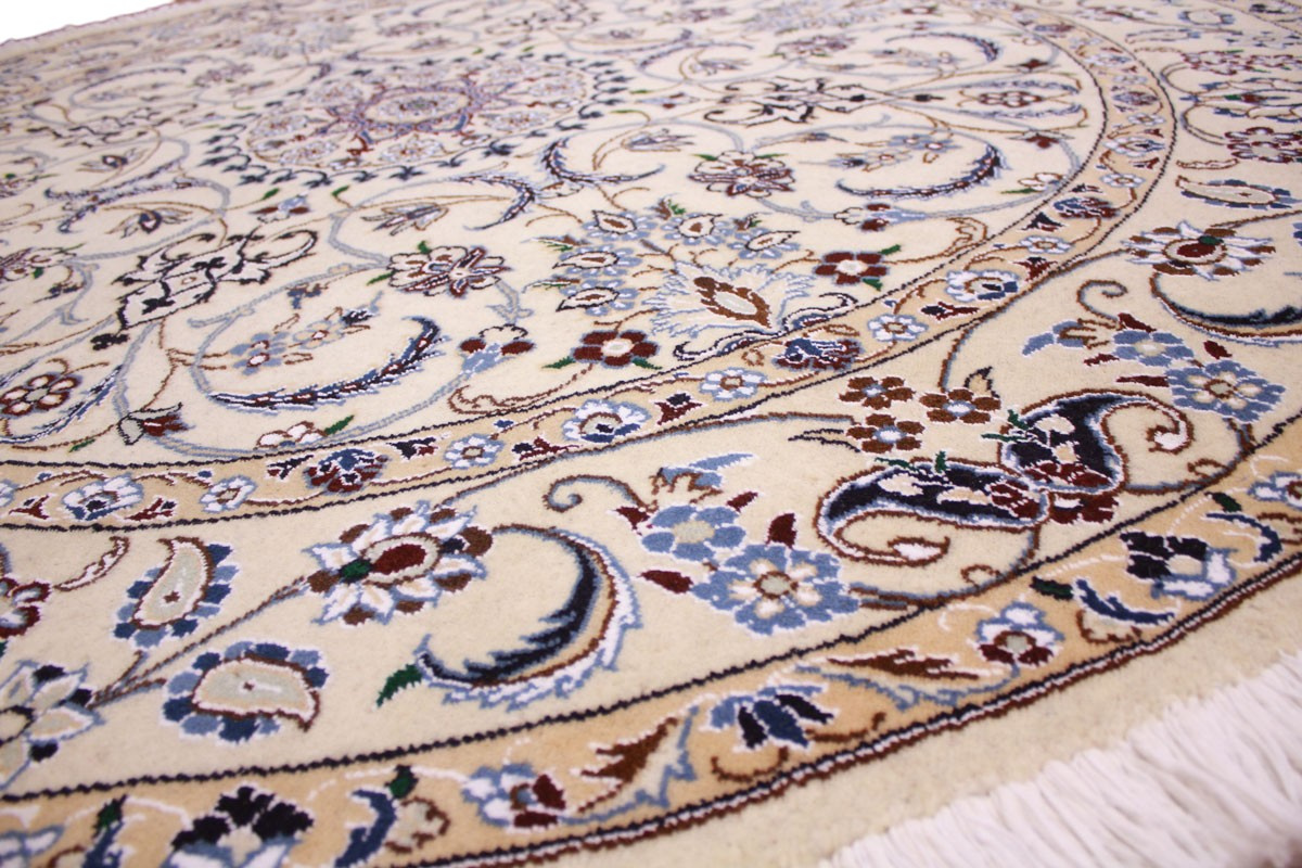 Its talented master weavers may take several years to complete a carpet. Though very similar in appearance to Isfahans, they are easily identifiable because of their distinctive color scheme and smooth, closely clipped pile. Nain carpets usually feature an overall arabesque and curvilinear floral pattern of blues against a warm beige or ivory background, with touches of greens and whites. Over 300 to 500 knots per square inch are not uncommon in Nains. Excellent grades of wool and silk are used on foundations of fine cotton or silk.