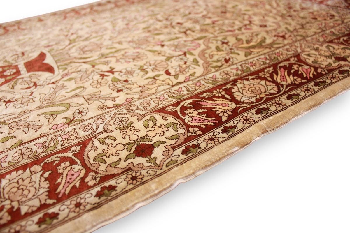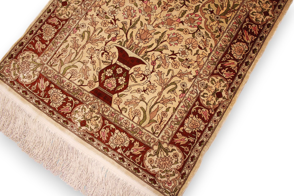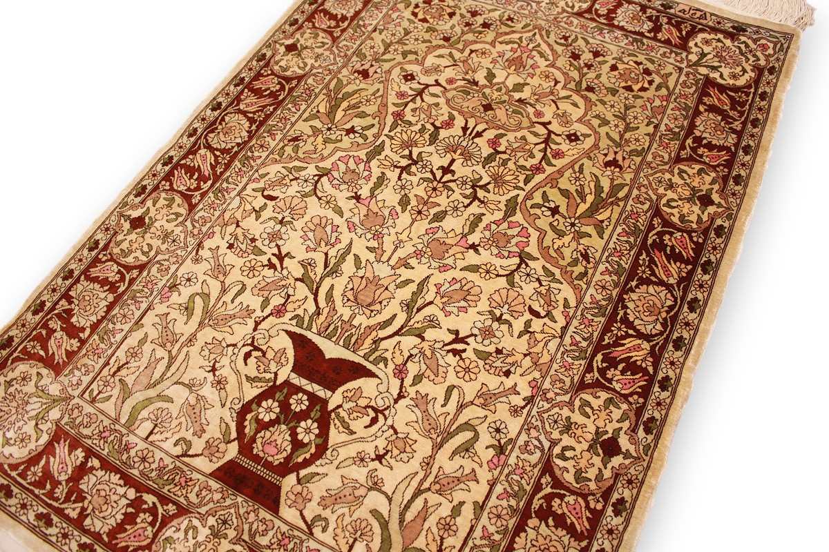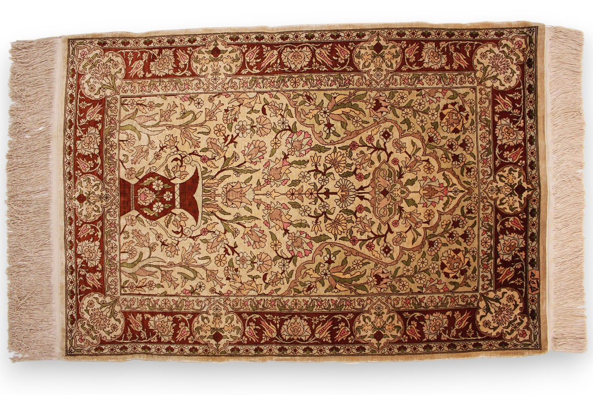Hereke carpets are hand knotted very carefully in Turkey. They consist mostly of pure silk and can reach a knot density of up to 5 million knots / square meter. Hereke carpets are very valuable and decorative. They are generally knotted in smaller sizes and used as wall carpet.