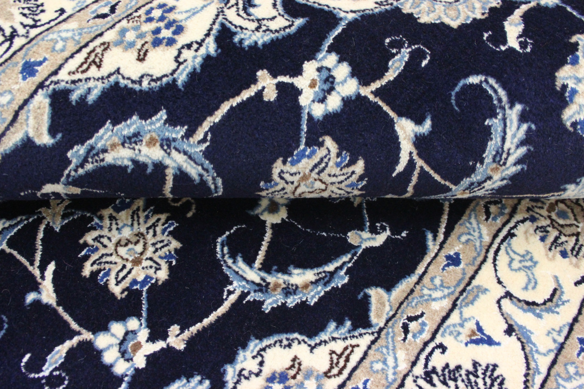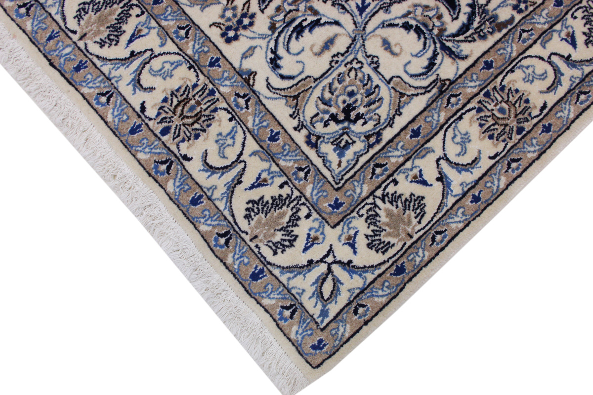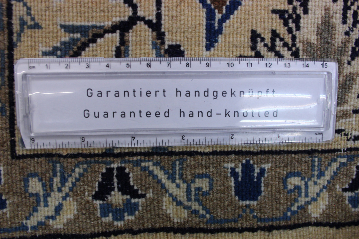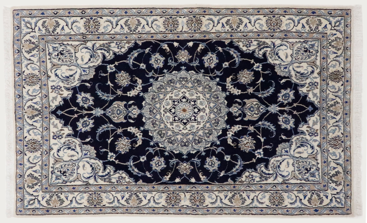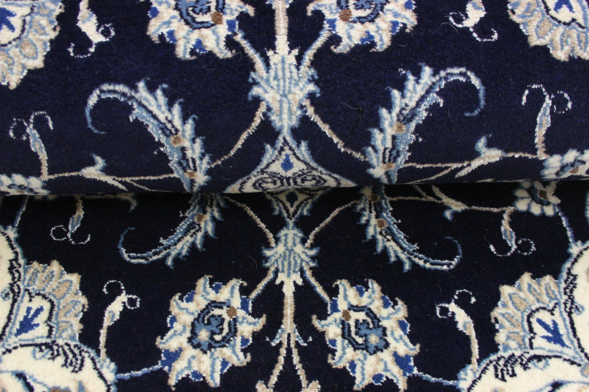 Its talented master weavers may take several years to complete a carpet. Though very similar in appearance to Isfahans, they are easily identifiable because of their distinctive color scheme and smooth, closely clipped pile. Nain carpets usually feature an overall arabesque and curvilinear floral pattern of blues against a warm beige or ivory background, with touches of greens and whites. Over 300 to 500 knots per square inch are not uncommon in Nains. Excellent grades of wool and silk are used on foundations of fine cotton or silk.