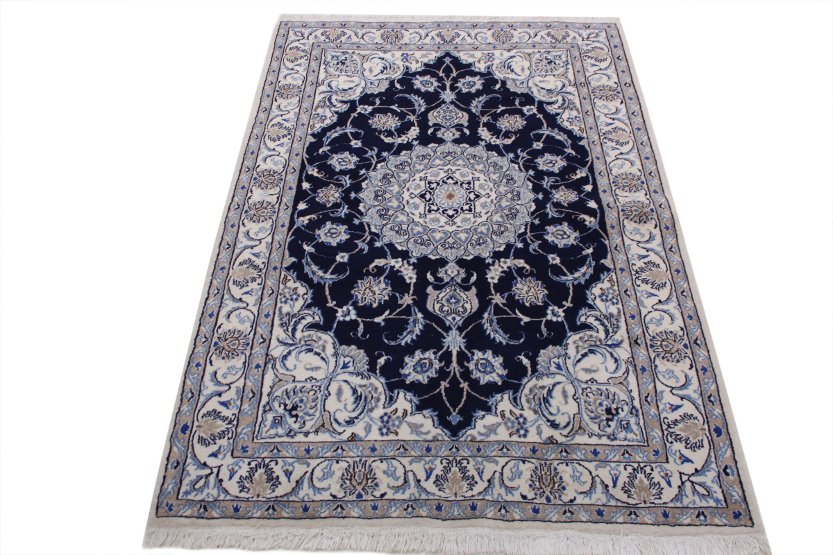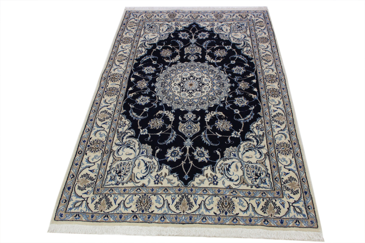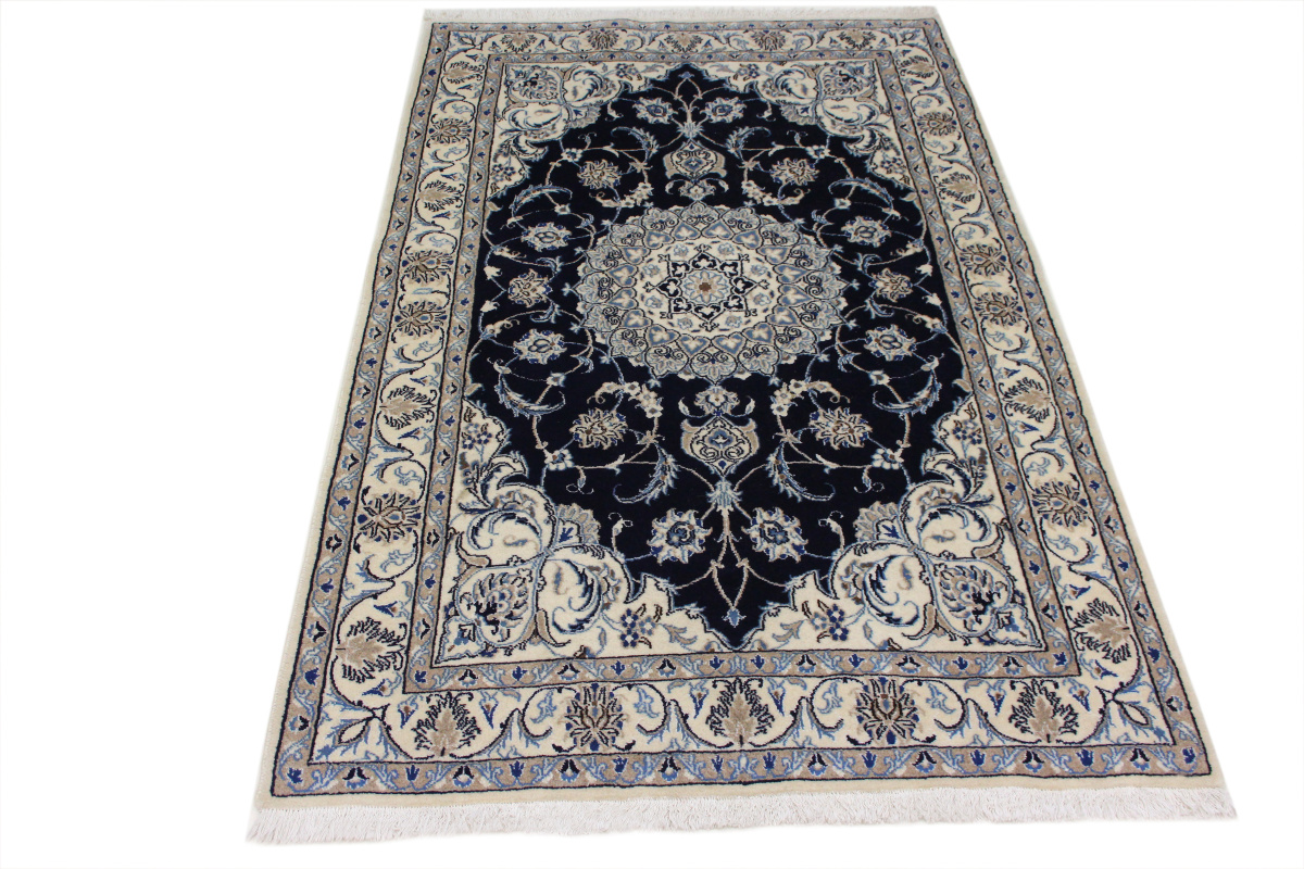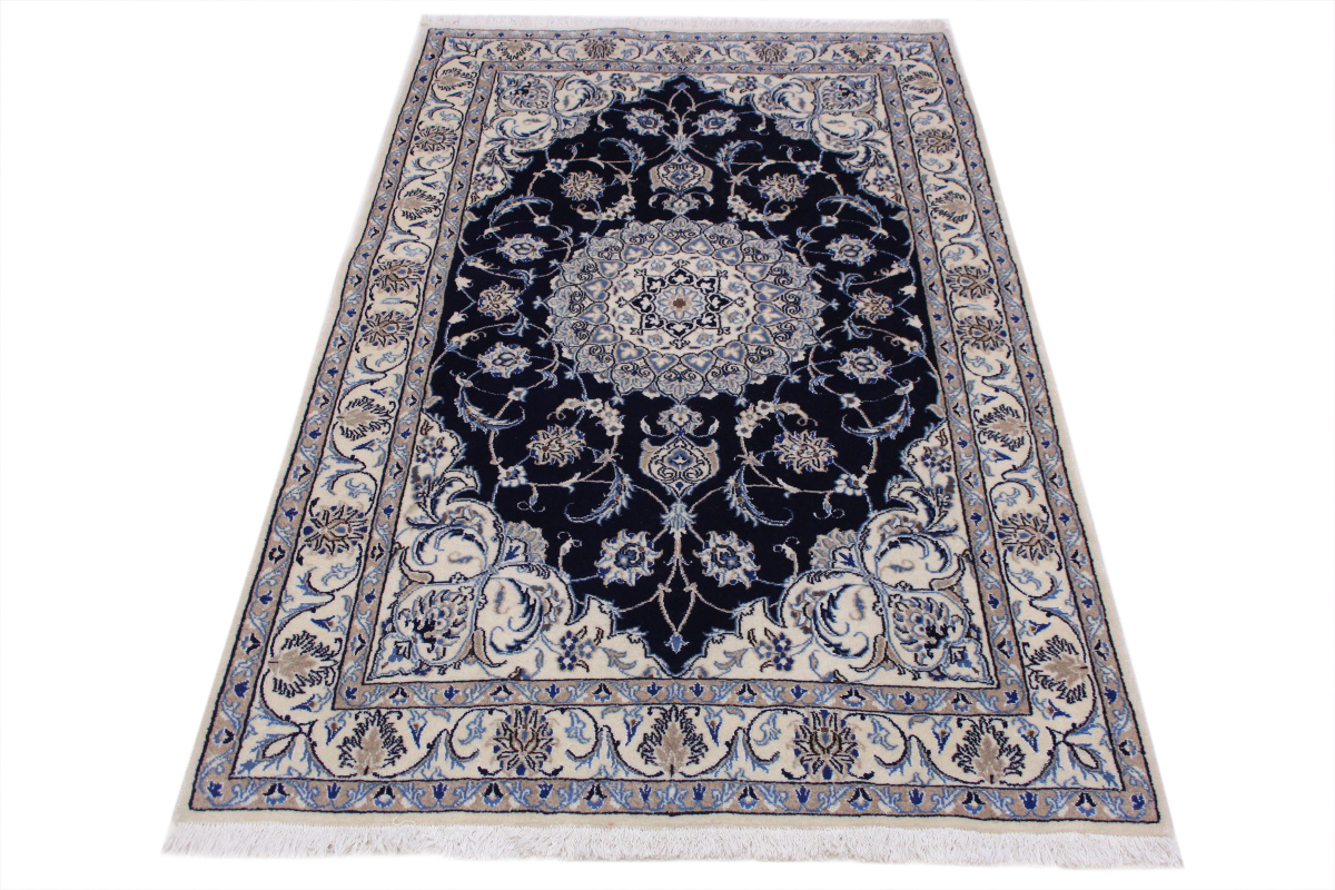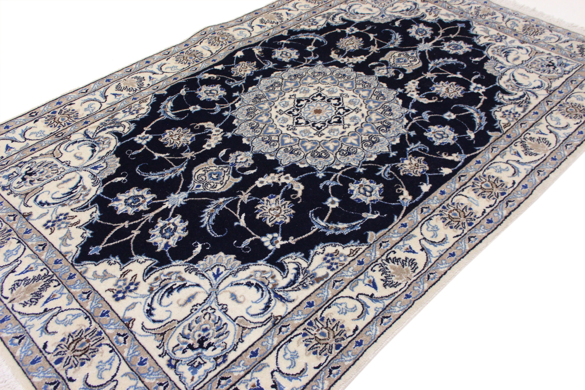 Its talented master weavers may take several years to complete a carpet. Though very similar in appearance to Isfahans, they are easily identifiable because of their distinctive color scheme and smooth, closely clipped pile. Nain carpets usually feature an overall arabesque and curvilinear floral pattern of blues against a warm beige or ivory background, with touches of greens and whites. Over 300 to 500 knots per square inch are not uncommon in Nains. Excellent grades of wool and silk are used on foundations of fine cotton or silk.