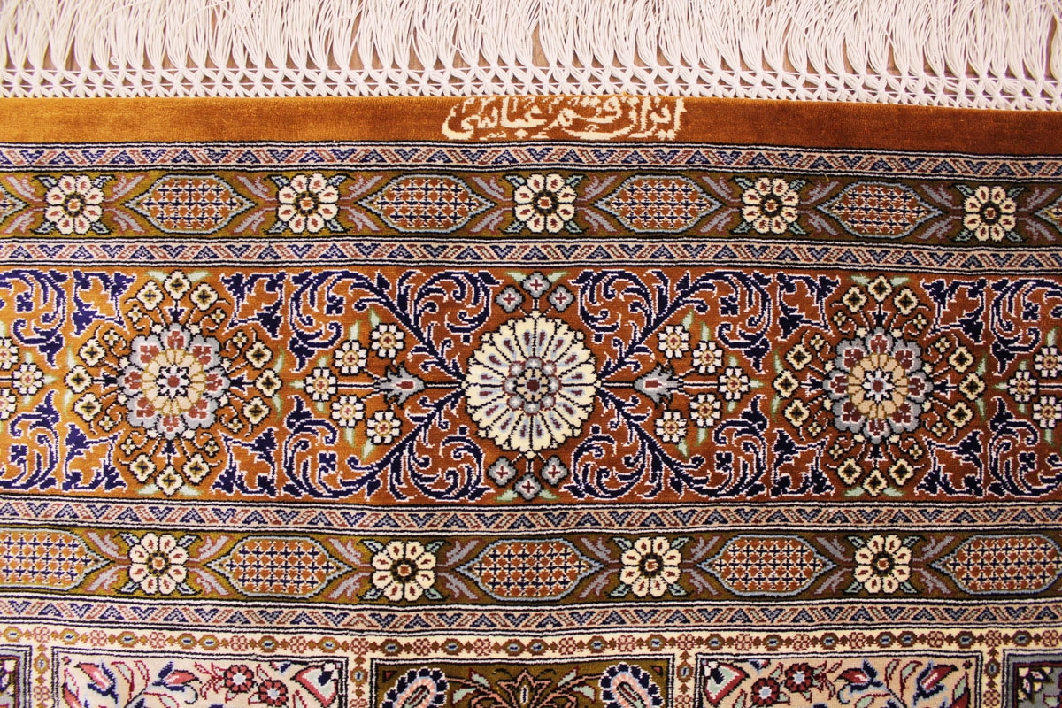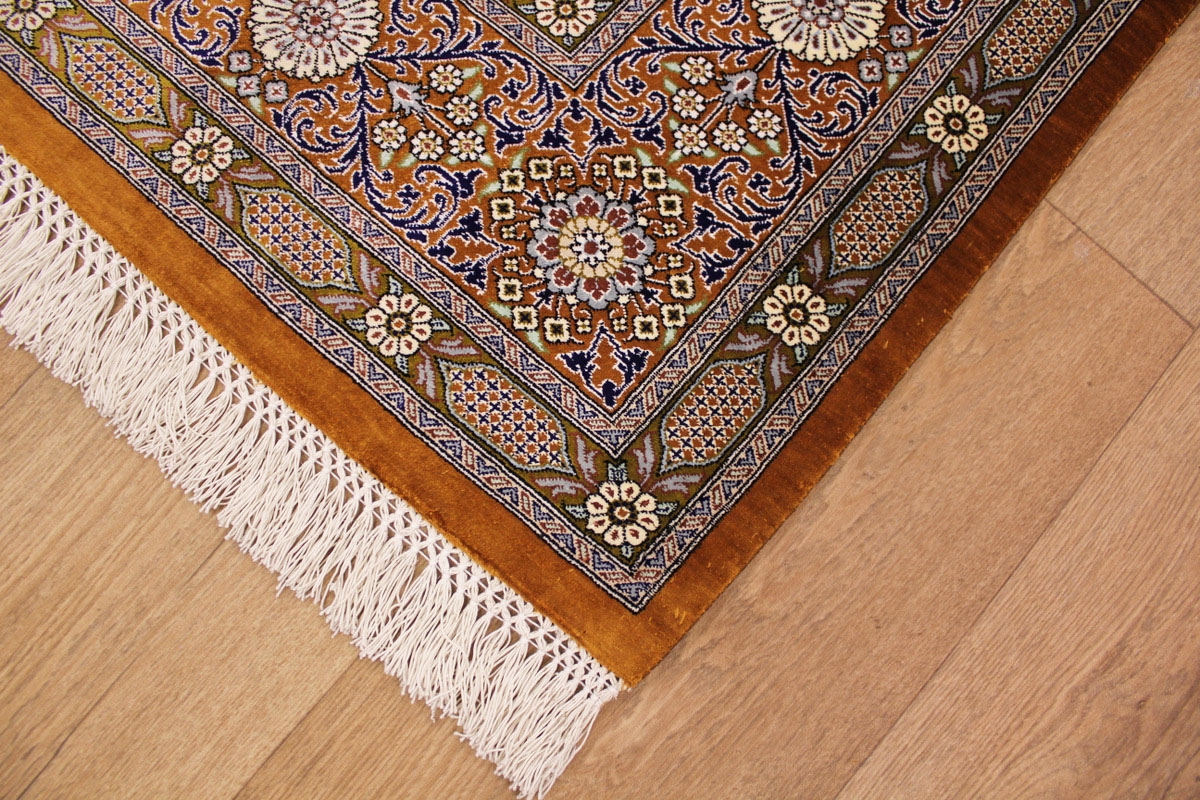 Brilliantly detailed medallions, all-over patterns of the greatest intricacy, and breath-taking pictorials and hunting scenes, attest to the craftsmanship of Persia's finest master-weavers. Some pieces of fine wool are also made there. Although signatures are found on fine rugs made elsewhere, the weavers of Qom take such enormous pride in their product that they almost always weave their signatures into a small part of the carpet´s border. Many shapes and sizes are produced, including squares, rectangles, oval or round, and the sizes may vary from a very small rug to a carpet which would suit the grand salon of a palace. The materials used can be wool, silk, or any combination of the two.