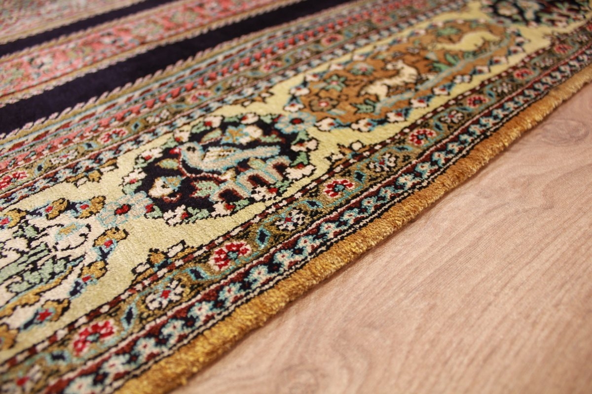 Qom (Qum / Ghom) carpets are among the finest in the world. Although it does not boast a long and ancient history, Qom, south of Tehran, creates exceptional works of art, frequently entirely in pure silk. The carpet industry of this city is incredibly modern, producing quality which is extraordinary. Prices tend to be very high, reflecting super quality of materials, design and execution . Syles and patterns vary tremendously, as this city usually recreates ancient historical patterns from many other noble sources. Most respected are hunting scenes or other pictorials, not to mention the brilliant medallions and borders of unbelievable finesse.1