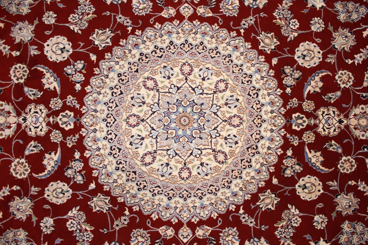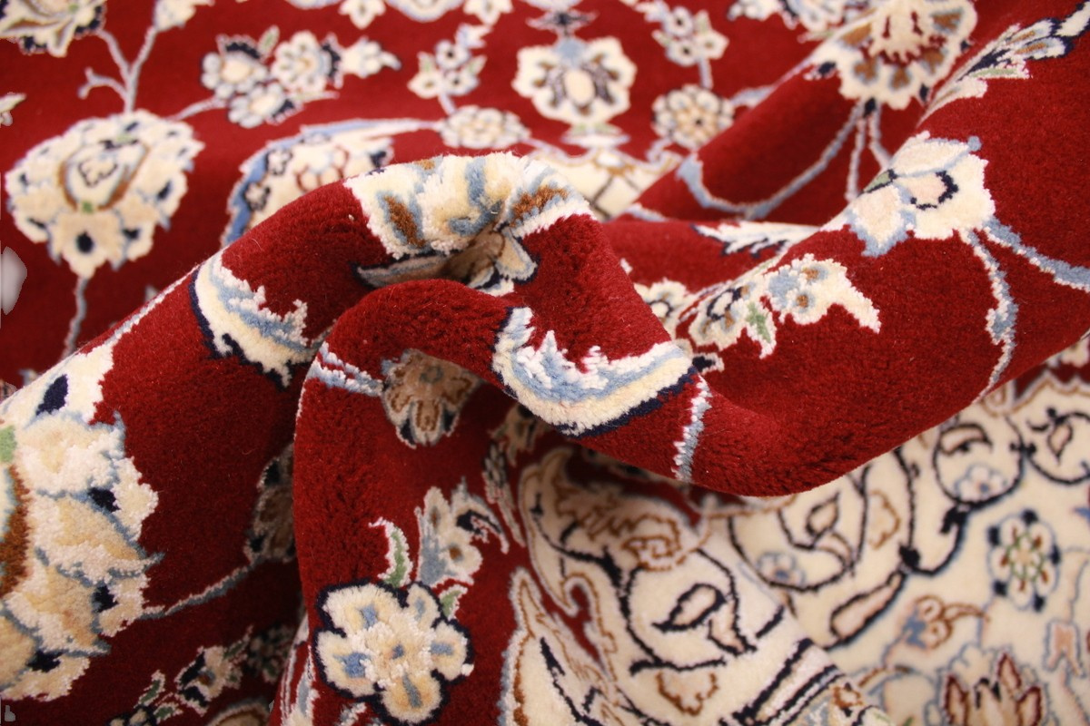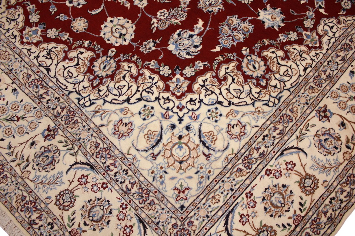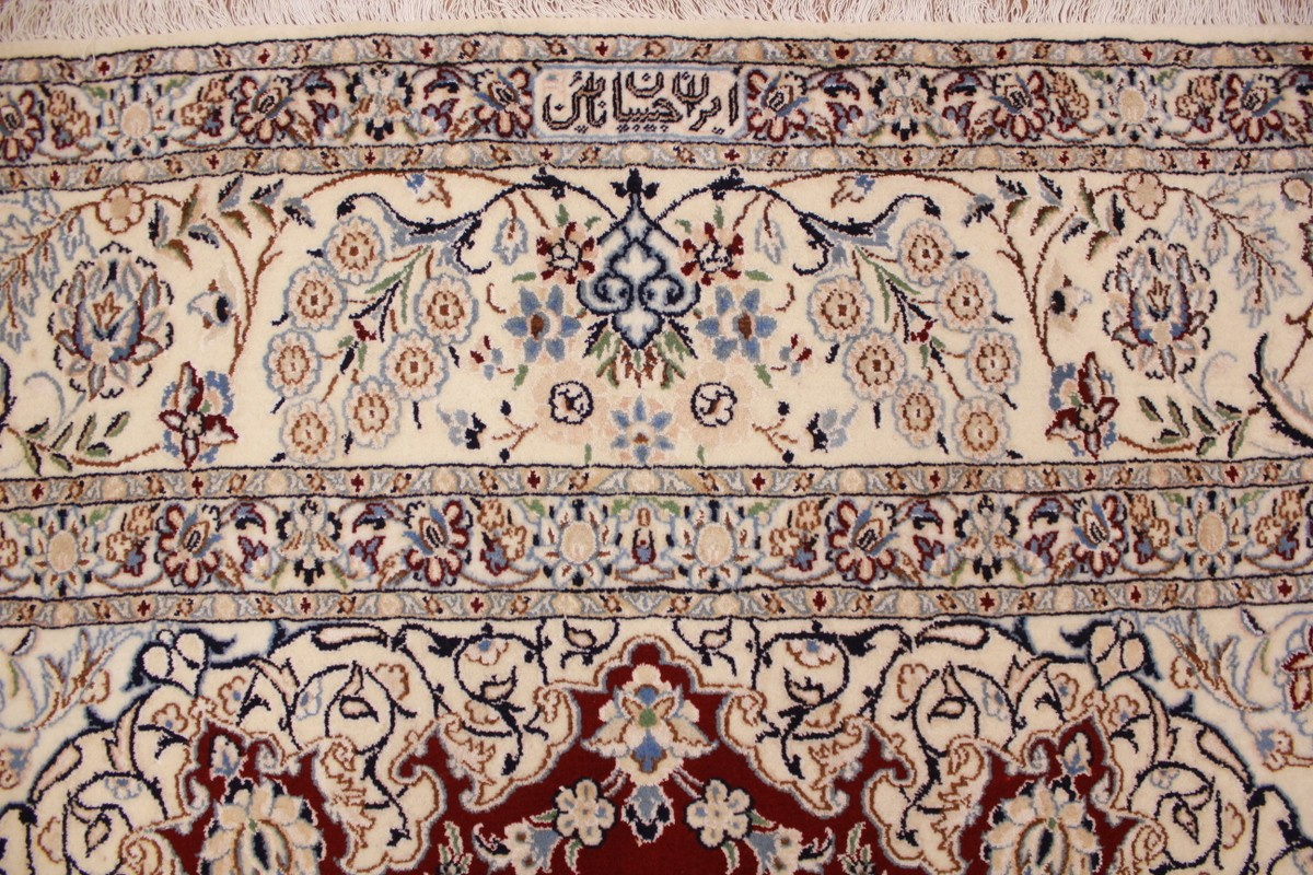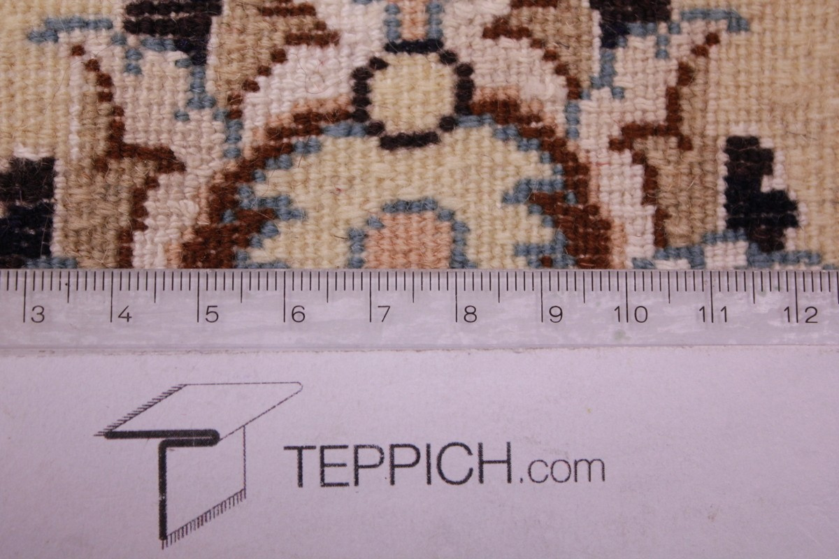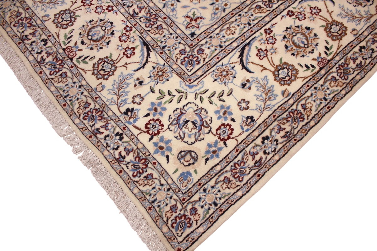 Its talented master weavers may take several years to complete a carpet. Though very similar in appearance to Isfahans, they are easily identifiable because of their distinctive color scheme and smooth, closely clipped pile. Nain carpets usually feature an overall arabesque and curvilinear floral pattern of blues against a warm beige or ivory background, with touches of greens and whites. Over 300 to 500 knots per square inch are not uncommon in Nains. Excellent grades of wool and silk are used on foundations of fine cotton or silk.