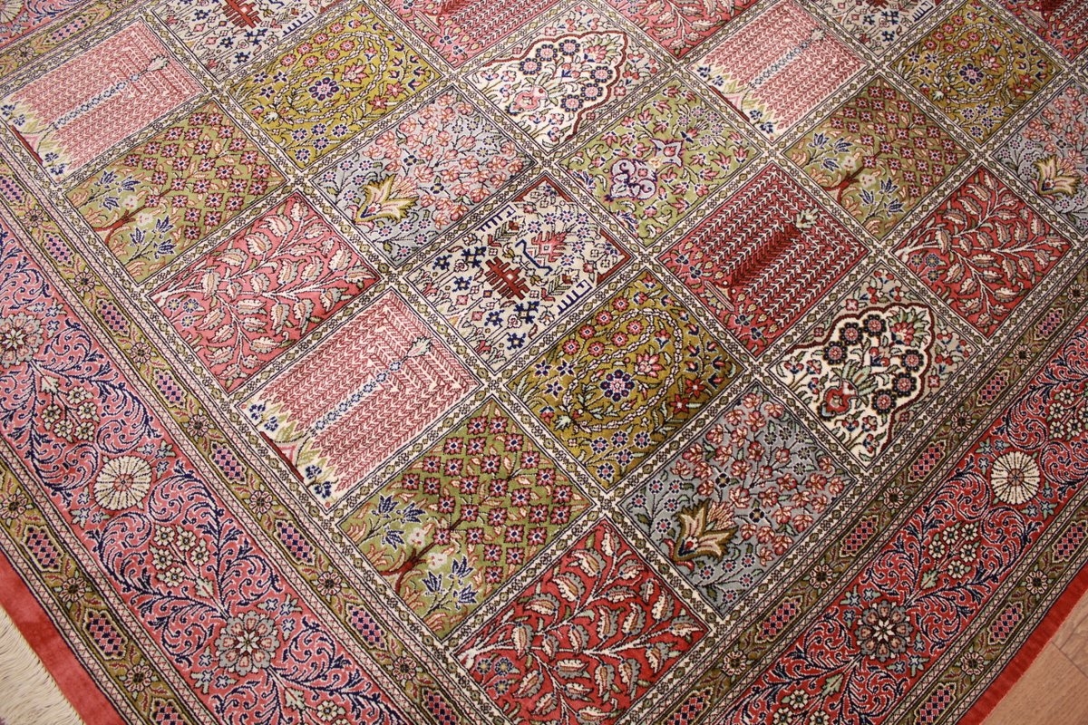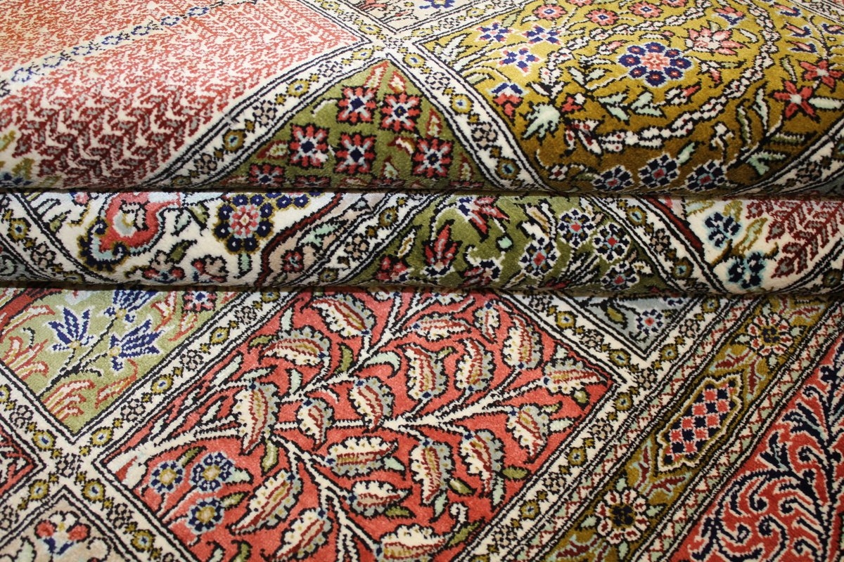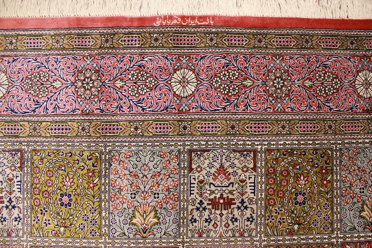 Brilliantly detailed medallions, all-over patterns of the greatest intricacy, and breath-taking pictorials and hunting scenes, attest to the craftsmanship of Persia's finest master-weavers. Some pieces of fine wool are also made there. Although signatures are found on fine rugs made elsewhere, the weavers of Qom take such enormous pride in their product that they almost always weave their signatures into a small part of the carpet´s border. Many shapes and sizes are produced, including squares, rectangles, oval or round, and the sizes may vary from a very small rug to a carpet which would suit the grand salon of a palace. The materials used can be wool, silk, or any combination of the two.
