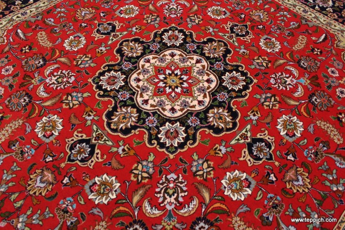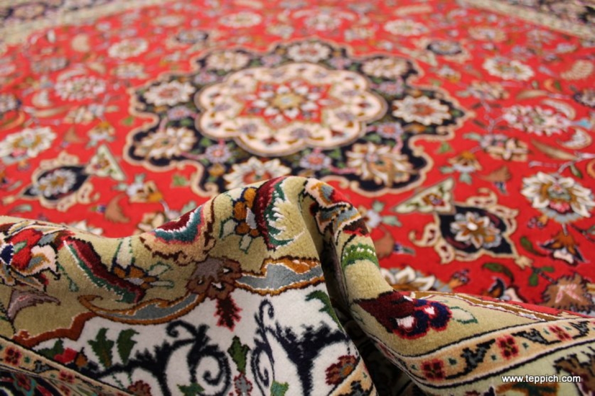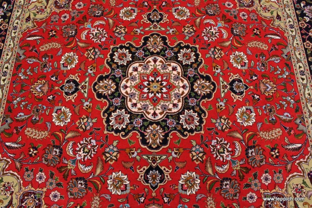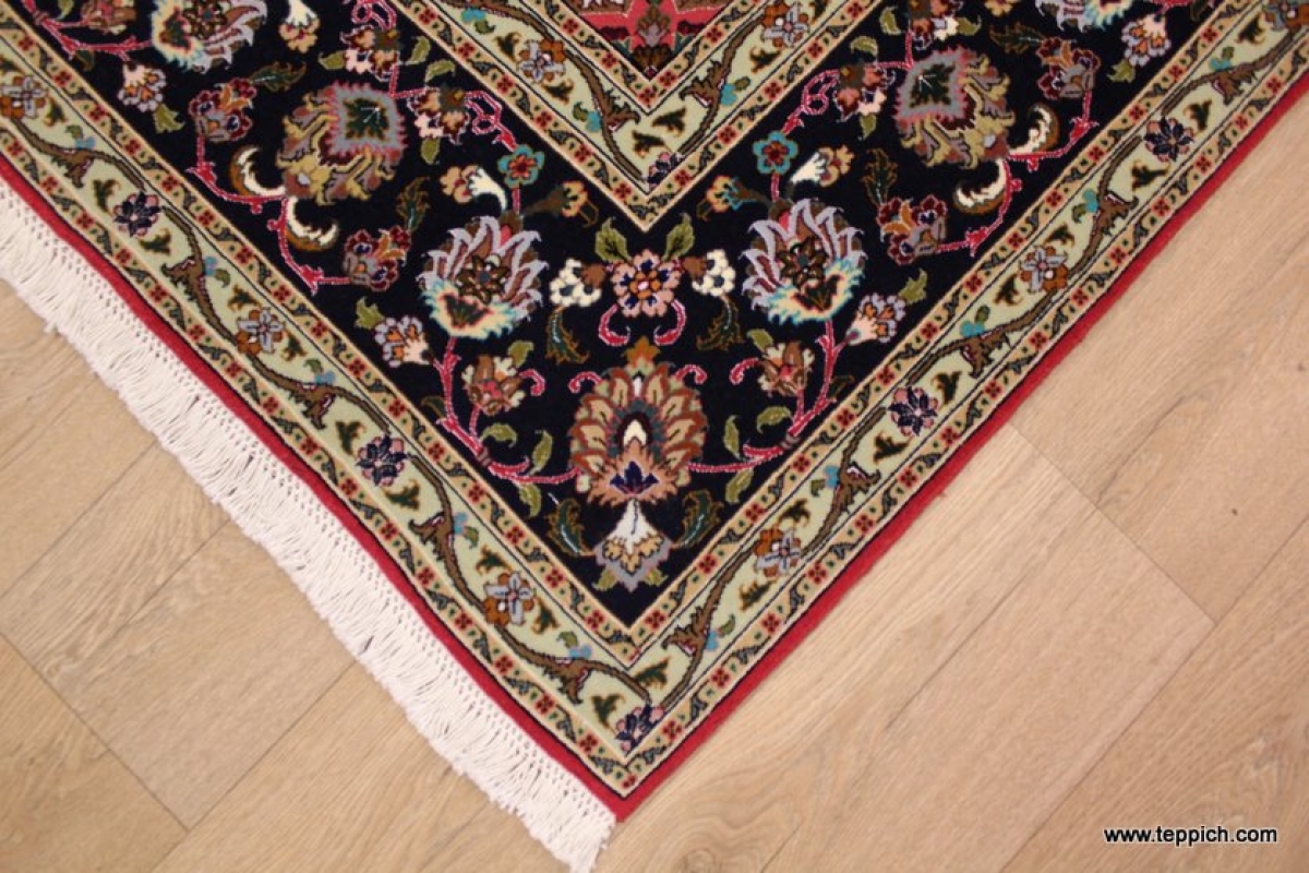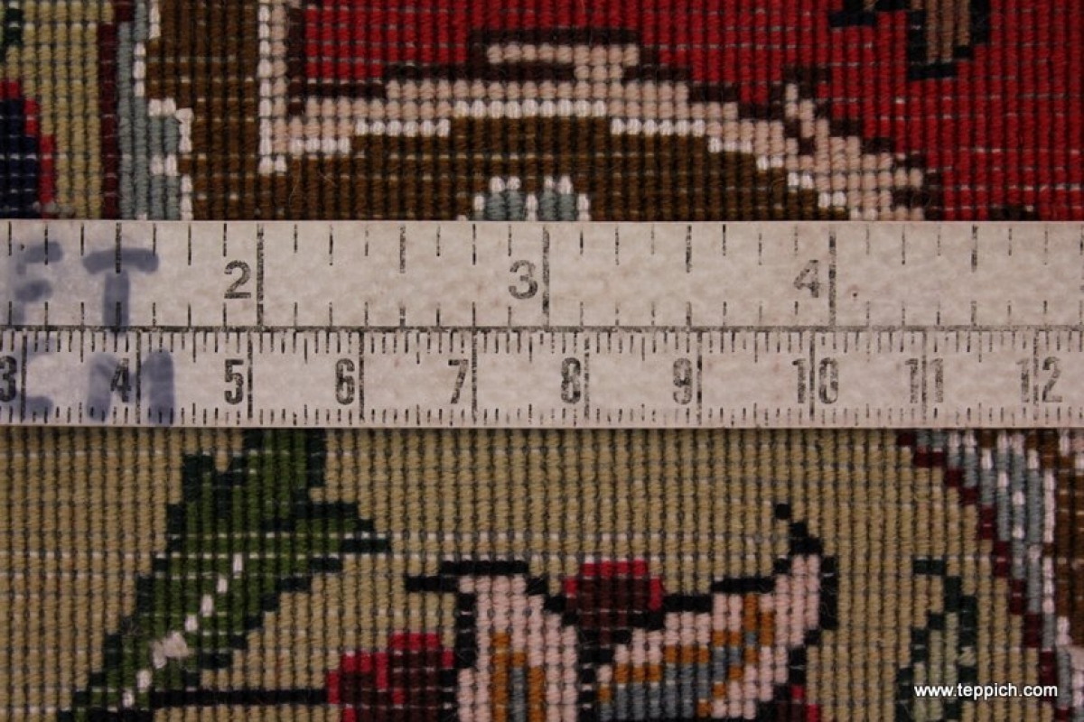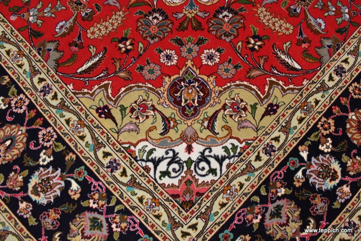 Taabriz is probably the most prolific carpet-producing center in the world, and certainly one of the oldest. This enchanted city was established more than a thousand years ago. After many invasions, occupations and wars, Taabriz took the ancient techniques of the past and created a huge rug-exporting industry. The finest era of Persian rug weaving was the Safavid Dynasty (1499 - 1722), when the Safavids overthrew the Turks who had occupied Taabriz. They gave the city one of the first Royal workshops, making it the artistic center of Persian culture. In spite of all the later conquests and political restructurings, Taabriz managed to keep these ancient traditions alive. Today, many rugs produced in Taabriz emulate the artististic heritage of the Persian Safavid carpet, and when a designer in any part of the world wants to commission a certain pattern to be hand-woven, Taabriz is the city that he visits. Attesting to their pride in producing fine carpets, the master-weavers of Taabriz often weave their signature into a part of the carpet's border. These signatures can, of course, be found on extremely fine rugs made in other cities, but a signature on the 'ceremonial' border of a Taabriz Naqsheh is the ultimate in formality and sophistication. The material used for the pile of these rugs are wool, silk, or a combination of the two. A beautiful blend of fine Kurk wool and silk is the most common in a fine Taabriz, with wool only used in those of average quality. In the very finest carpets, the foundation of the rug is pure silk instead of cotton, and some even have 18 or 24 karat gold threads woven into the foundation, with 300 to 800 KPSI not being uncommon.